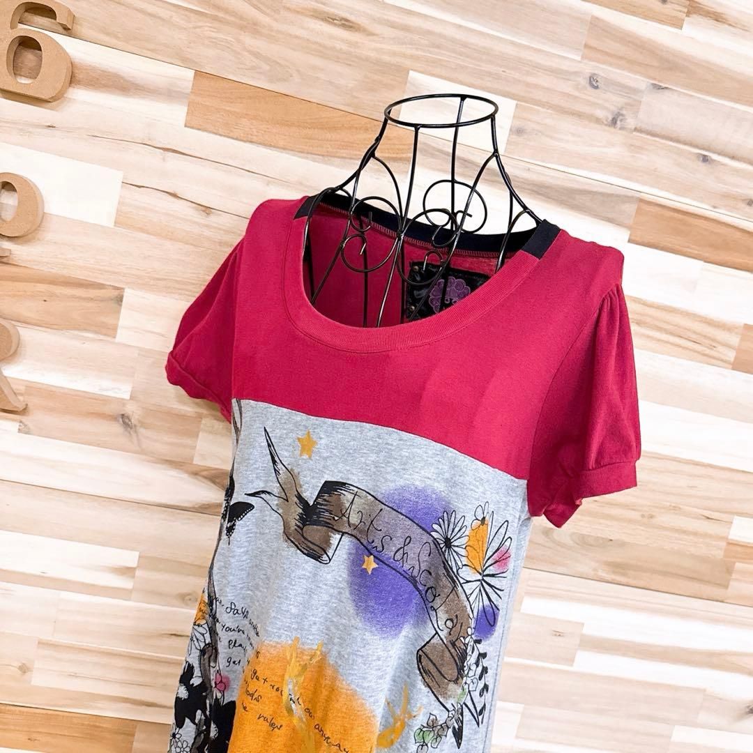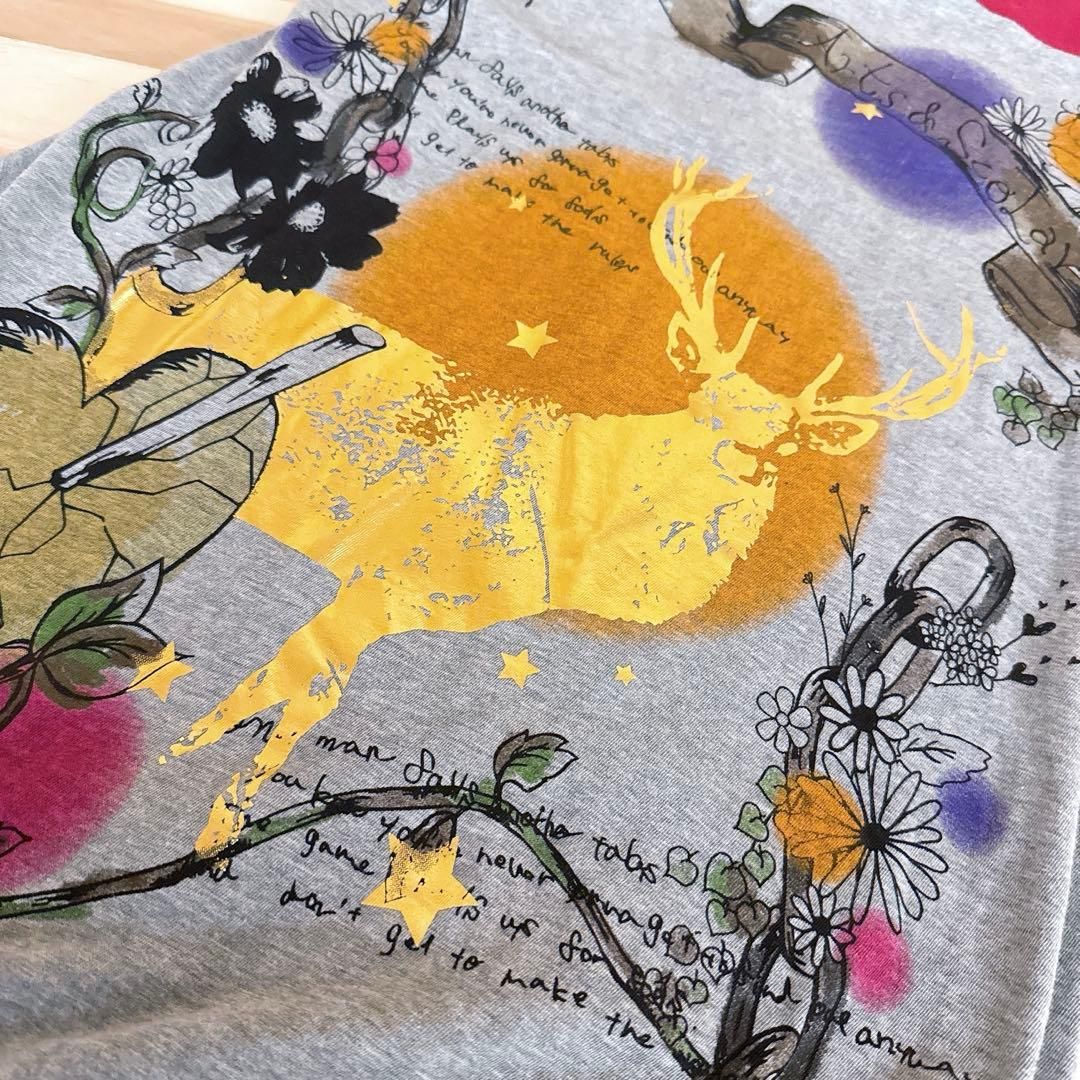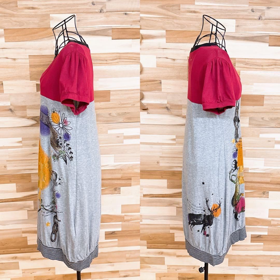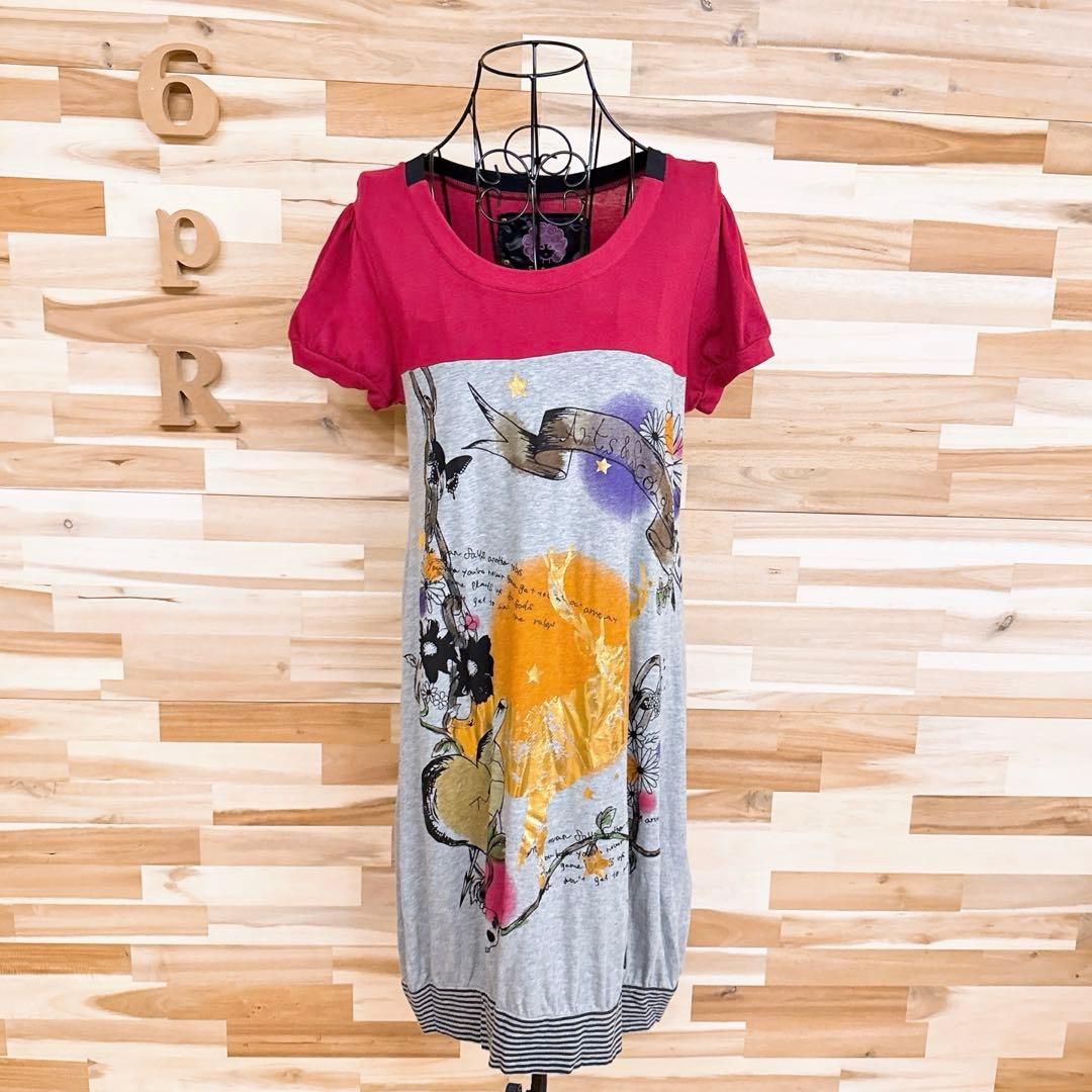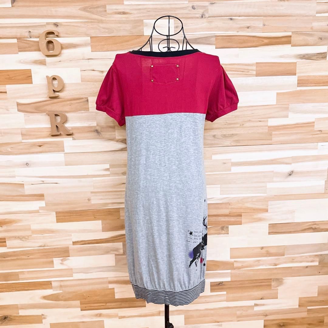 やや薄手の柔らかい肌触り。バーガンディの上身頃とライトグレーのボディが絶妙なコントラスト。艶感あるゴールドの鹿プリントや、カラフルなペイント風モチーフが印象的で、裾のボーダー切替がさりげないアクセントに。シンプルなボトムとの相性も良く、デイリーに気分を上げてくれるScoLarのワンピースです。