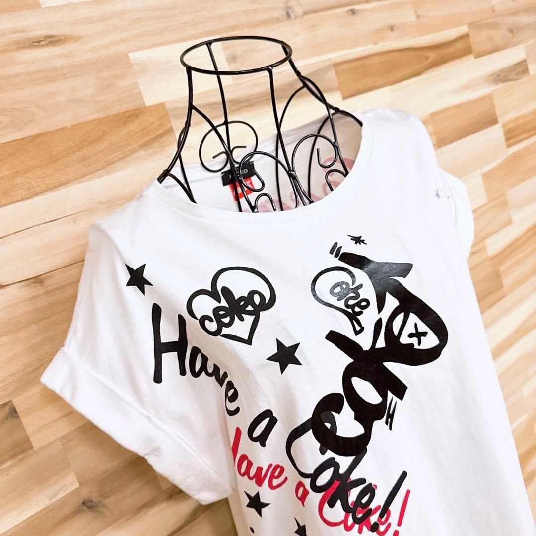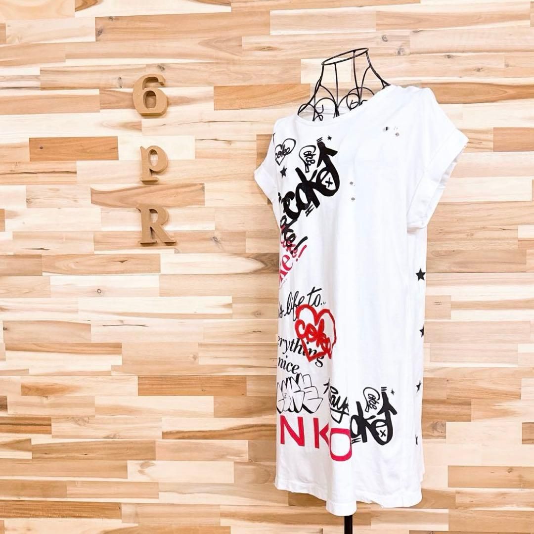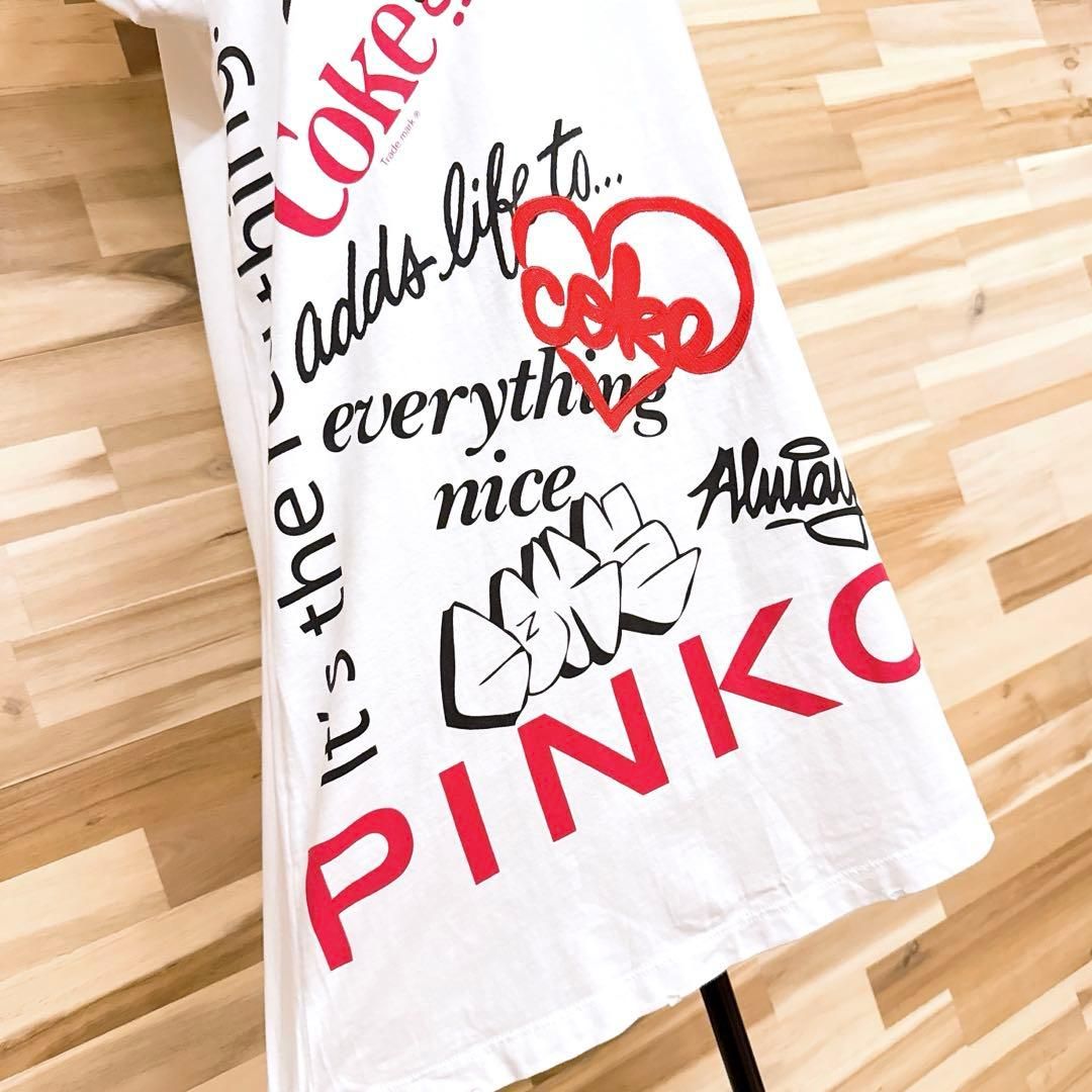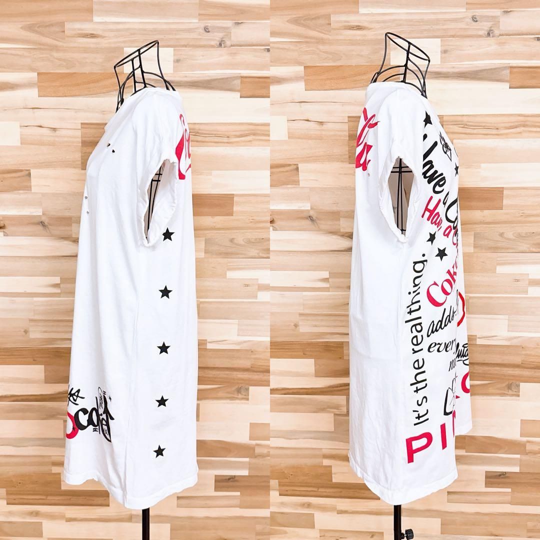 * 刺繍×プリント / ビンテージ *やや薄手の柔らかな白地に、赤と黒のブランドロゴのグラフィックを大胆に重ねた立体的なデザイン。ところどころの穴あきがラフな味わいを生み、ゆったりとしたシルエットが抜け感のあるスタイルを演出してくれるPINKO × Coca-Colaコラボのワンピースです。既に完売、生産も終了しており、オークションやフリマでも見ることの少ない、たいへん珍しいお品です。※LGスタイラーにて除菌リフレッシュ・スチームクリーニング済みです。