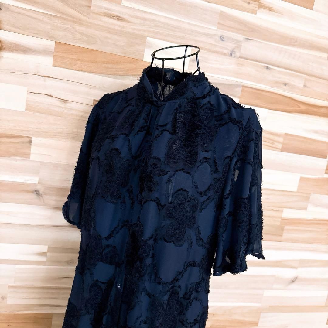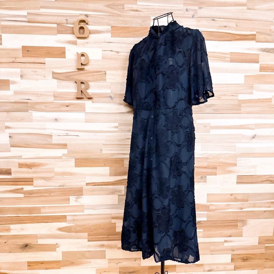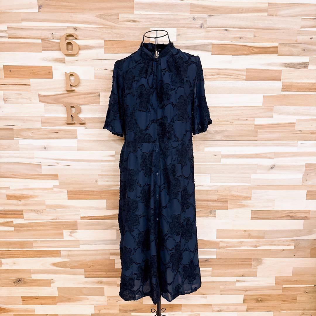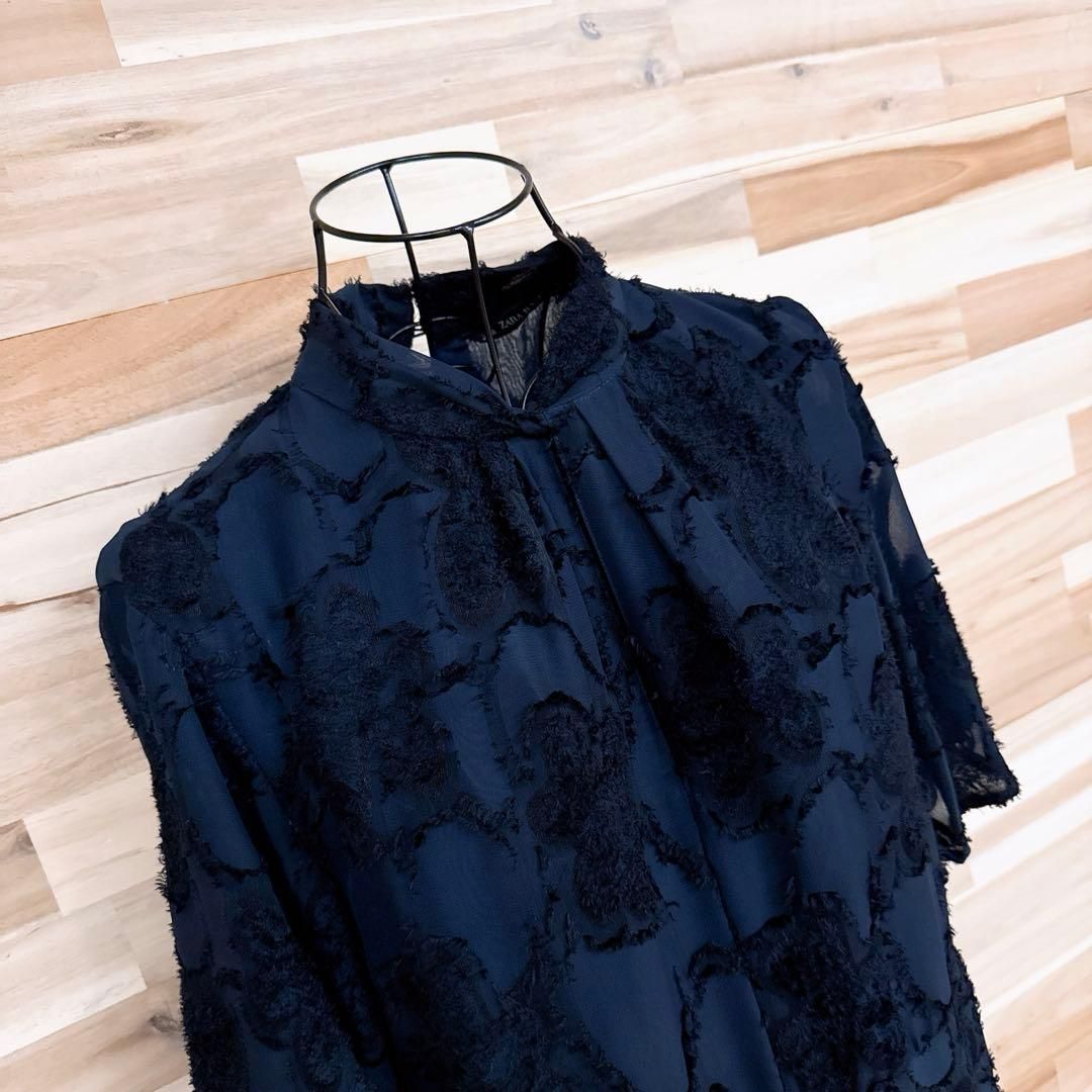 * 花 / フラワー / ひねり襟 *深みのあるネイビーに大ぶりのフラワーモチーフが浮かび上がり、上品さの中にさりげない個性をプラス。ハイネックから流れるすっきりとしたラインとほんのりとした透け感が抜け感を演出し、大人オシャレなZARAのワンピースです。※LGスタイラーにて除菌リフレッシュ・スチームクリーニング済みです。