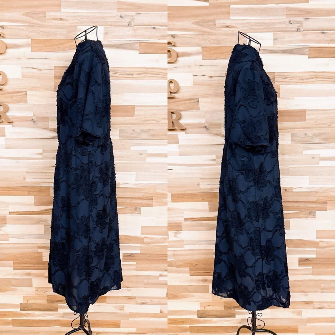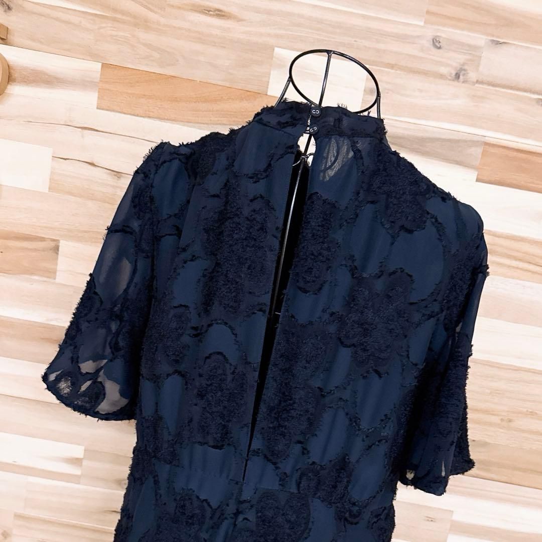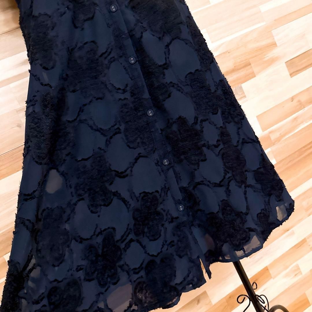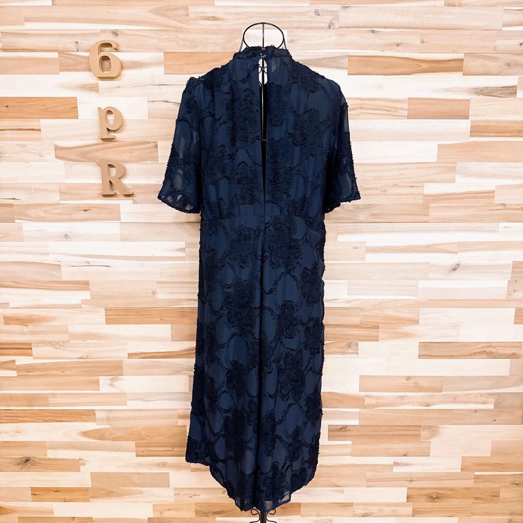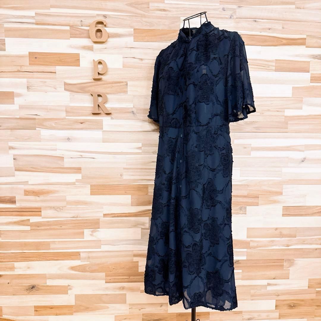 * 花 / フラワー / ひねり襟 *深みのあるネイビーに大ぶりのフラワーモチーフが浮かび上がり、上品さの中にさりげない個性をプラス。ハイネックから流れるすっきりとしたラインとほんのりとした透け感が抜け感を演出し、大人オシャレなZARAのワンピースです。※LGスタイラーにて除菌リフレッシュ・スチームクリーニング済みです。