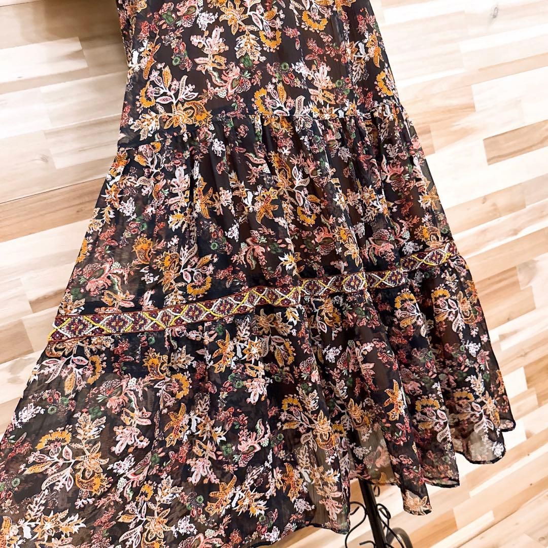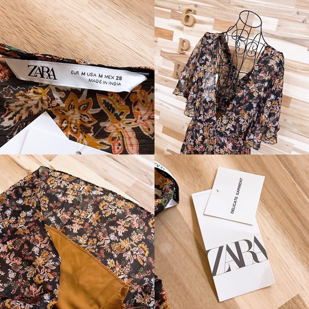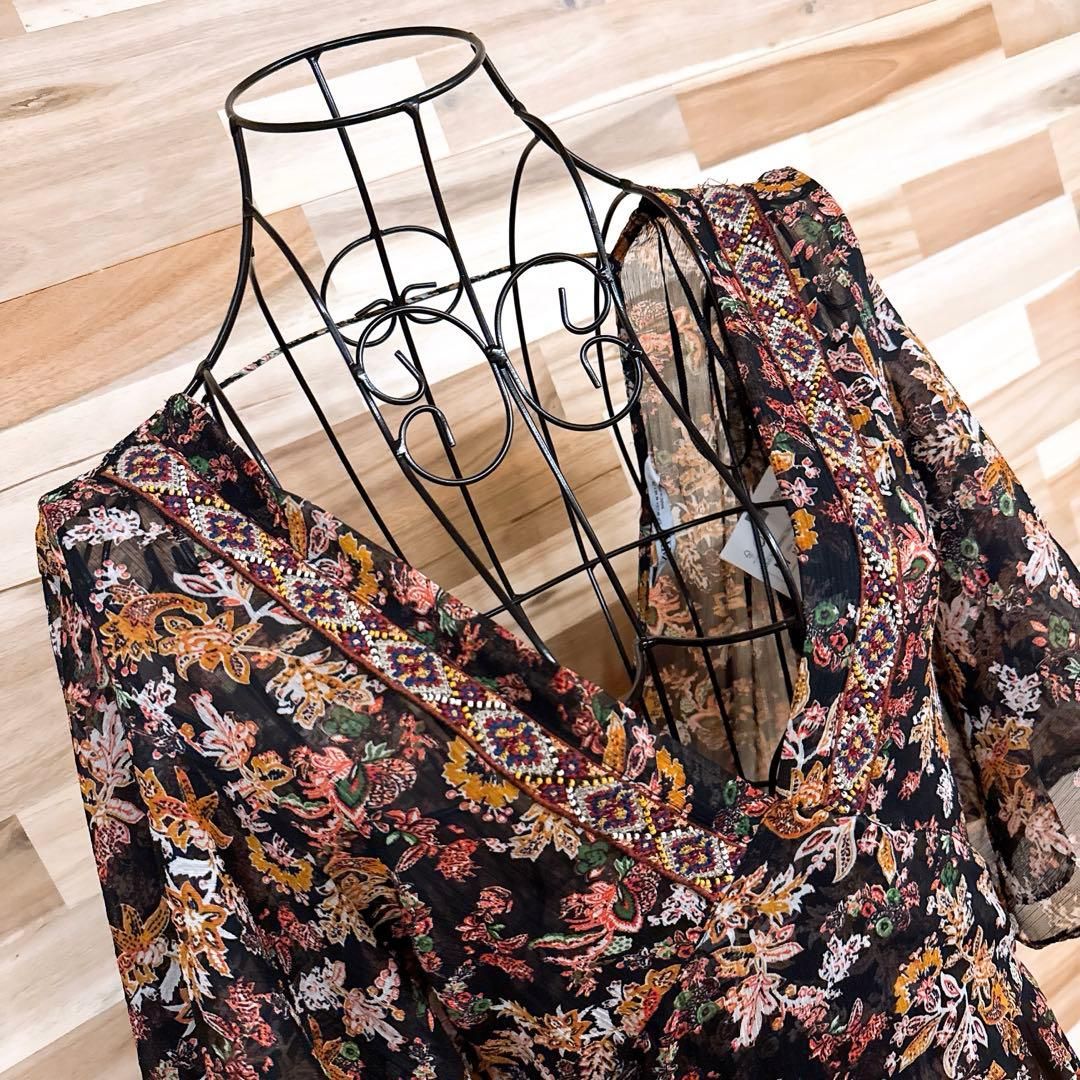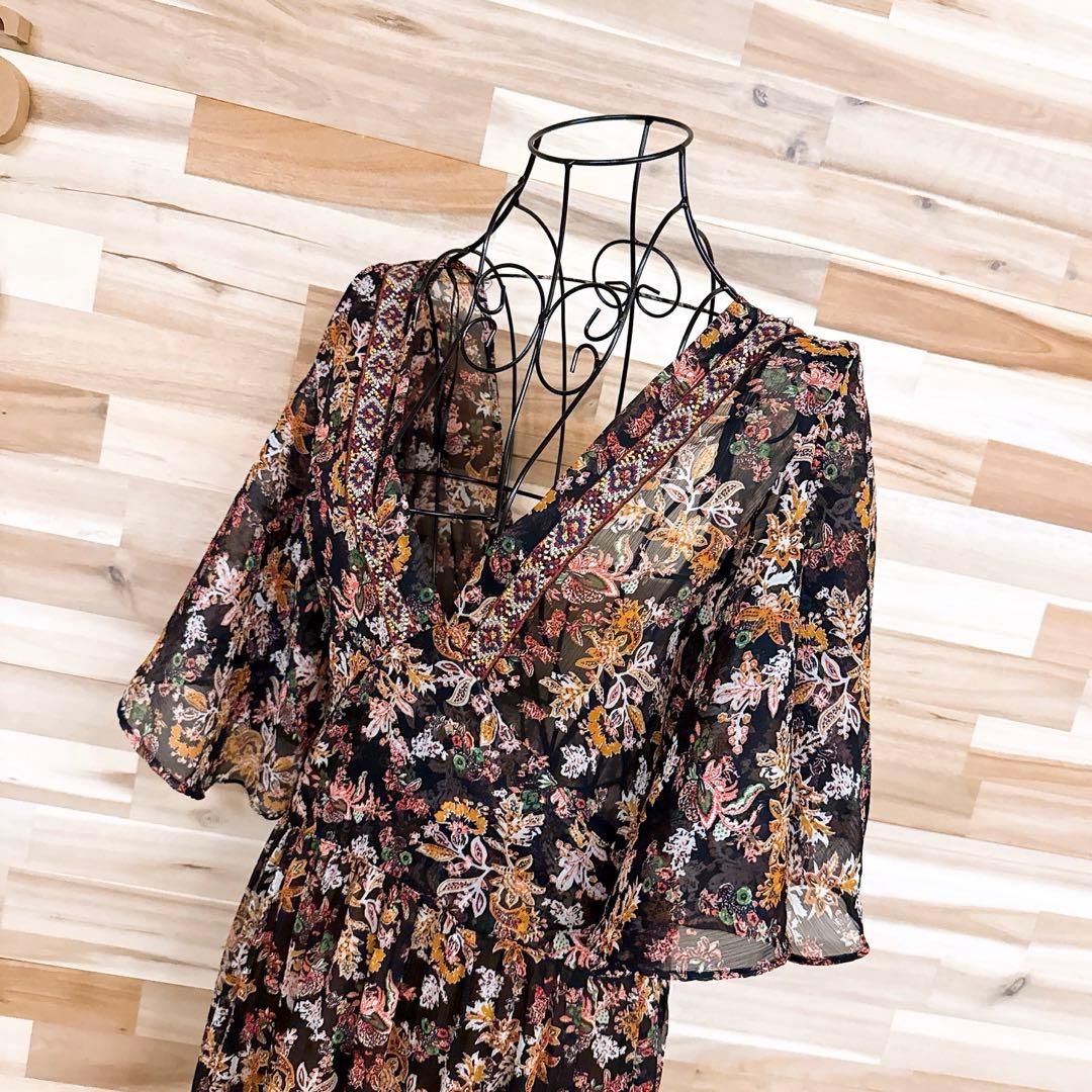* シアー / ビジュー / ビーズ / エスニック / 総柄 *落ち着いた黒地に映えるオレンジや赤みを帯びた花柄があたたかみを添え、透け感のある軽やかな素材が柔らかい肌ざわりの一枚。ゆったりと広がるフレアスリーブと切り替えから広がるロングシルエットに、顔周りをすっきりと見せてくれる深めのVネック、両ウエストのカッティングでさりげない肌見せがスタイルアップ効果も嬉しいZARAのワンピースです。同じデザインを数多く作らないブランドのため、出回る数が少なく希少性の高いお品です。