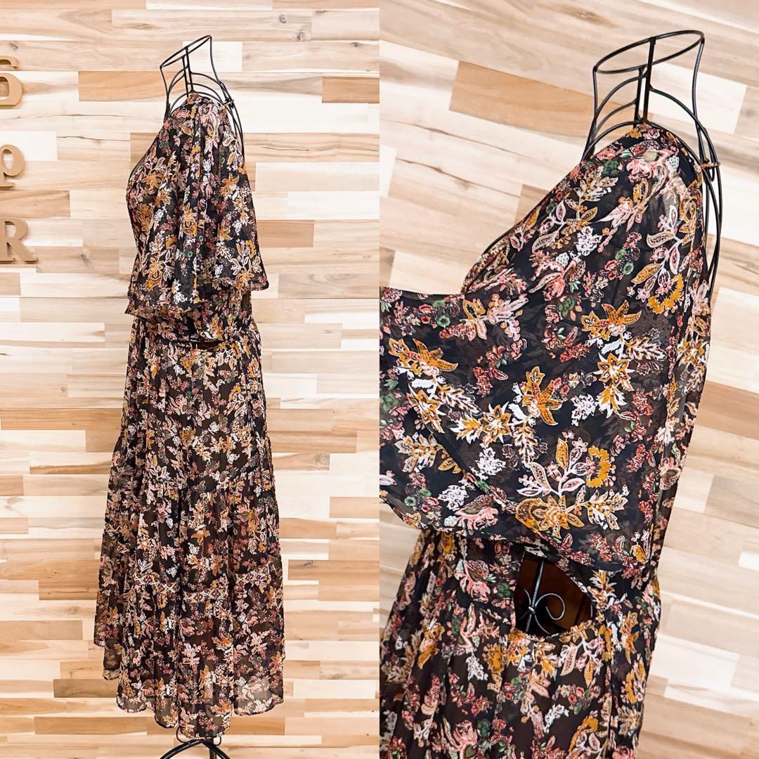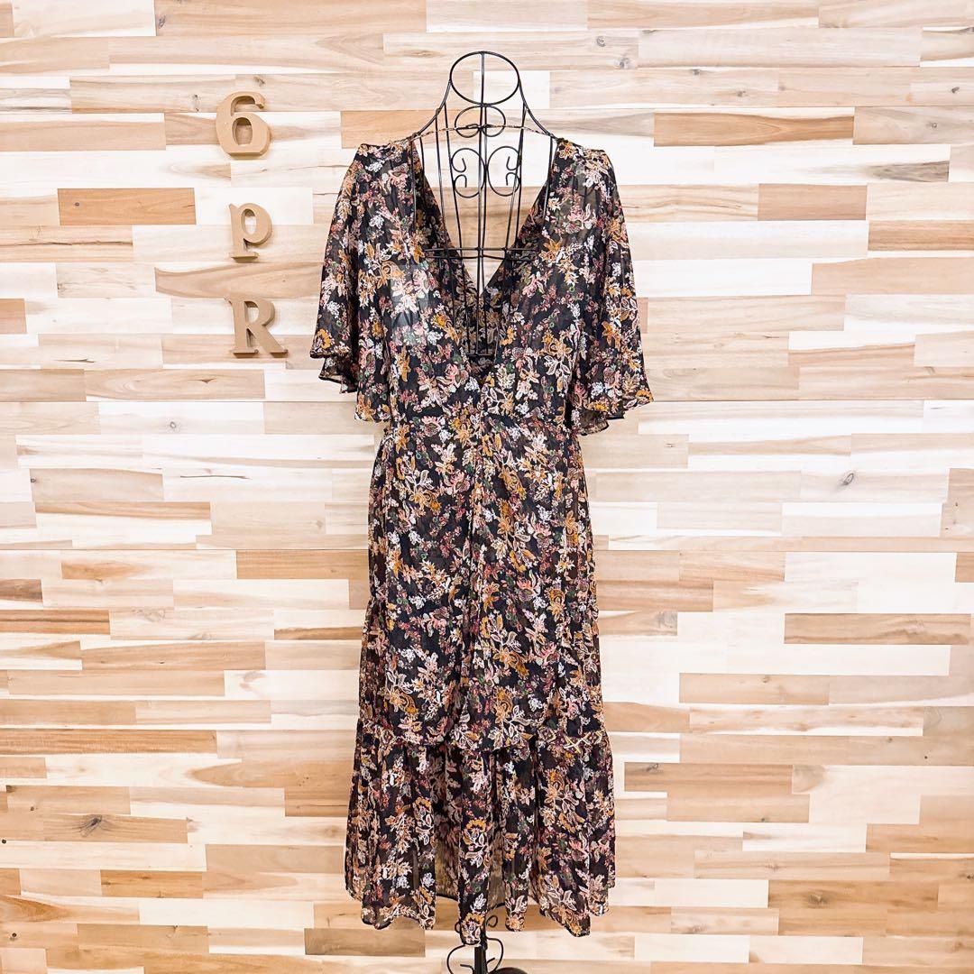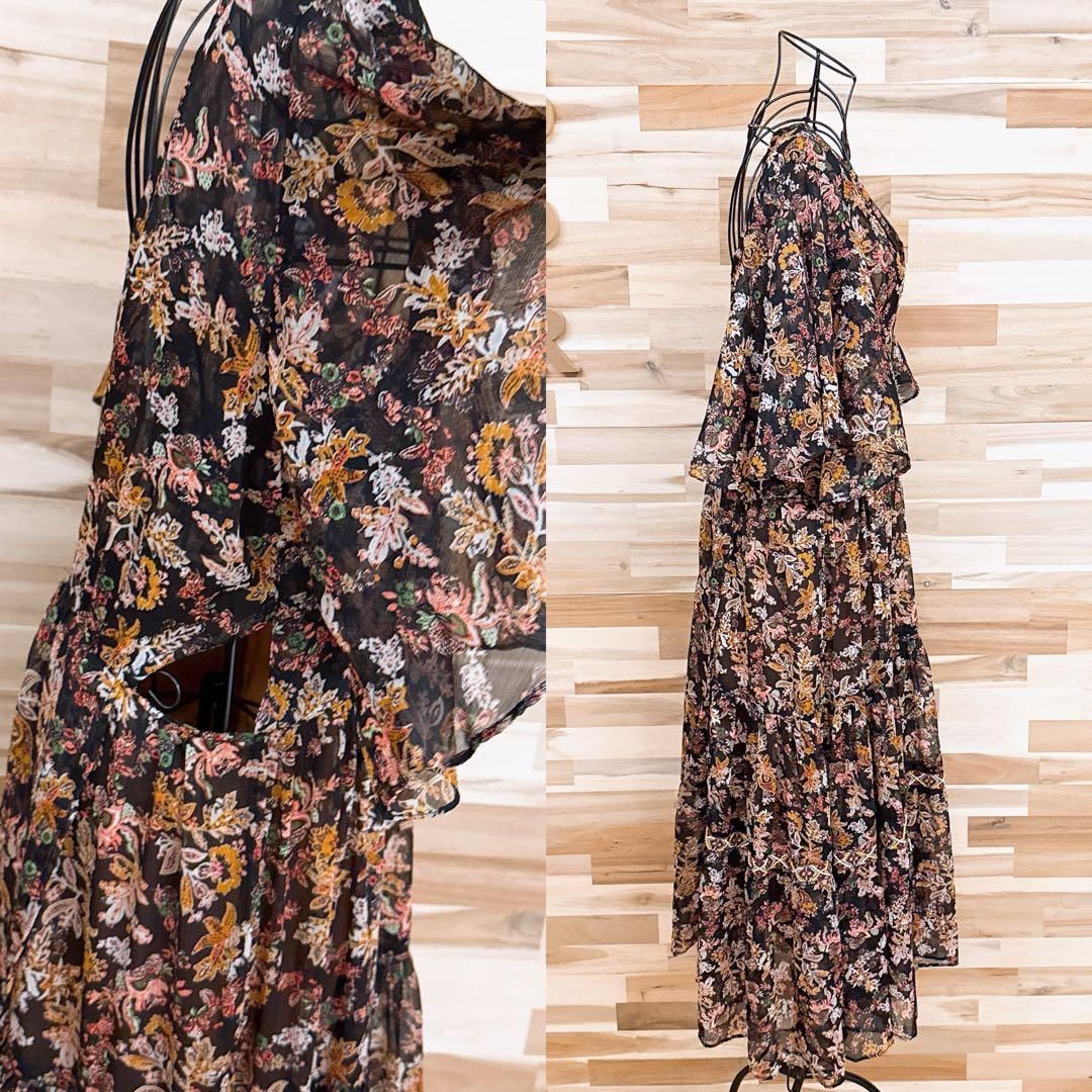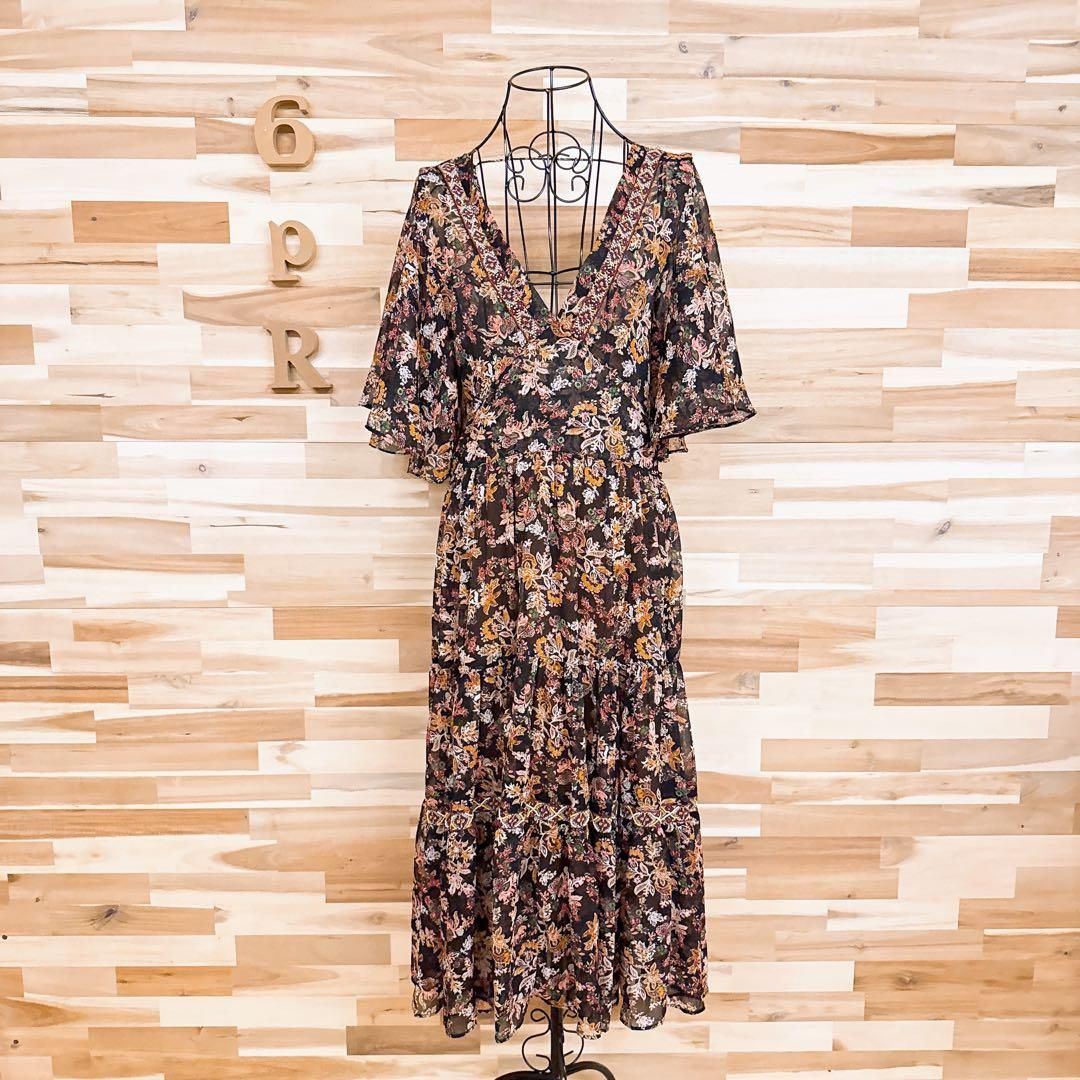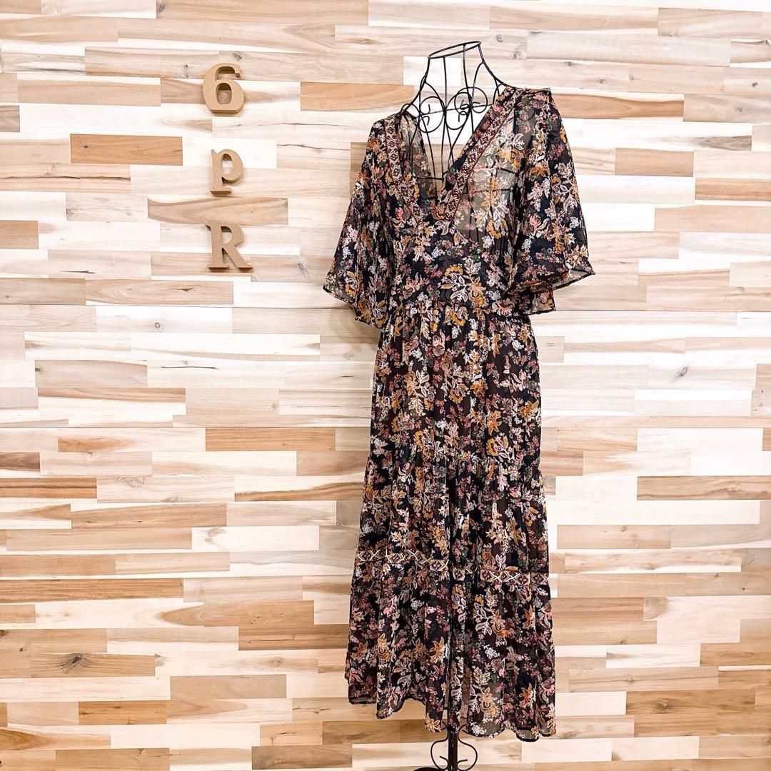 * シアー / ビジュー / ビーズ / エスニック / 総柄 *落ち着いた黒地に映えるオレンジや赤みを帯びた花柄があたたかみを添え、透け感のある軽やかな素材が柔らかい肌ざわりの一枚。ゆったりと広がるフレアスリーブと切り替えから広がるロングシルエットに、顔周りをすっきりと見せてくれる深めのVネック、両ウエストのカッティングでさりげない肌見せがスタイルアップ効果も嬉しいZARAのワンピースです。同じデザインを数多く作らないブランドのため、出回る数が少なく希少性の高いお品です。