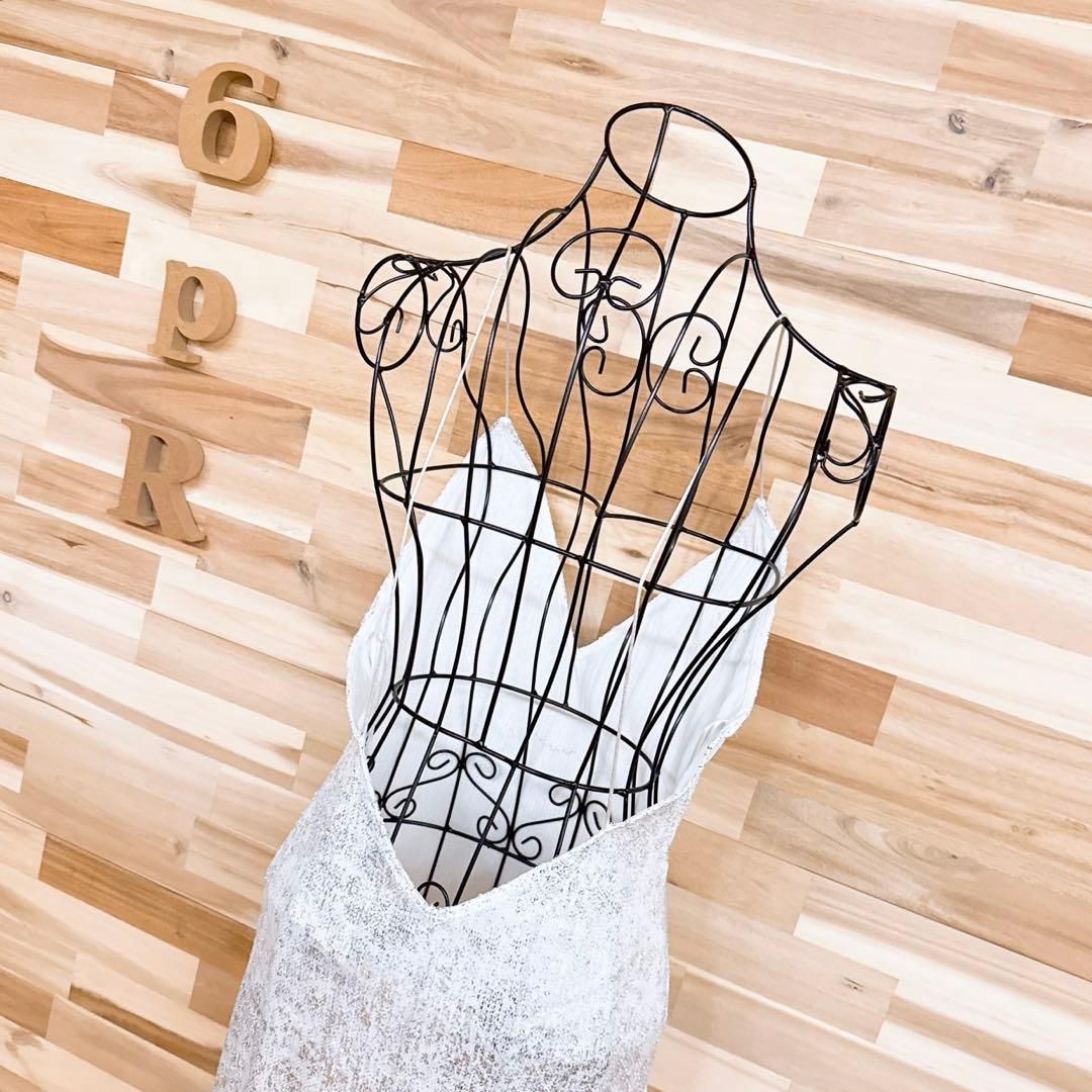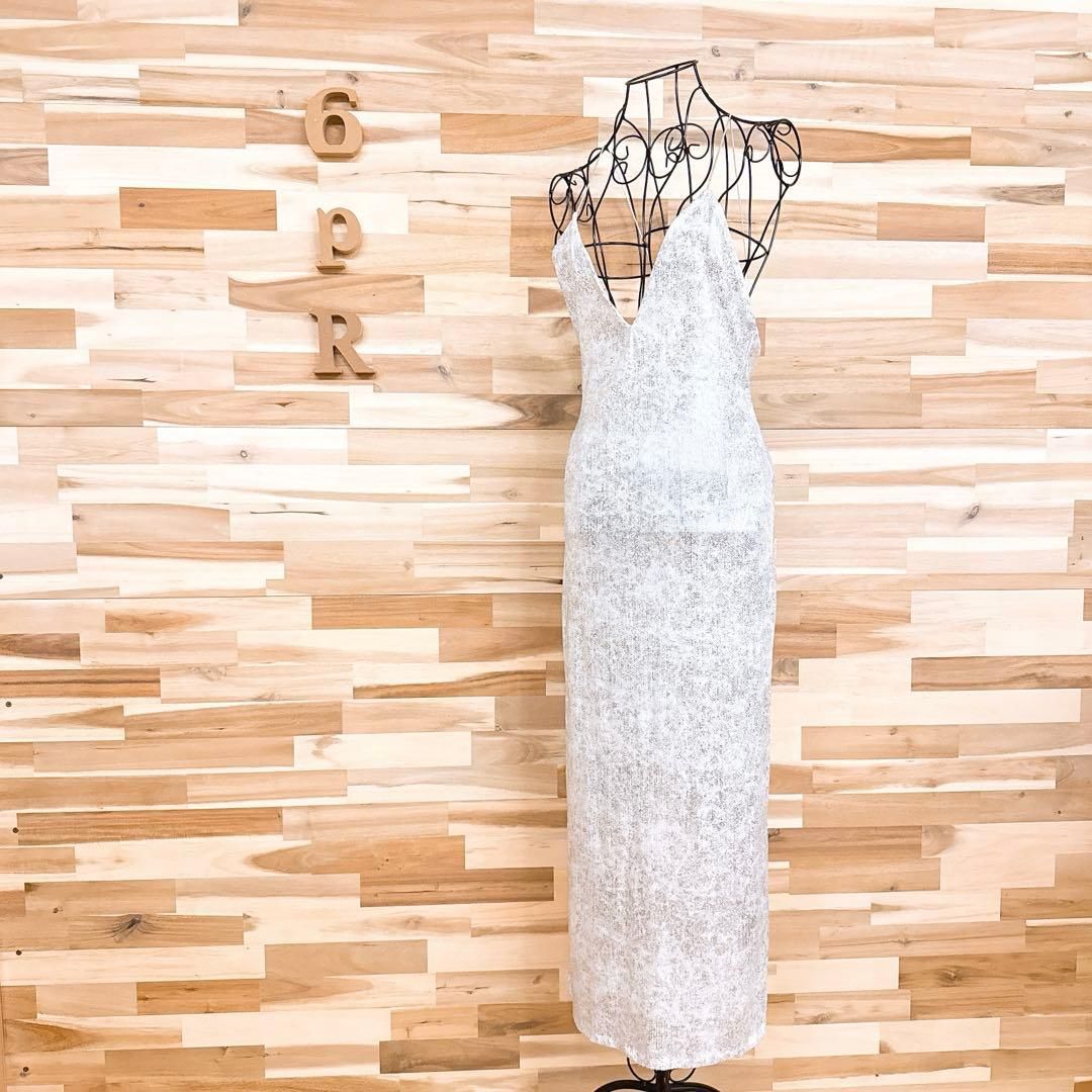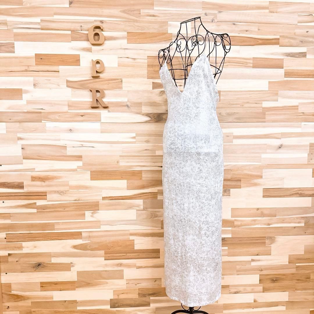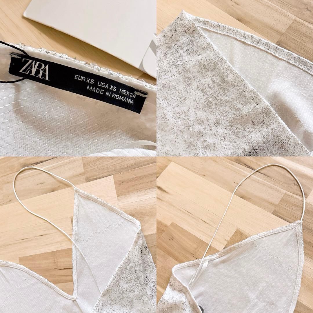 * キャミワンピ *全身に散りばめられた繊細なスパンコールが動くたびに上品な光を放ち、ホワイトとシルバーの色合いが凛とした印象を演出。深めのVネックと背中の大胆なカットが女性らしさを引き立て、すらりとしたロングラインが身体に沿った柔らかいシルエットを強調してくれるZARAのワンピースです。同じデザインを数多く作らないブランドのため、出回る数が少なく希少性の高いお品です。