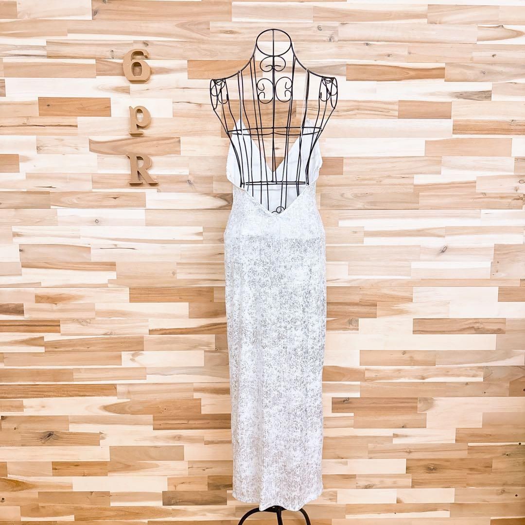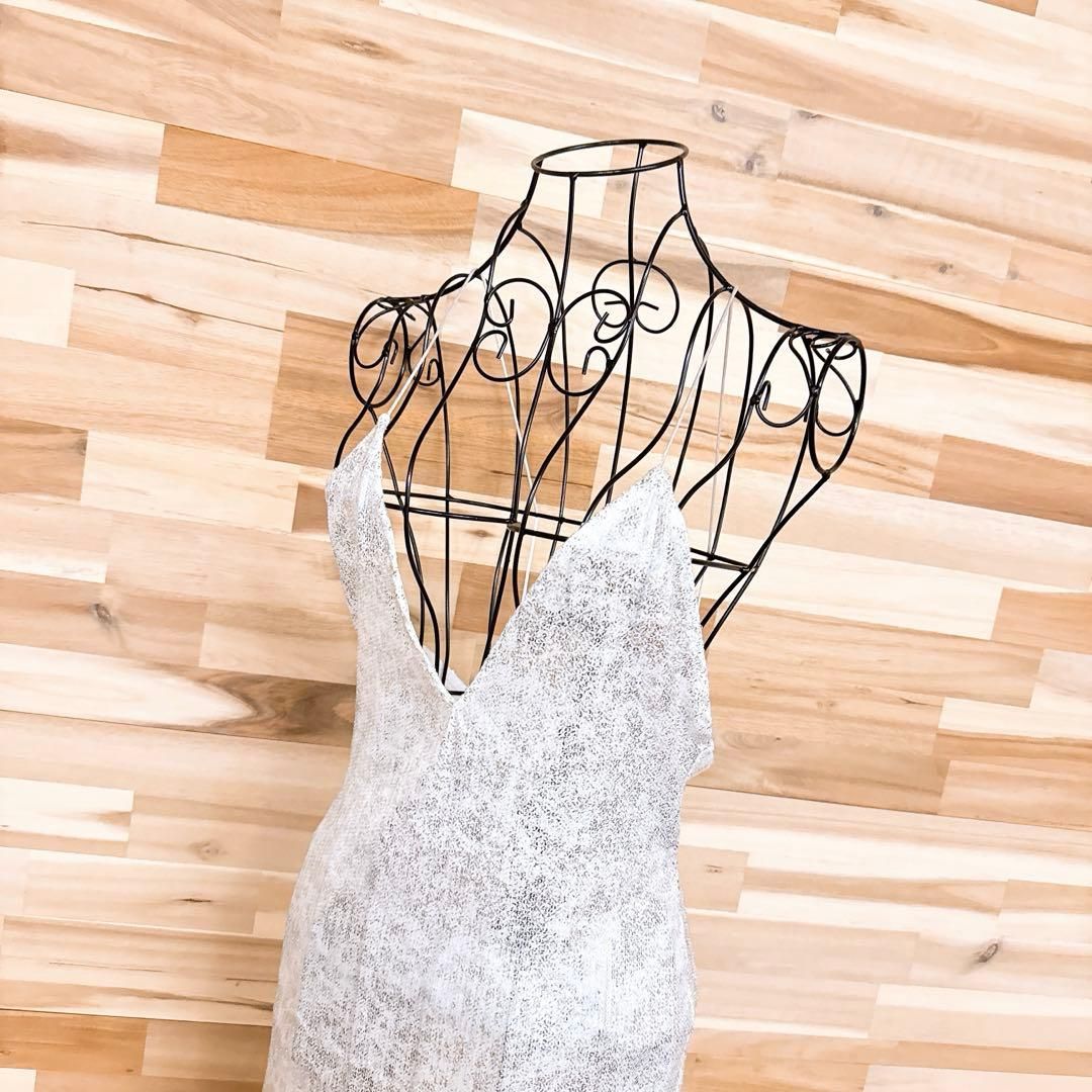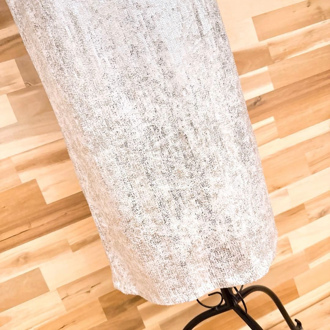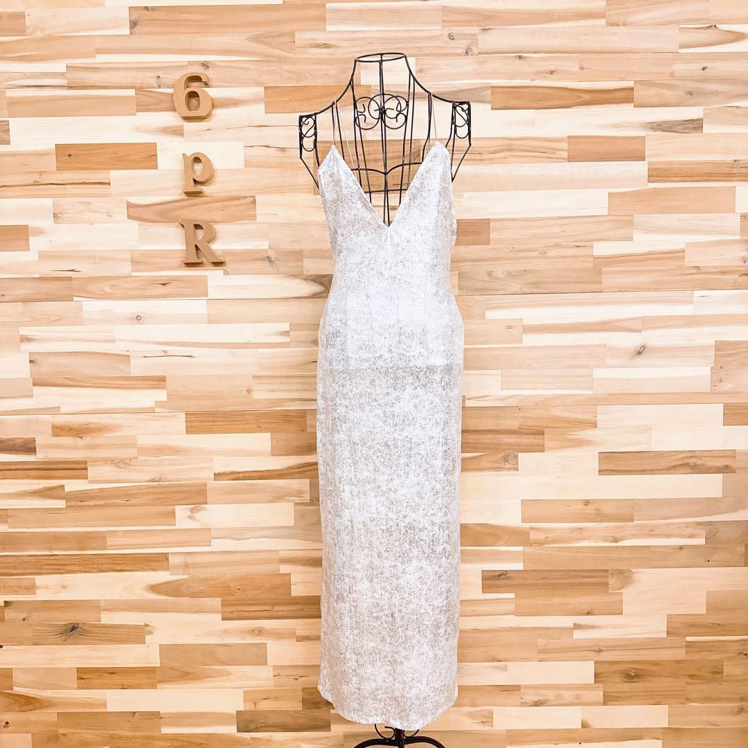 * キャミワンピ *全身に散りばめられた繊細なスパンコールが動くたびに上品な光を放ち、ホワイトとシルバーの色合いが凛とした印象を演出。深めのVネックと背中の大胆なカットが女性らしさを引き立て、すらりとしたロングラインが身体に沿った柔らかいシルエットを強調してくれるZARAのワンピースです。同じデザインを数多く作らないブランドのため、出回る数が少なく希少性の高いお品です。