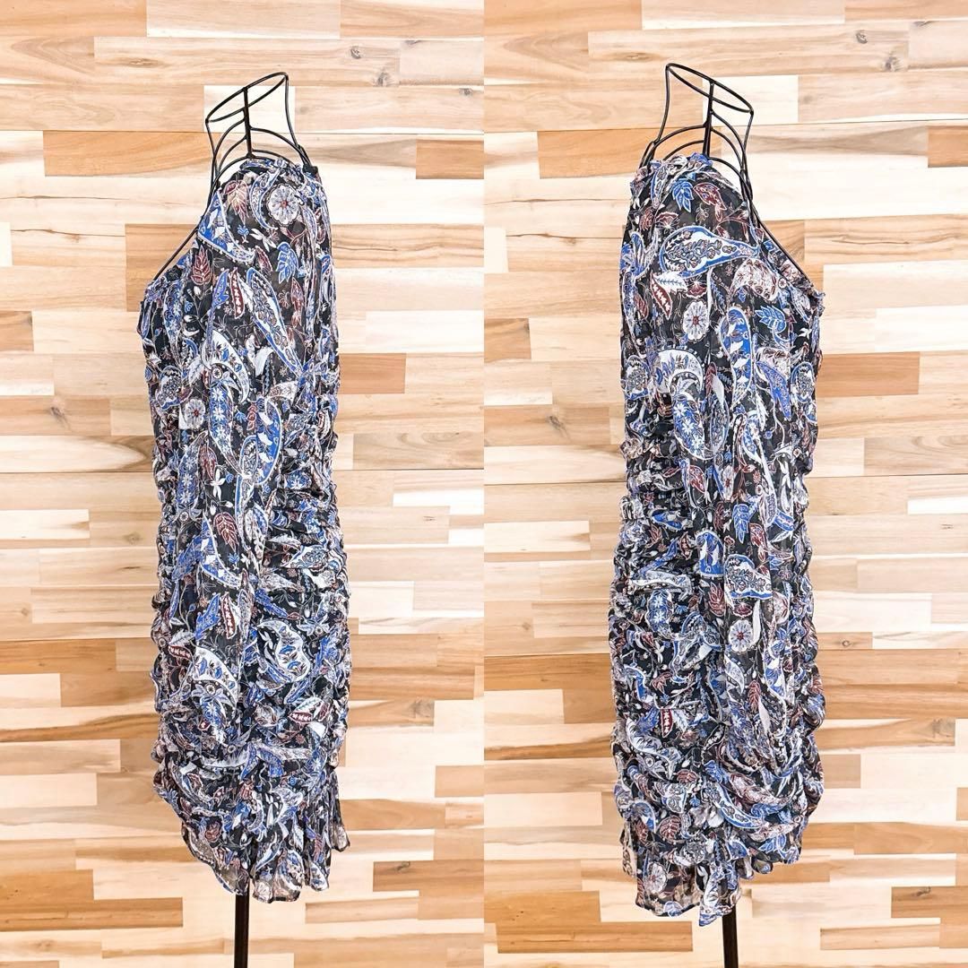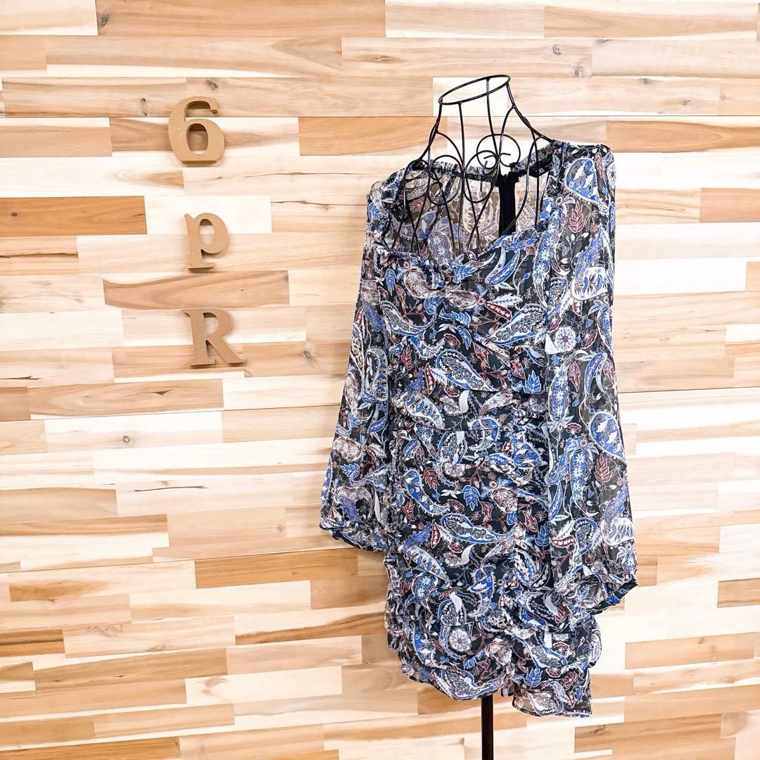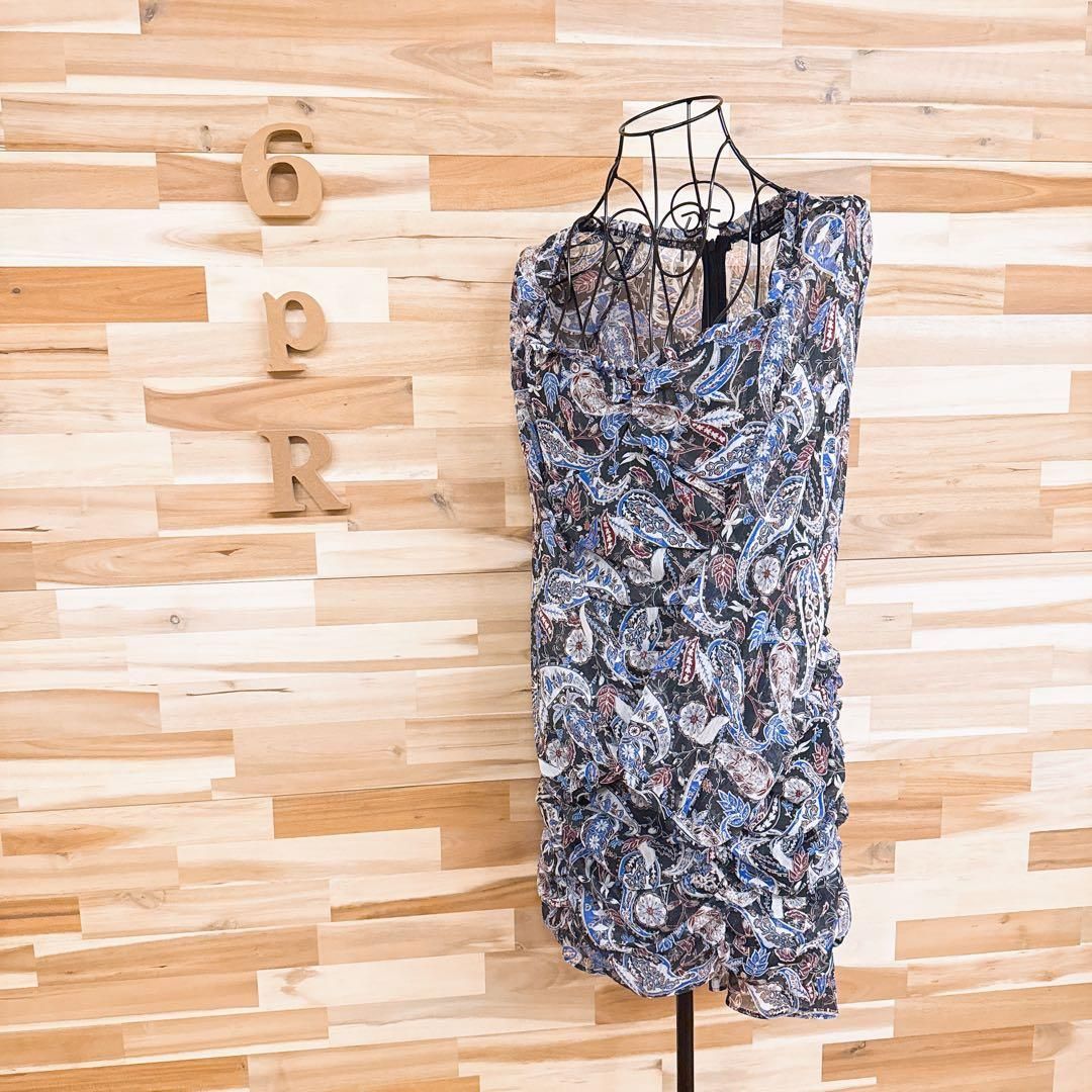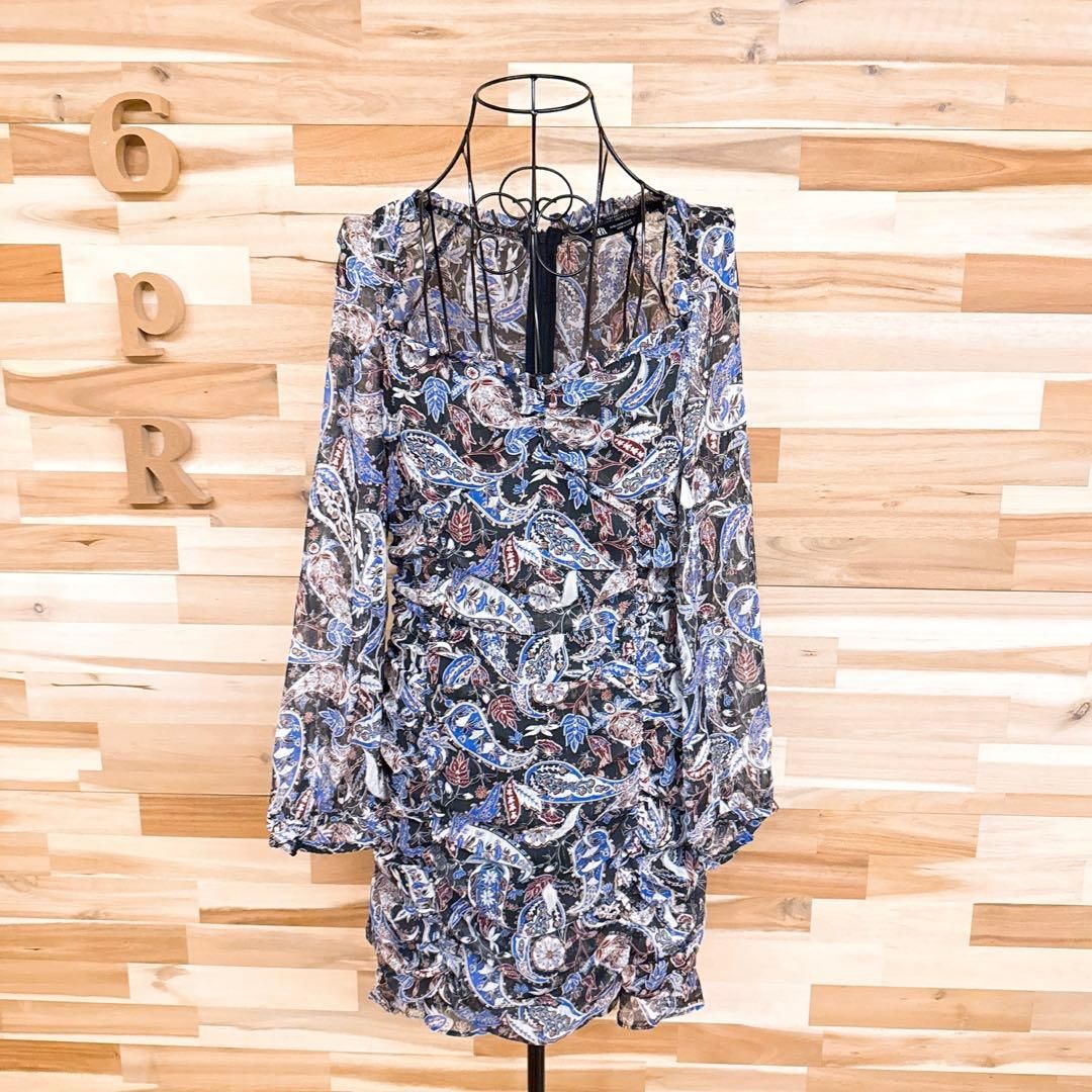 * 0097/230/330 *軽やかなシフォン素材で仕立てられた、柔らかな透け感のある風合いが魅力的。ブラックをベースにブルーやボルドーのペイズリーがリズミカルに広がり、奥行きのある印象に。立体感をつくるギャザー・ドレープがアクセントになり、ボディラインを美しく演出。メタル糸がストライプ状に織り込まれ、華やかな大人スタイルのZARAのワンピースです。※LGスタイラーにて除菌リフレッシュ・スチームクリーニング済みです。