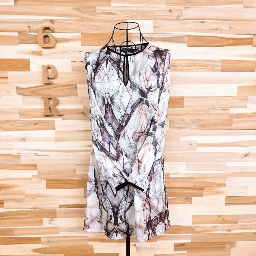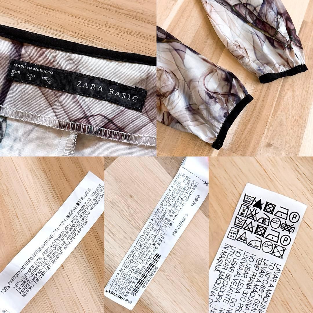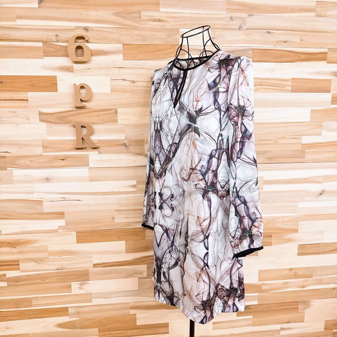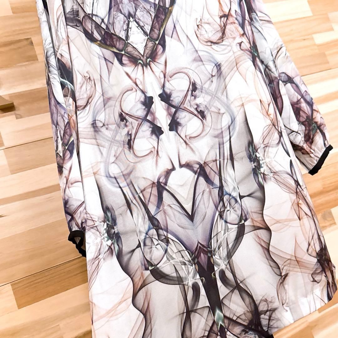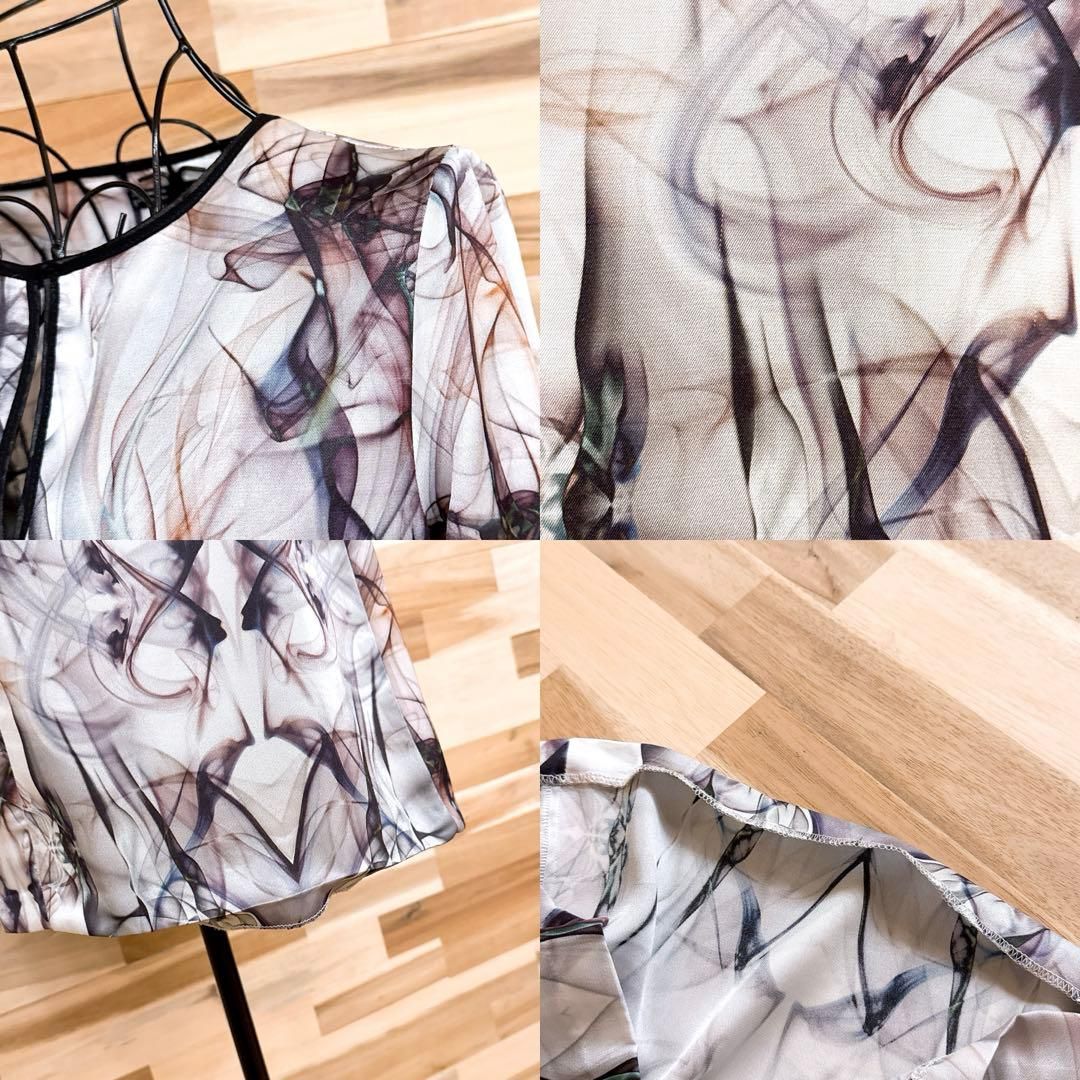 軽やかな素材感で、心地良いさらりとした肌触り。スモーキーなパープルやグレーを基調にした大理石のようなマーブル模様が奥行きを感じさせる印象に。黒のパイピングがアクセントとなり、繊細な首元の開きと袖口を美しく引き締める。細身のパンツやブーツと合わせたレイヤードスタイルにもおすすめなZARAのワンピースです。※LGスタイラーにて除菌リフレッシュ・スチームクリーニング済みです。