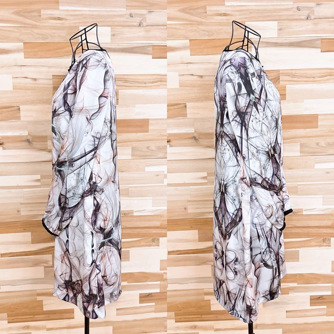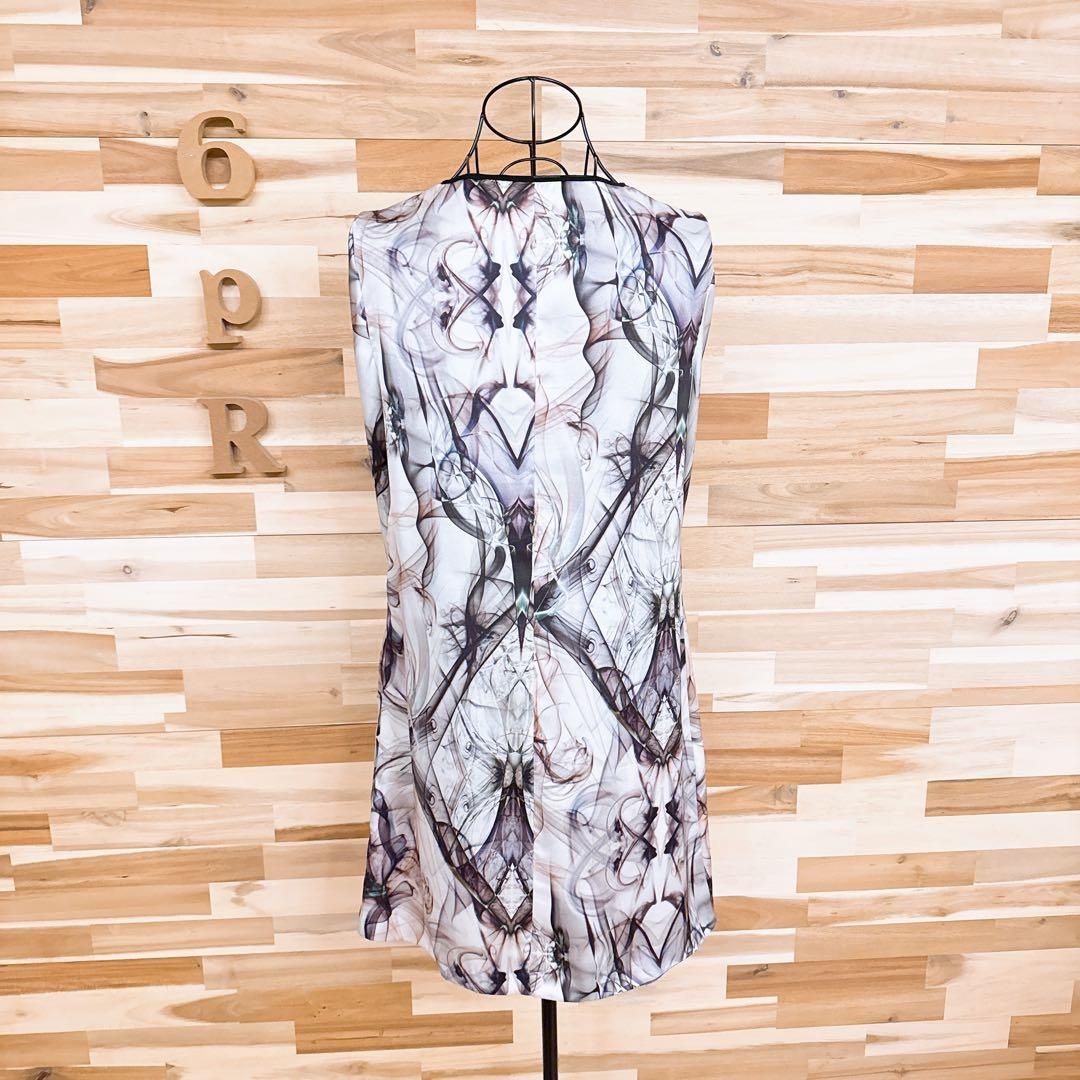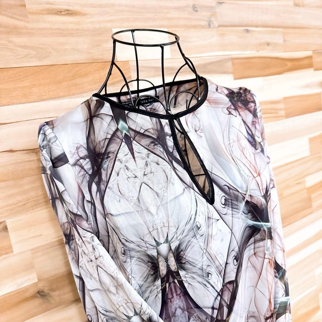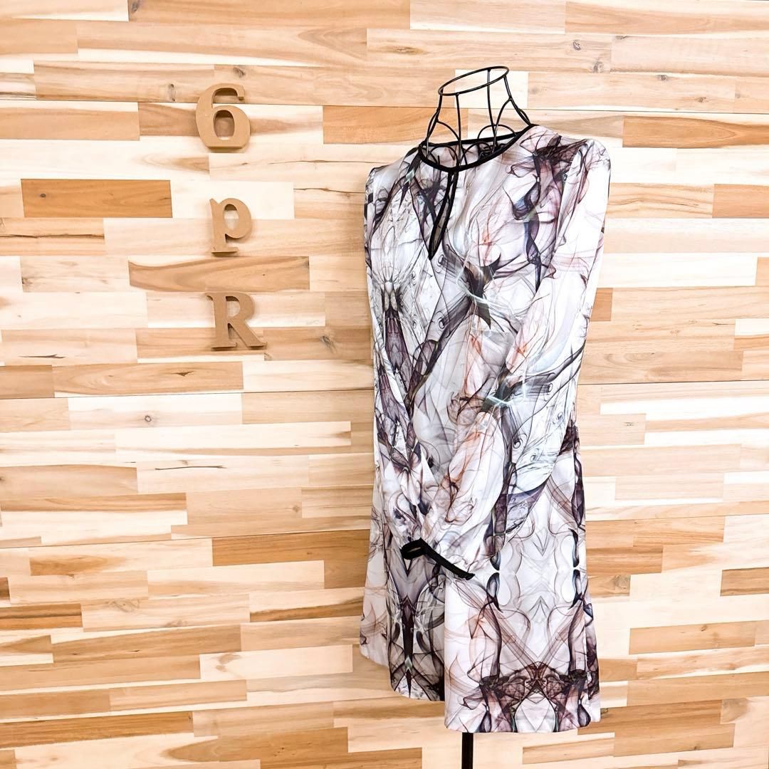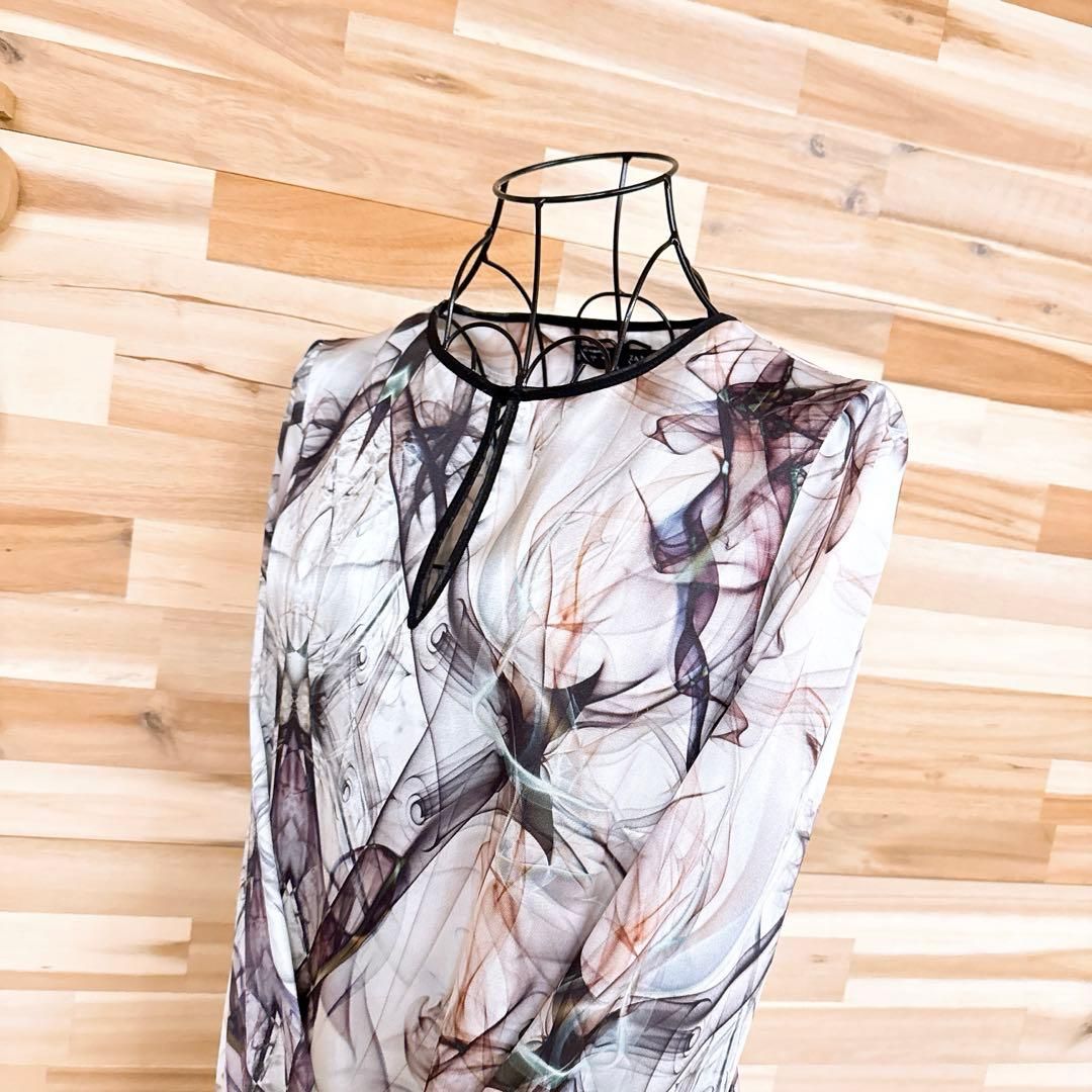 軽やかな素材感で、心地良いさらりとした肌触り。スモーキーなパープルやグレーを基調にした大理石のようなマーブル模様が奥行きを感じさせる印象に。黒のパイピングがアクセントとなり、繊細な首元の開きと袖口を美しく引き締める。細身のパンツやブーツと合わせたレイヤードスタイルにもおすすめなZARAのワンピースです。※LGスタイラーにて除菌リフレッシュ・スチームクリーニング済みです。