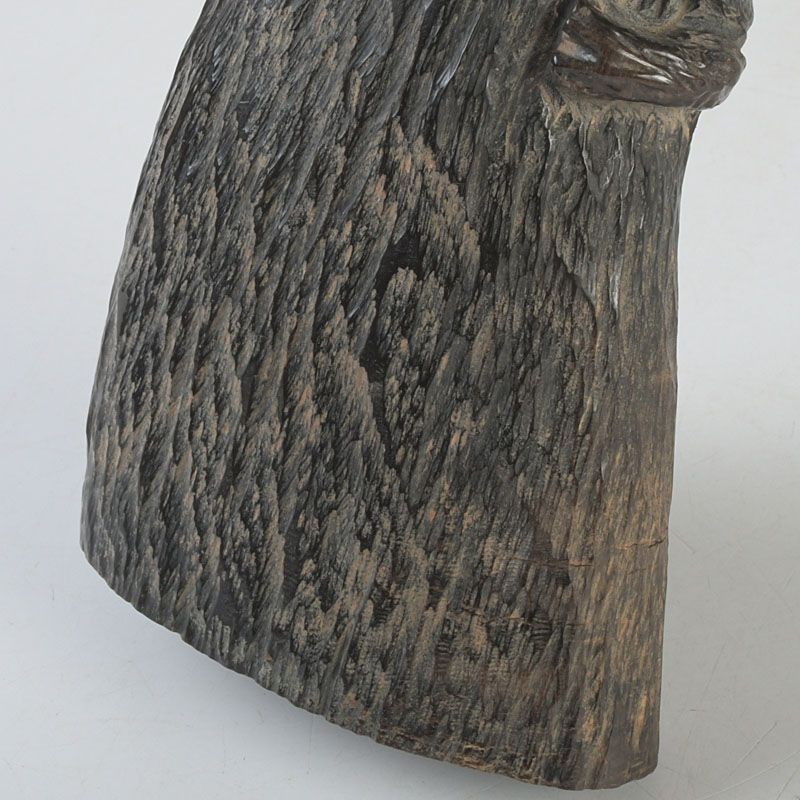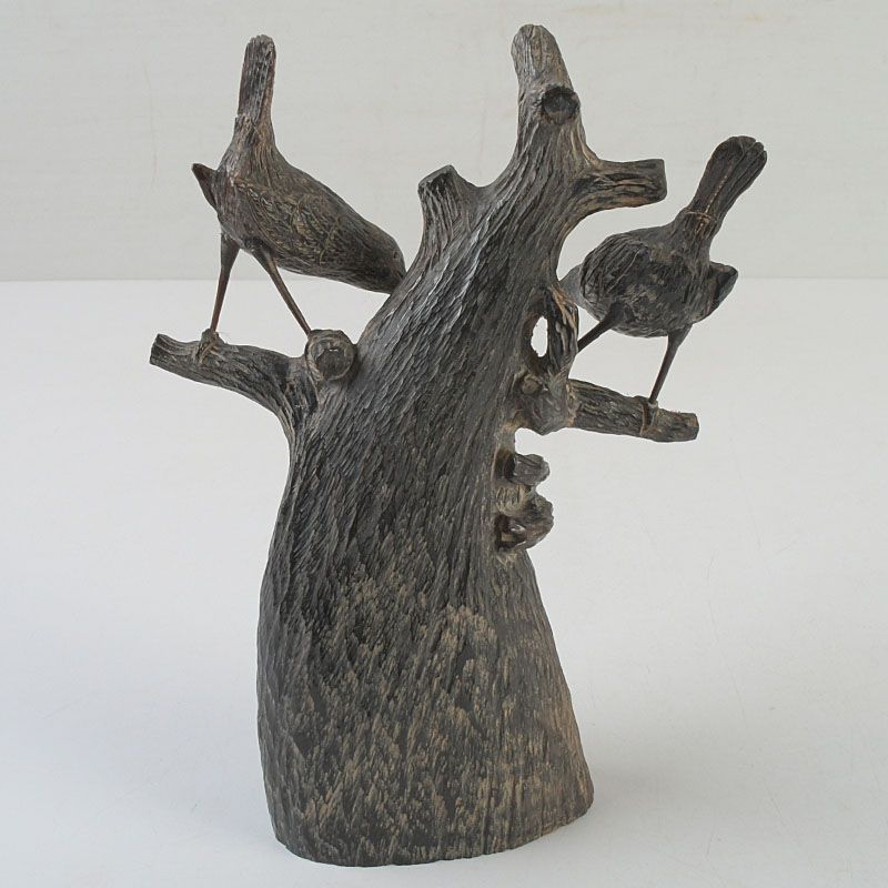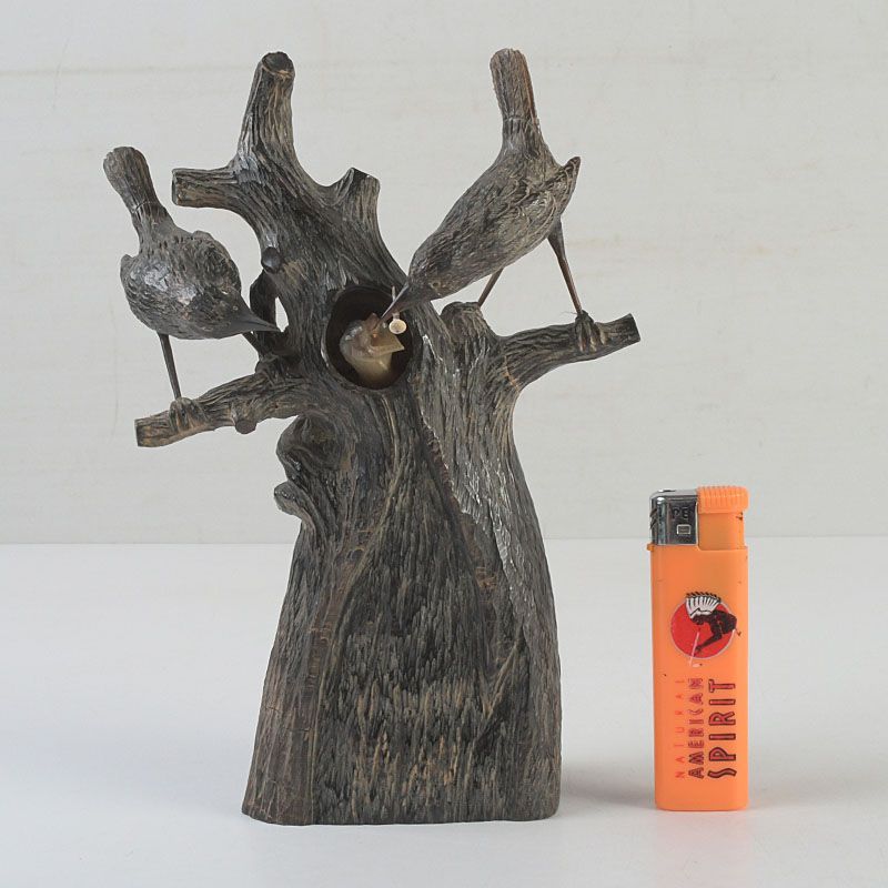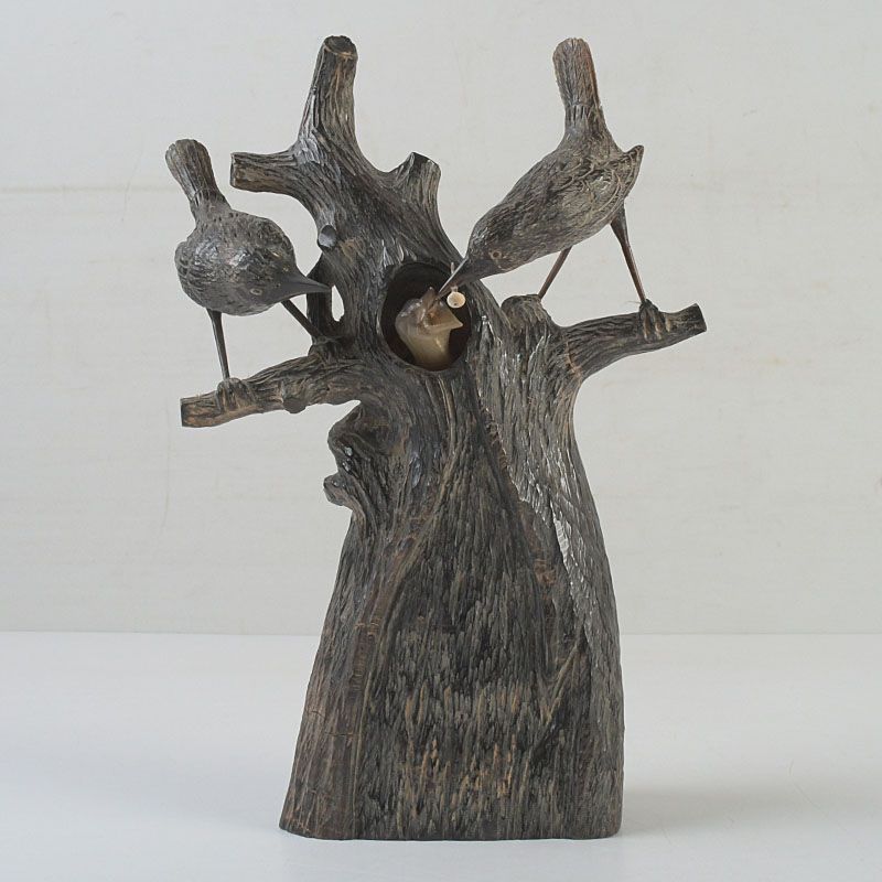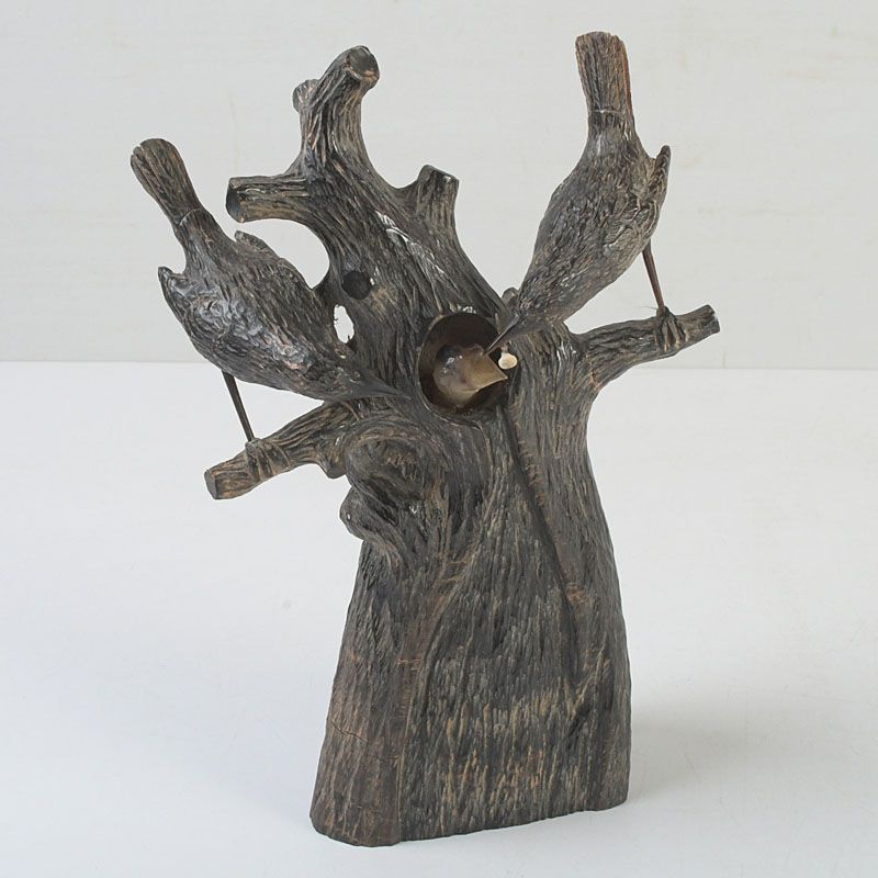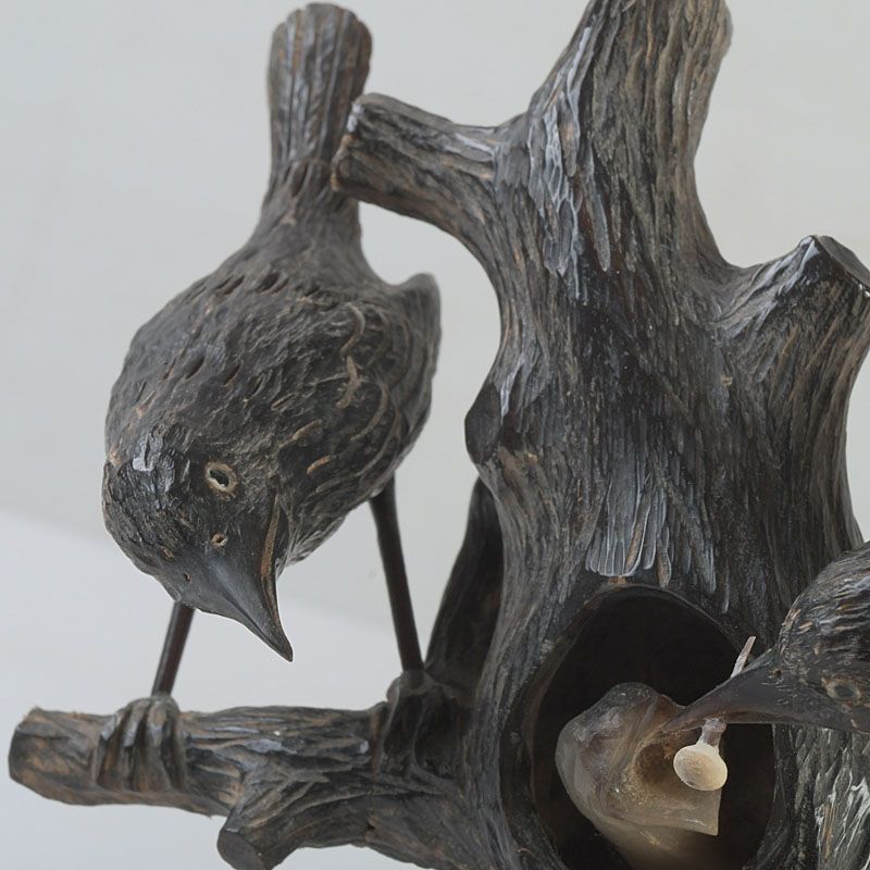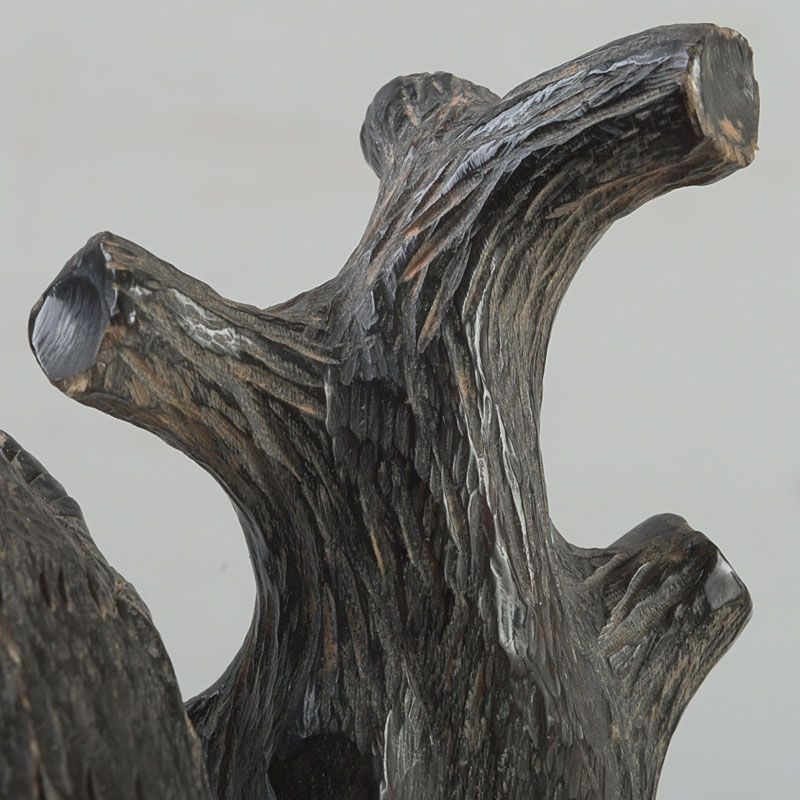 中国 水牛の角彫刻 木に鳥の親子 置物 N S319