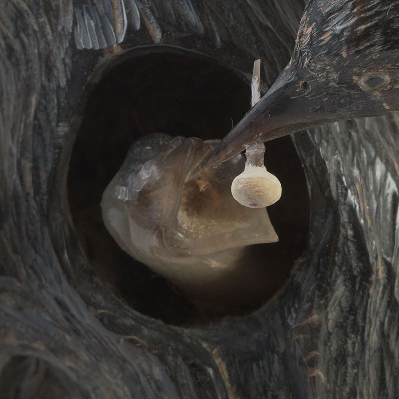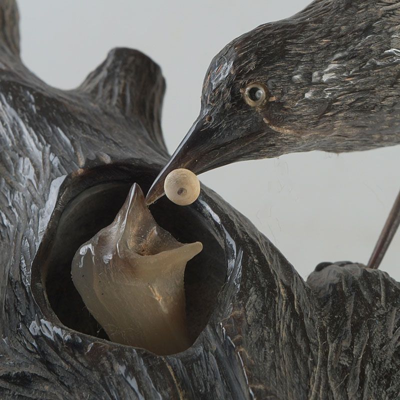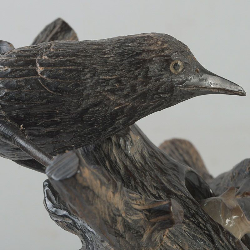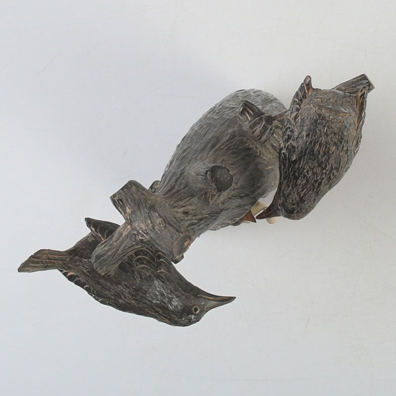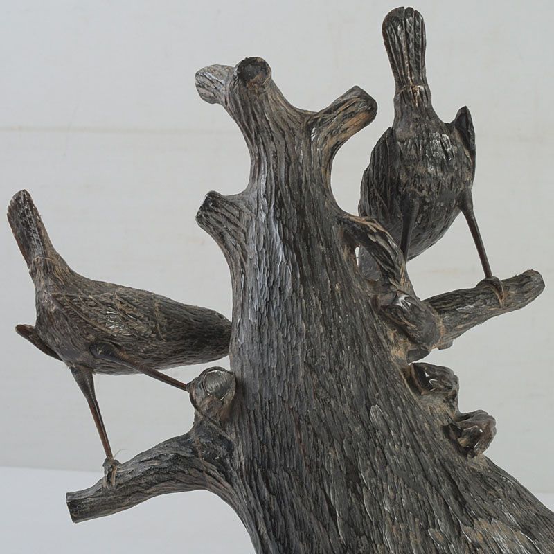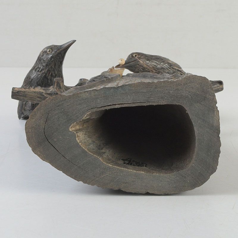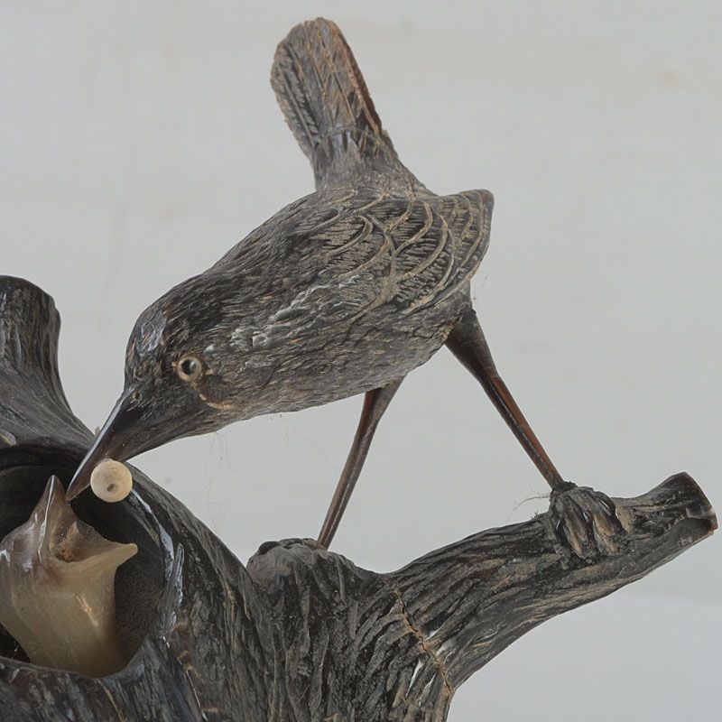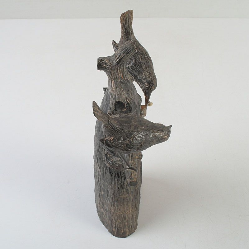 中国 水牛の角彫刻 木に鳥の親子 置物 N S319