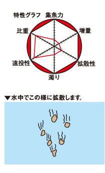 どっしりと重いのでスピーディに深ダナまで沈下。遠投性にも優れ、沖を狙うときにも重宝します。配合された高比重の素材、ムギ、コーン、カキガラも機能的に働き、素早くポイントを形成します。ネバリが少なく程よくまとまり、ヒシャク離れも良好。単品でもブレンドでも使えます。