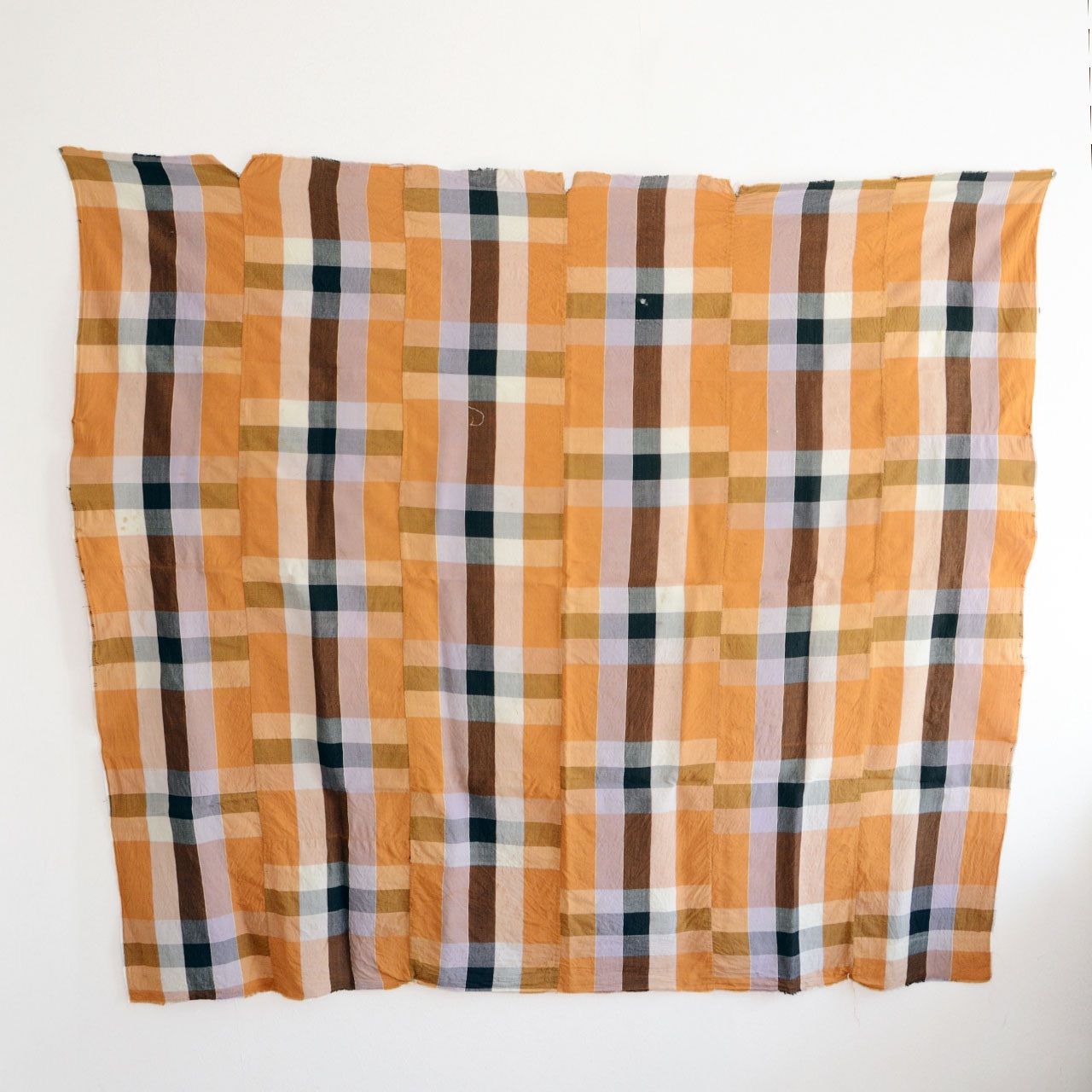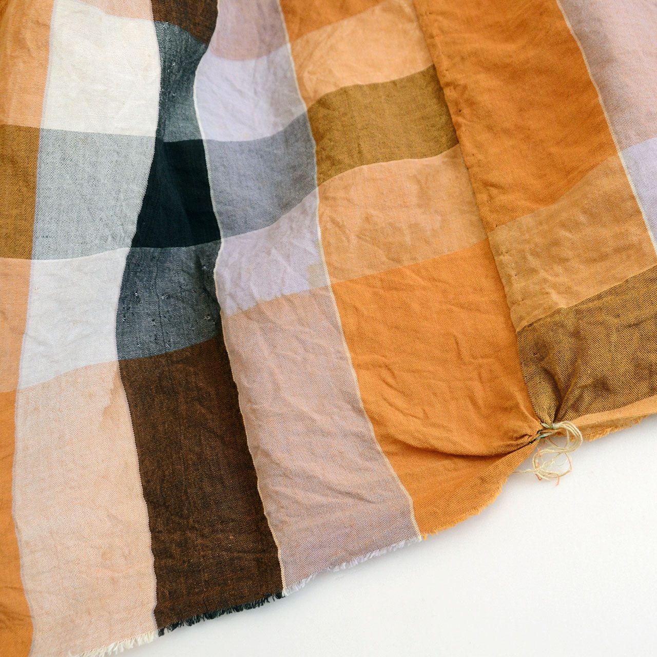 山吹色を基調とした格子模様は、やわらかで温かみのある印象を与え、時代を経た木綿ならではの優しい風合いが手に取るだけで伝わってきます。