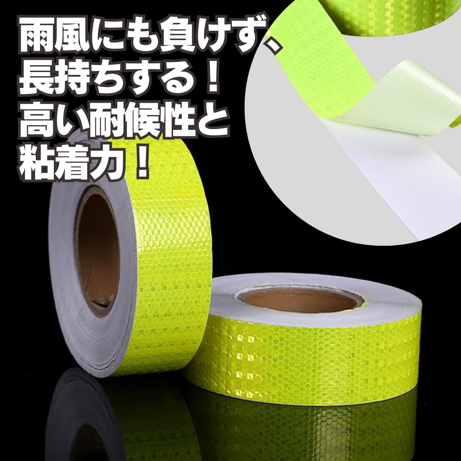 工事現場や駐車場の安全対策、夜間のジョギングや愛車の安全対策に最適な、50mm幅25mの反射テープです。イエロー、ホワイト、レッド、ブルー、グリーン、オレンジ、ゴールドの7色から用途に合わせて選べ、風雨や紫外線に強い高耐久素材で長持ちします。裏面は粘着性シールタイプで簡単に貼付可能。大切な人を事故から守るために、今すぐ購入して夜間の安全を手に入れましょう!
