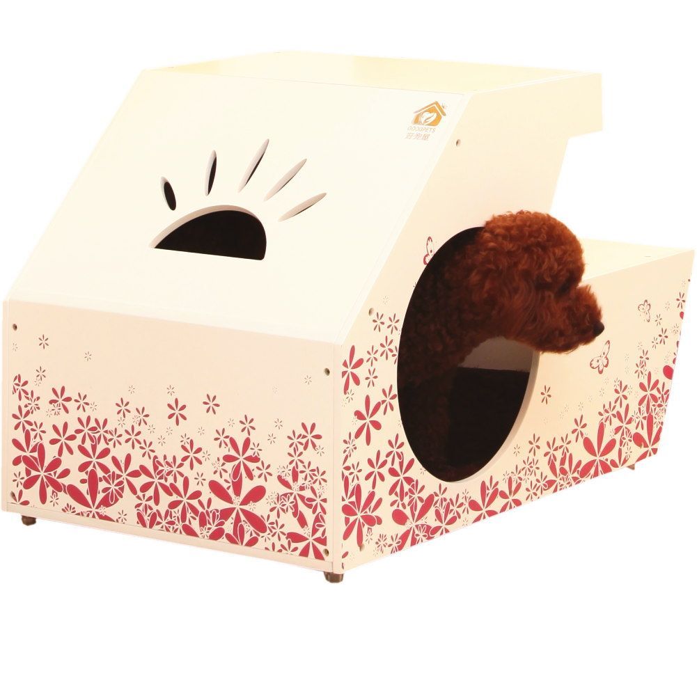 この木製ペットハウスは、犬や猫のための快適な空間を提供します。