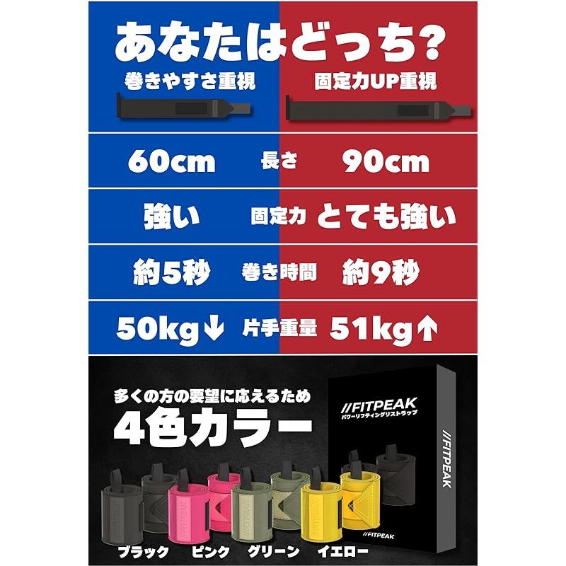 ?【巻きやすい60cm・超固定90cm】あなたはどっち?FITPEAKリストラップは2種類の長さがあり、巻きやすさ重視の60cmタイプと超固定タイプの90cmタイプをご用意しております。目安: 片手重量50kg以下→60cmタイプ、片手重量51kg以上→90cmタイプ。女性や初心者、中級者の方であれば、60cmタイプで十分です。さらに、競技レベルで上を目指したい方、手首の固定を強化したい方は90cmをお勧めします。