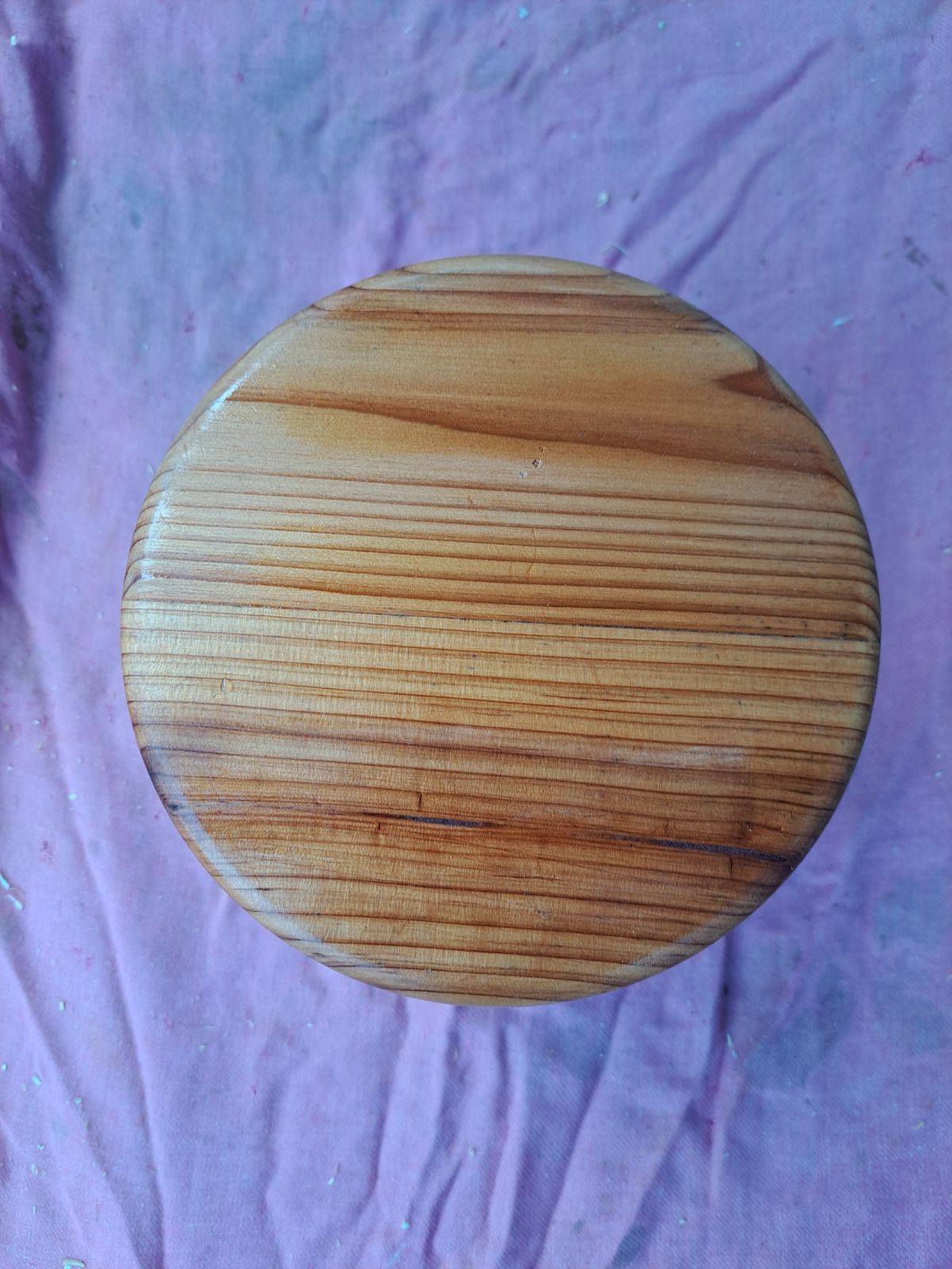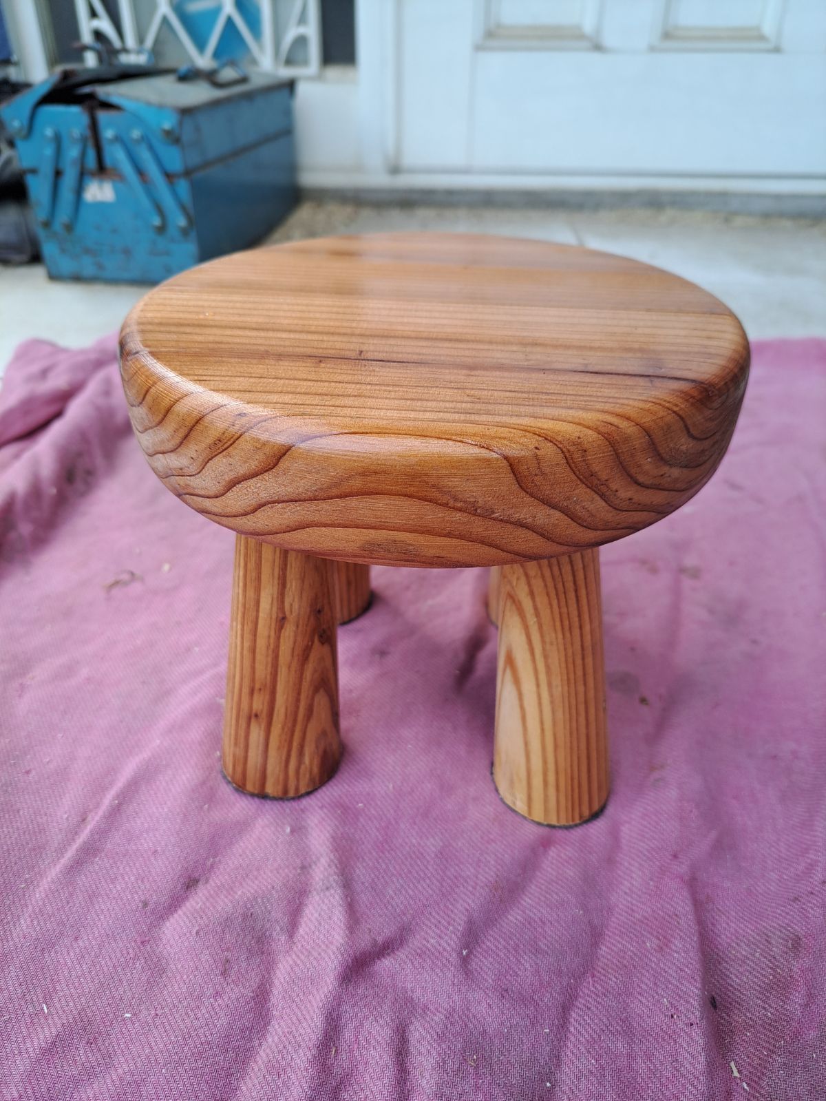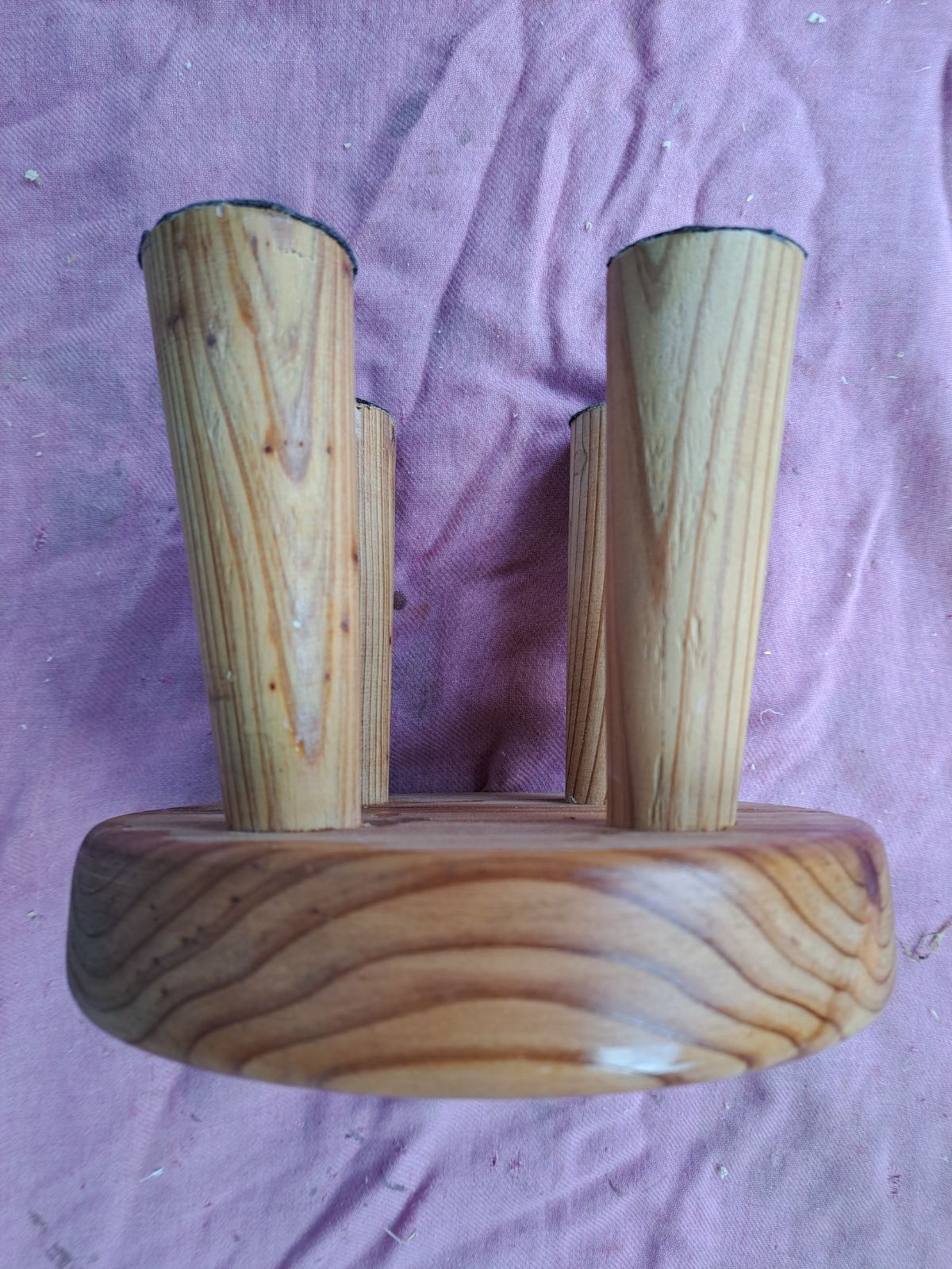趣味で木工してます。 木工作業で出る廃材や端材を何かの形にと考え出来上がった作品です。 座面は杉板で直径185mm厚さ35mmです。 足は杉で通常と逆に末広型にして見ました。太い処の直径は40mmです。 座面の高さは150mm(およそです)でウレタン仕上げです。 ※発送前にはガラス面上でガタツキ調整して発送しますが設置環境が変われば多少ガタツキが出るかもしれませんが、その場合にはフェルト等貼り付けで調整してください。 玄関ポーチ 屋内下駄箱の上等インテリアに如何でしょうか?木製品なので雨の当たる所は苦手です。 素人の手作り品で廃材等の端材利用の為節や割れや釘抜き穴埋めや塗装むらはありますが、それも手作り感とご理解下さい。依って家具屋さんで見るような高級家具と比較されては困ります。 鉢植え ぬいぐるみ 小物雑貨等オシャレに飾ってお楽しみ下さい。 構造的には本格的ほぞ穴加工で組み立てていますが、目的以外の使用は避けて下さい。 がっちり太い材料で作っていますので子供椅子としてもお使い頂けます。