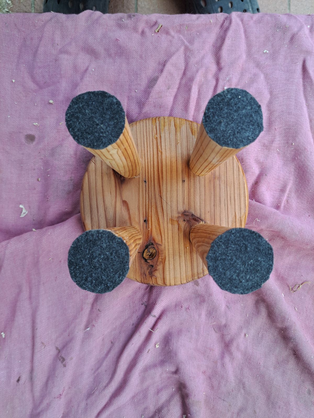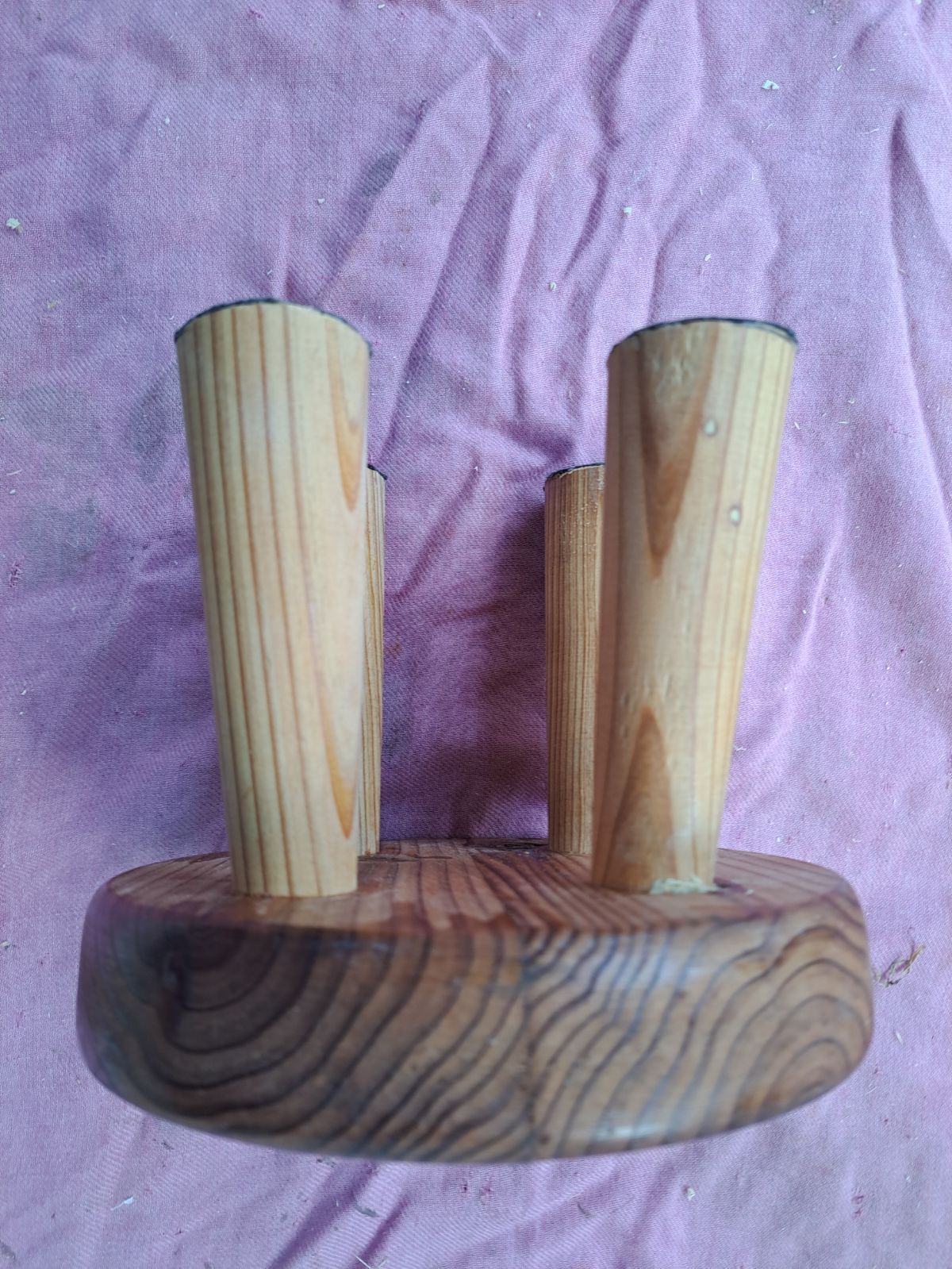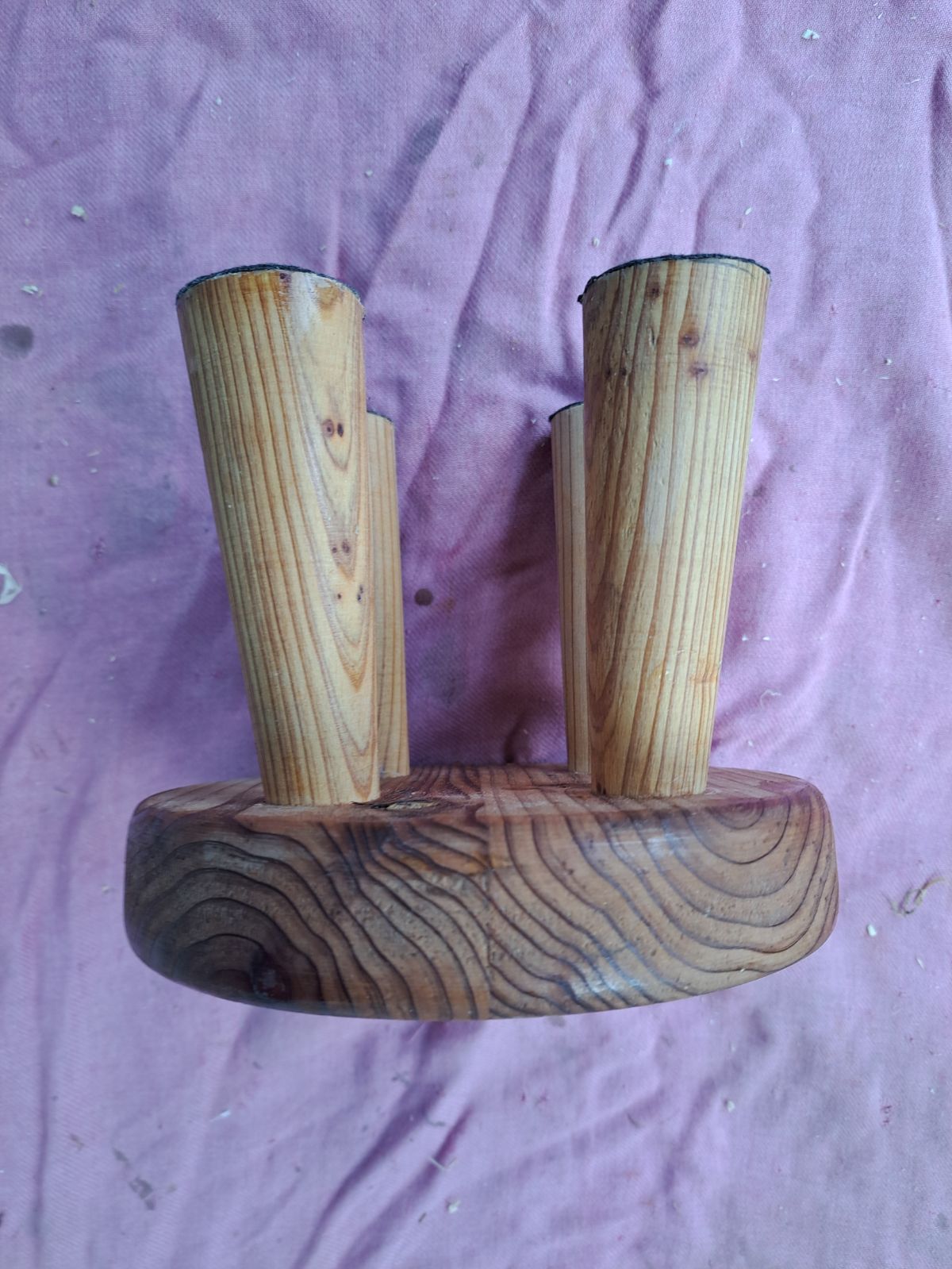 趣味で木工してます。 木工作業で出る廃材や端材を何かの形にと考え出来上がった作品です。 座面は杉板で直径185mm厚さ35mmです。 足は杉で通常と逆に末広型にして見ました。太い処の直径は40mmです。 座面の高さは150mm(およそです)でウレタン仕上げです。 ※発送前にはガラス面上でガタツキ調整して発送しますが設置環境が変われば多少ガタツキが出るかもしれませんが、その場合にはフェルト等貼り付けで調整してください。 玄関ポーチ 屋内下駄箱の上等インテリアに如何でしょうか?木製品なので雨の当たる所は苦手です。 素人の手作り品で廃材等の端材利用の為節や割れや釘抜き穴埋めや塗装むらはありますが、それも手作り感とご理解下さい。依って家具屋さんで見るような高級家具と比較されては困ります。 鉢植え ぬいぐるみ 小物雑貨等オシャレに飾ってお楽しみ下さい。 構造的には本格的ほぞ穴加工で組み立てていますが、目的以外の使用は避けて下さい。 がっちり太い材料で作っていますので子供椅子としてもお使い頂けます。