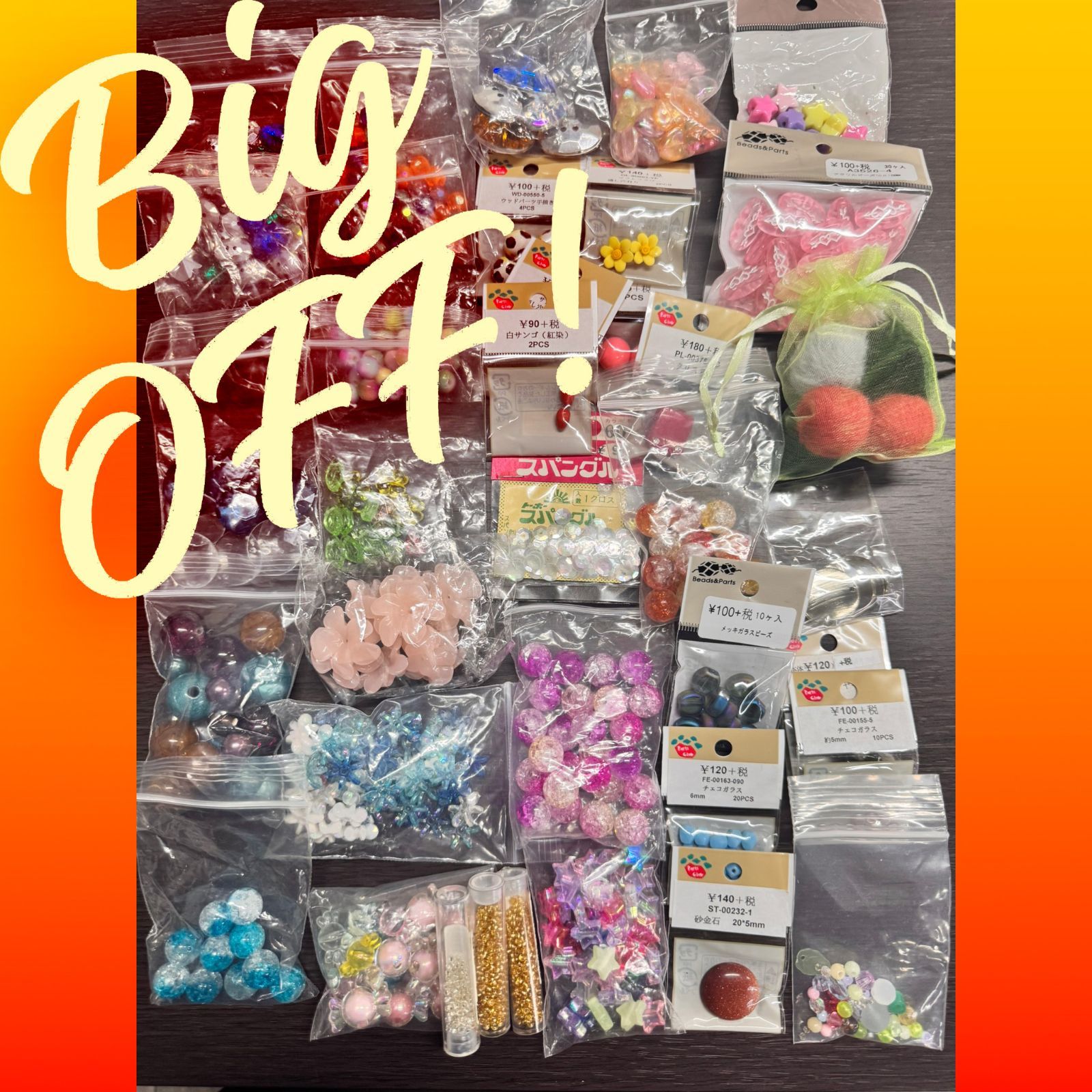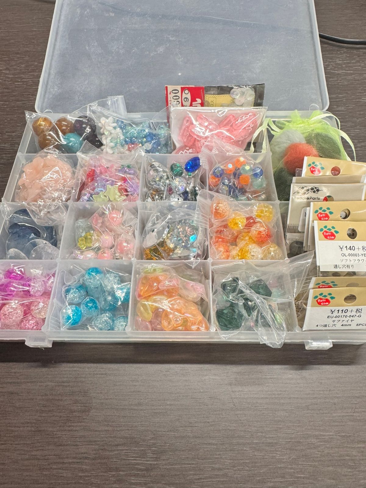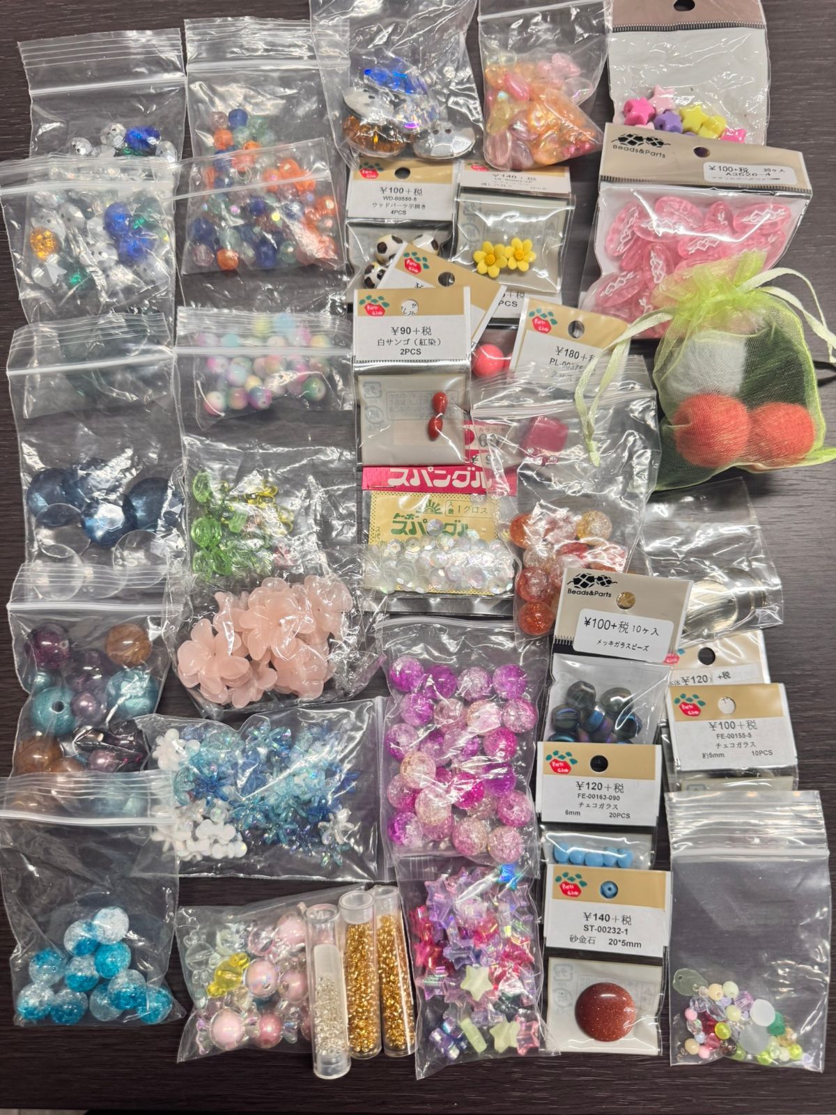 プラビーズ、金属パーツ、天然石ビーズ、ガラスビーズ、ウッドビーズなど、色々です。