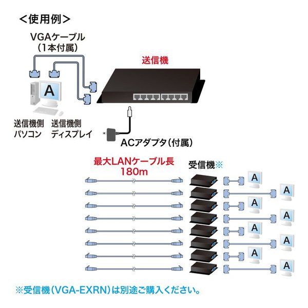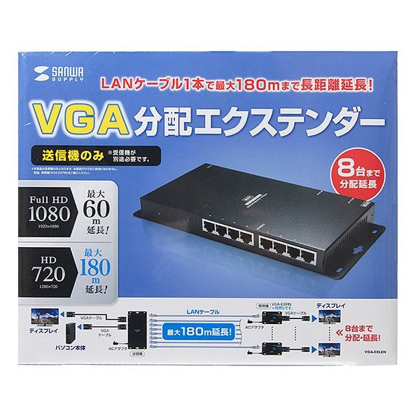 ●パソコンのアナログVGA画像を最大180m、フルHD(1080p)なら最大60m先の8台のディスプレイに同時に
