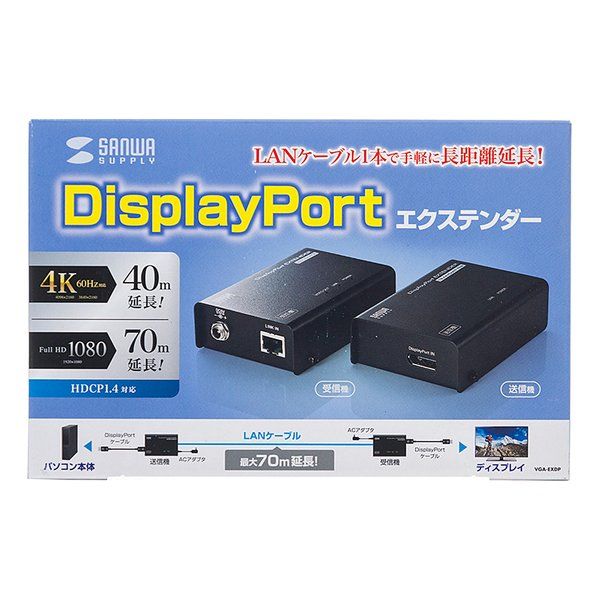 DisplayPort信号を4K解像度で最大40m、1080p解像度なら最大70mまで延長できる