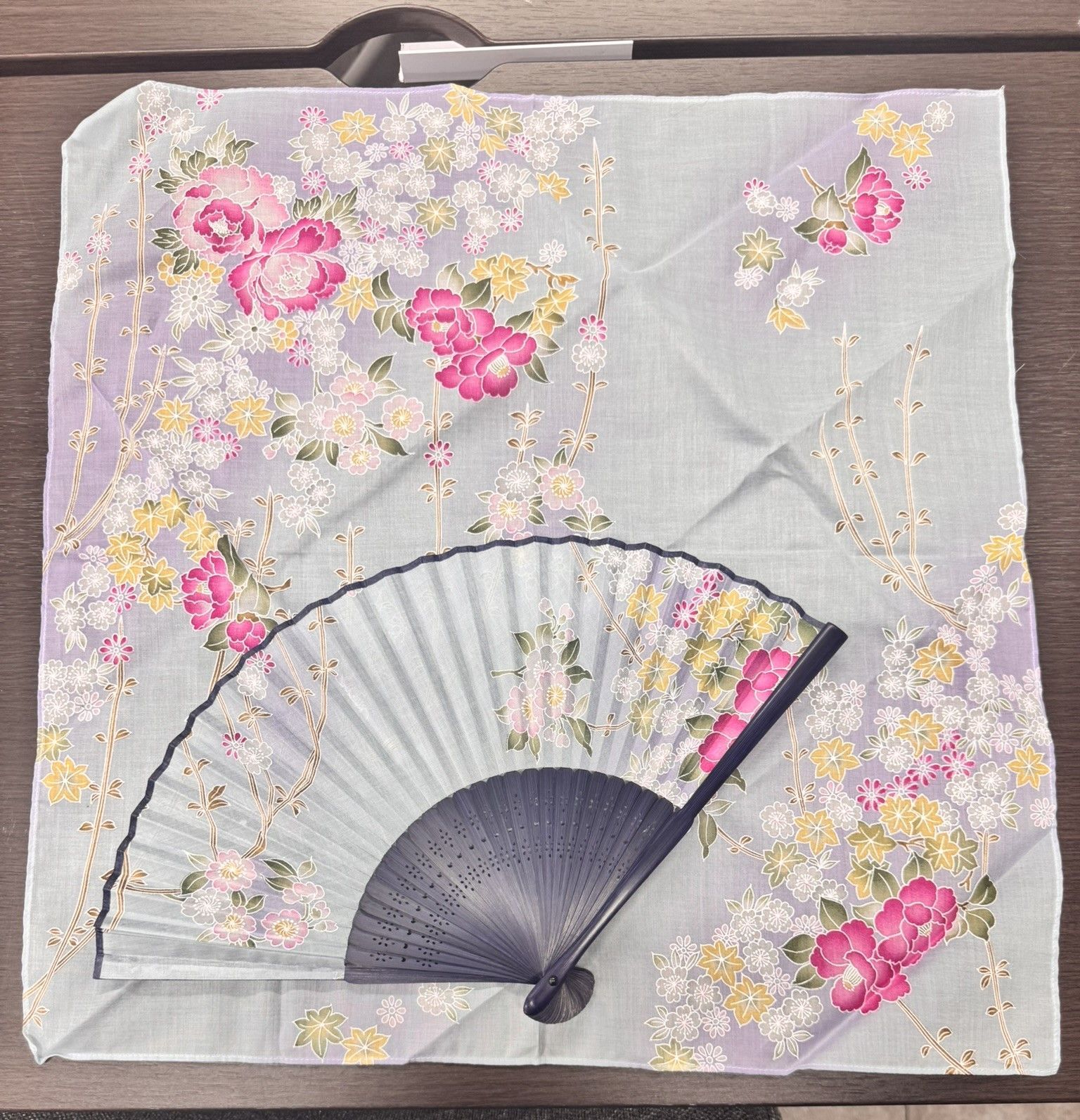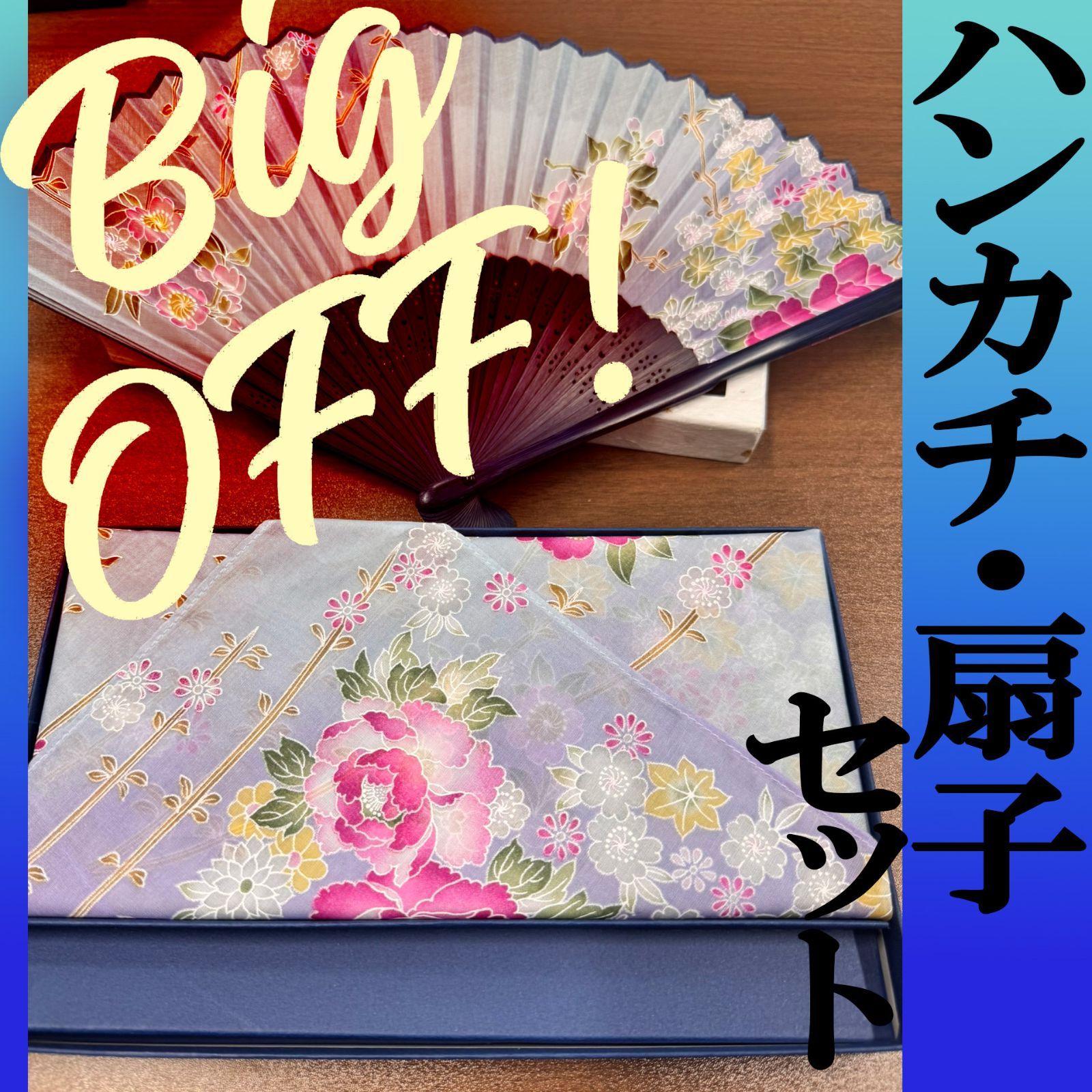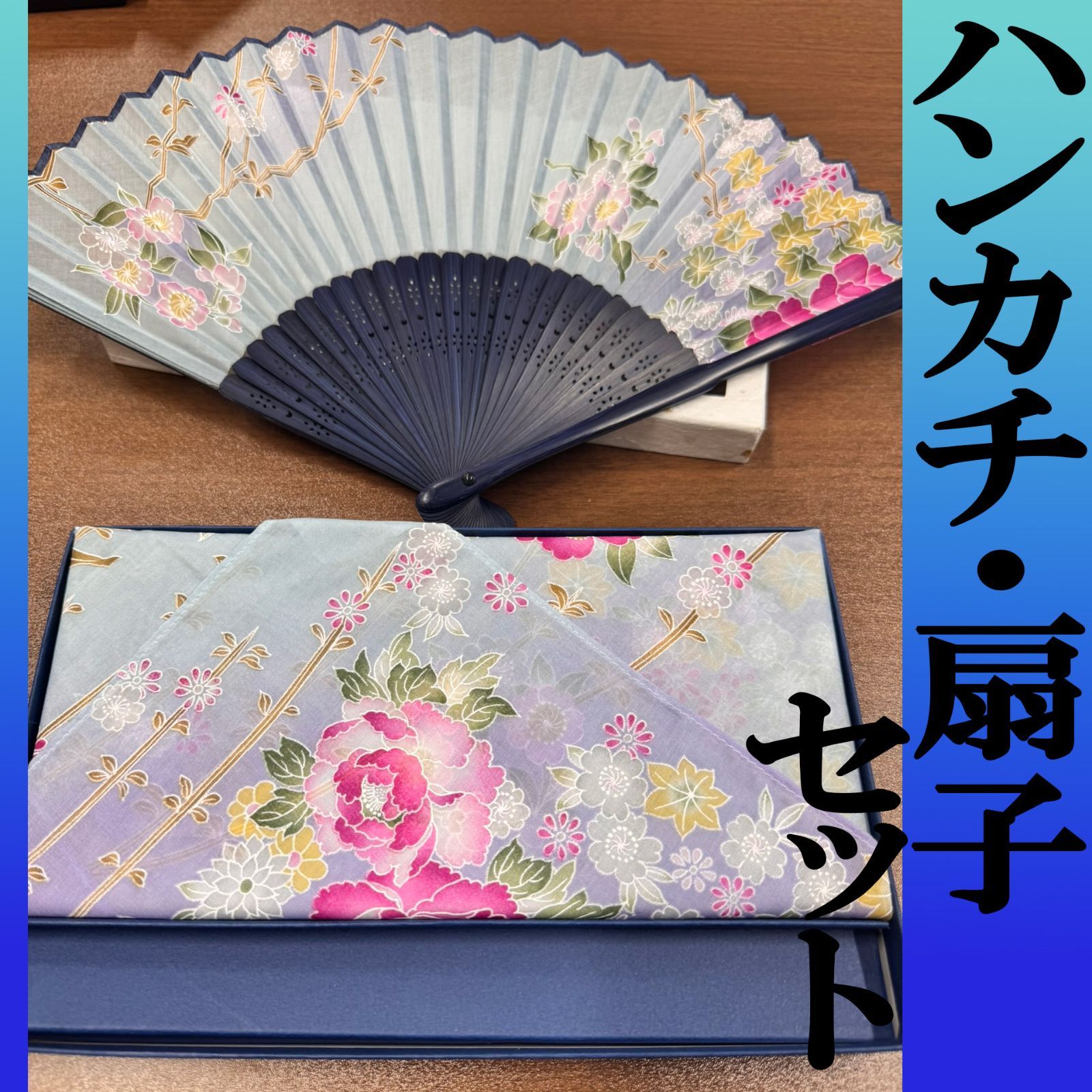 未使用品 和小物 ハンカチ&扇子のセット 花柄 水色と紫のグラデーション地に花模様柄 箱入り ①管2025020045