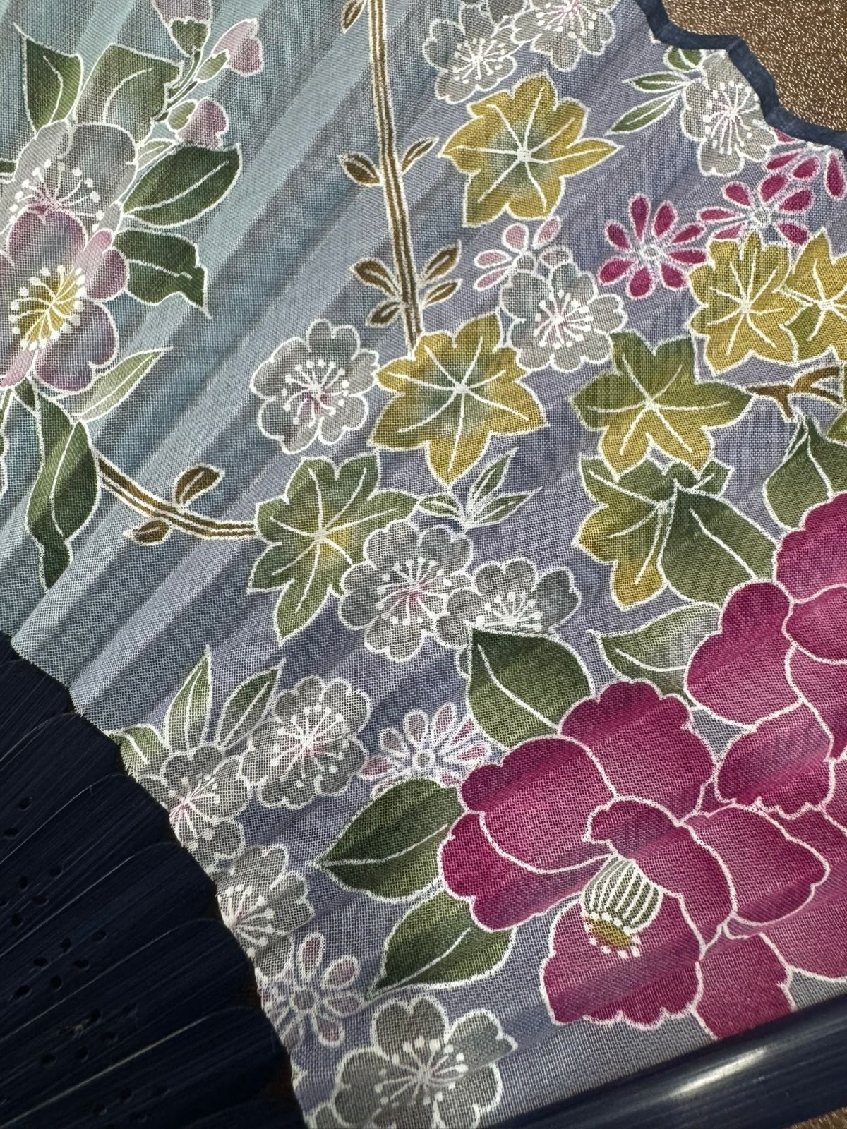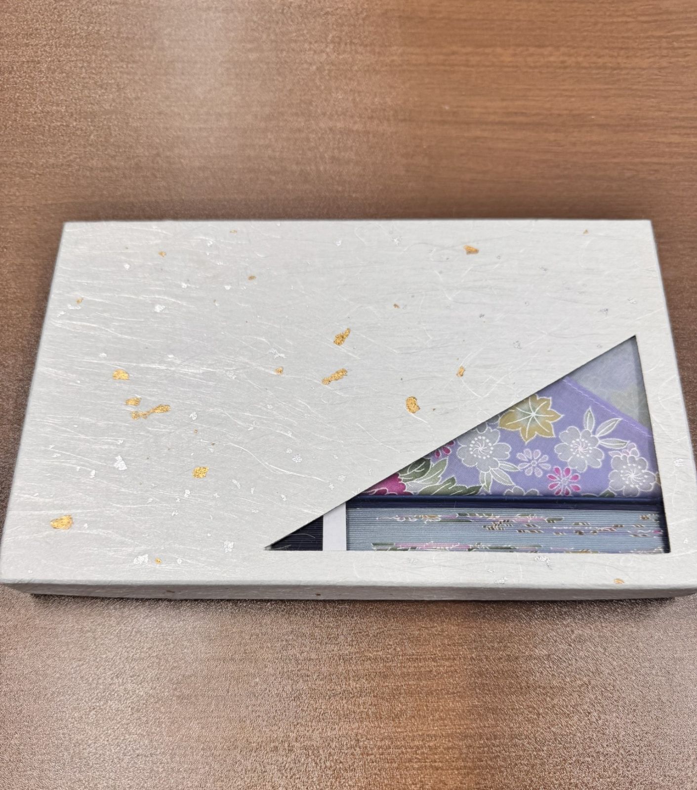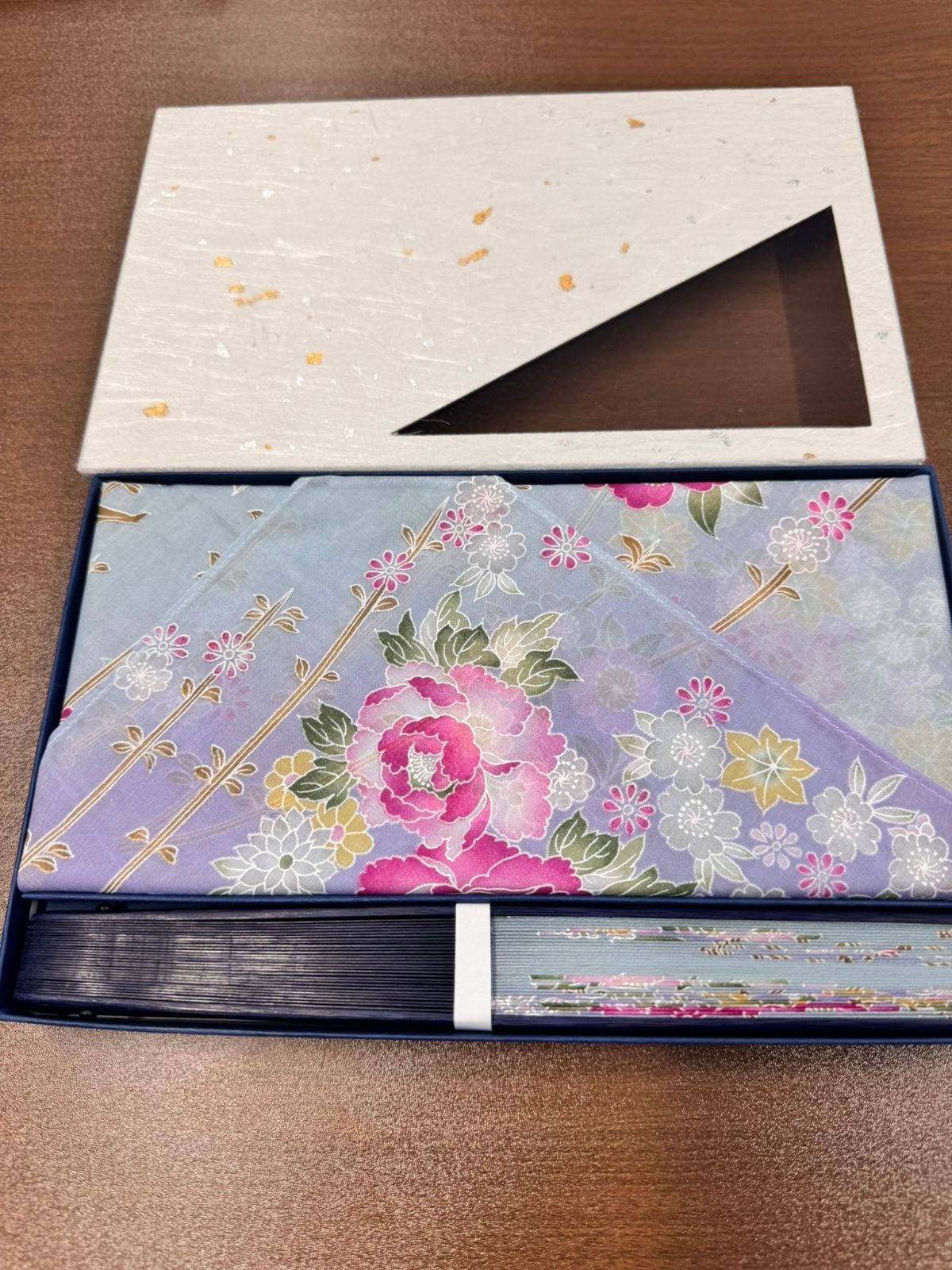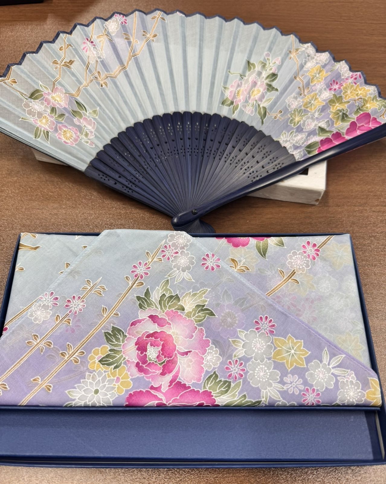 上品なデザインの箱入りの揃いのハンカチとセンスのセットです。