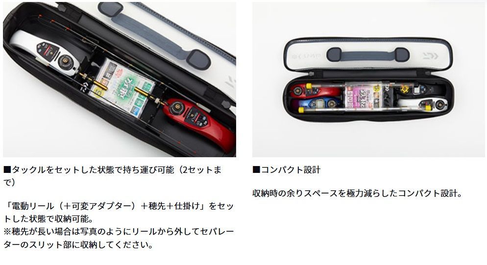 「電動リール(+可変アダプター)+穂先+仕掛け」をセットした状態で持ち運び可能(2セットまで)。