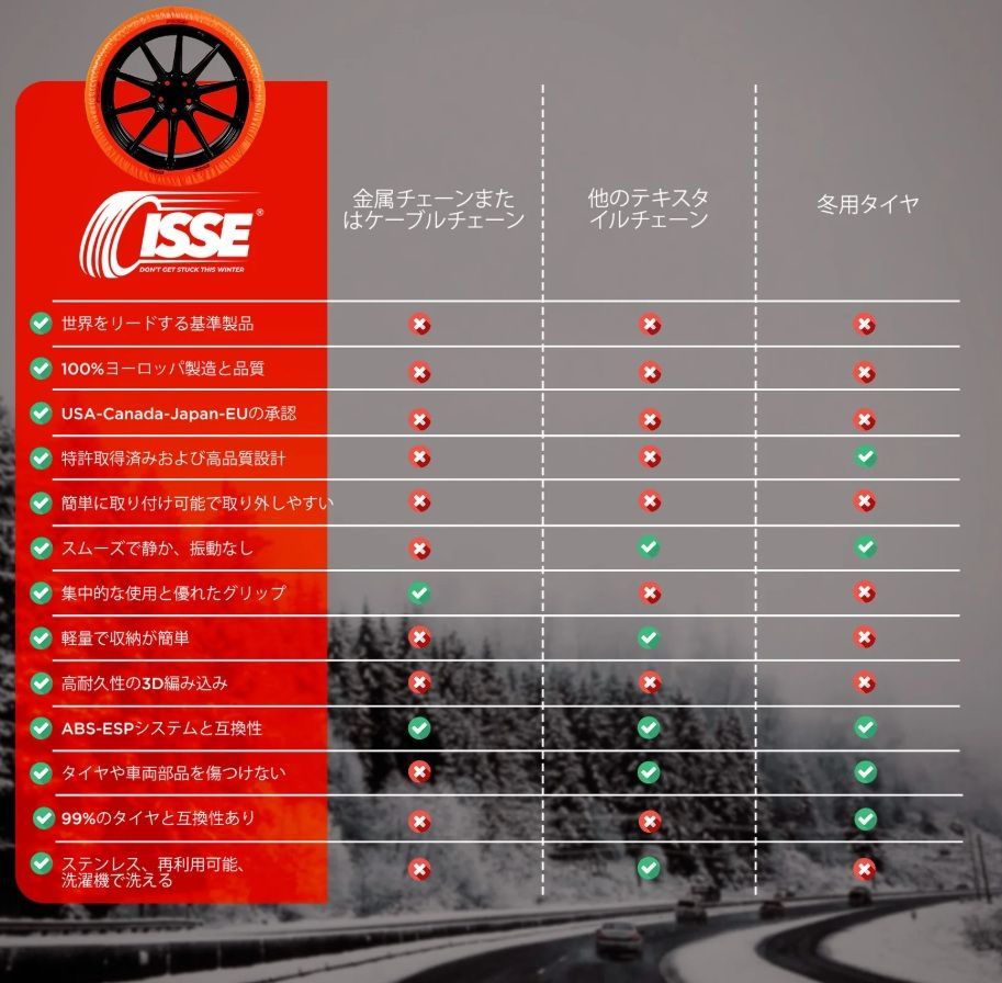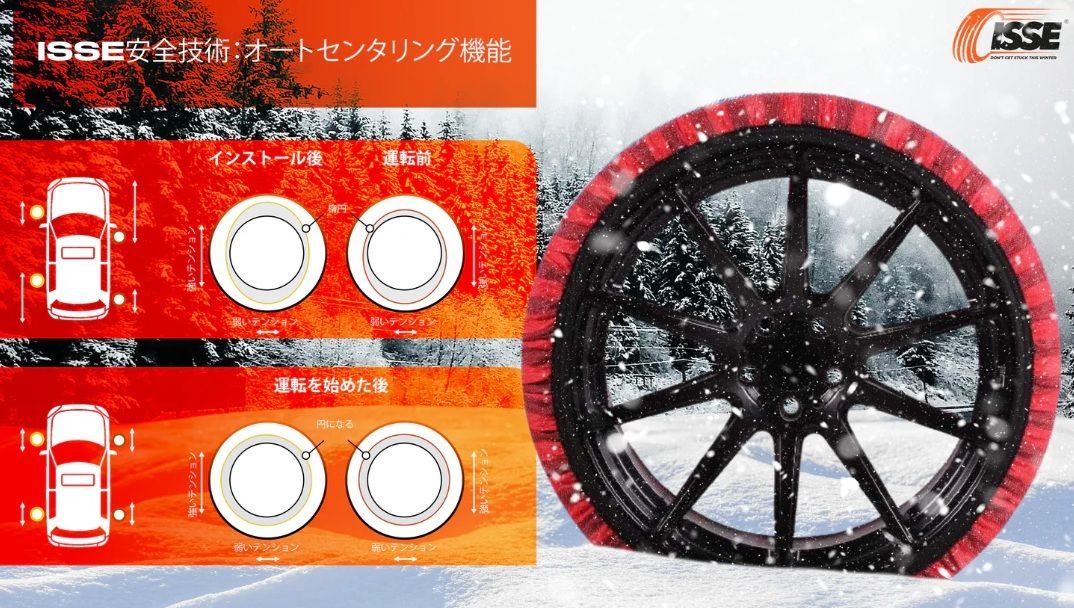 冬季ドライブ: イッセ・スノーソックスは冬のドライブを安全かつ快適にする強力なアイテムです。雪道や凍結路面でも優れたパフォーマンスで安定した運転をサポートします。