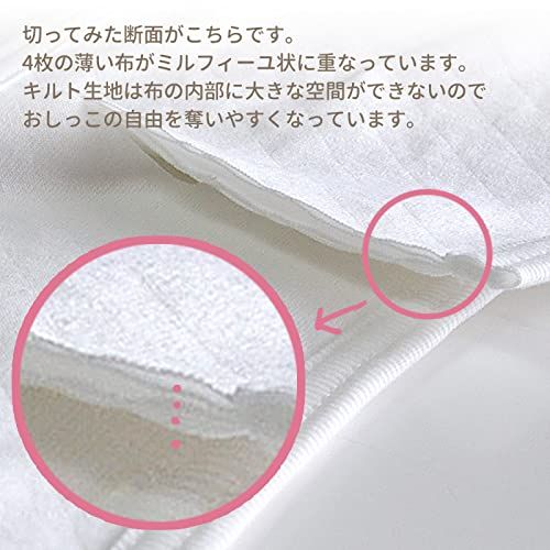 【おしっこが広がりにくい】4枚の薄い布がミルフィーユ状に重なっています。キルト生地は布の内部に大きな空間ができないので、布を重ねただけのおむつよりおしっこが広がりにくくなっています。