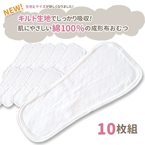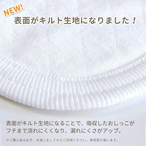【キルト生地でしっかり吸収】肌に優しい綿100%の成形布おむつです。表面がキルト生地になることで吸収したおしっこがフチまで流れにくくなり、漏れにくさがアップしました。