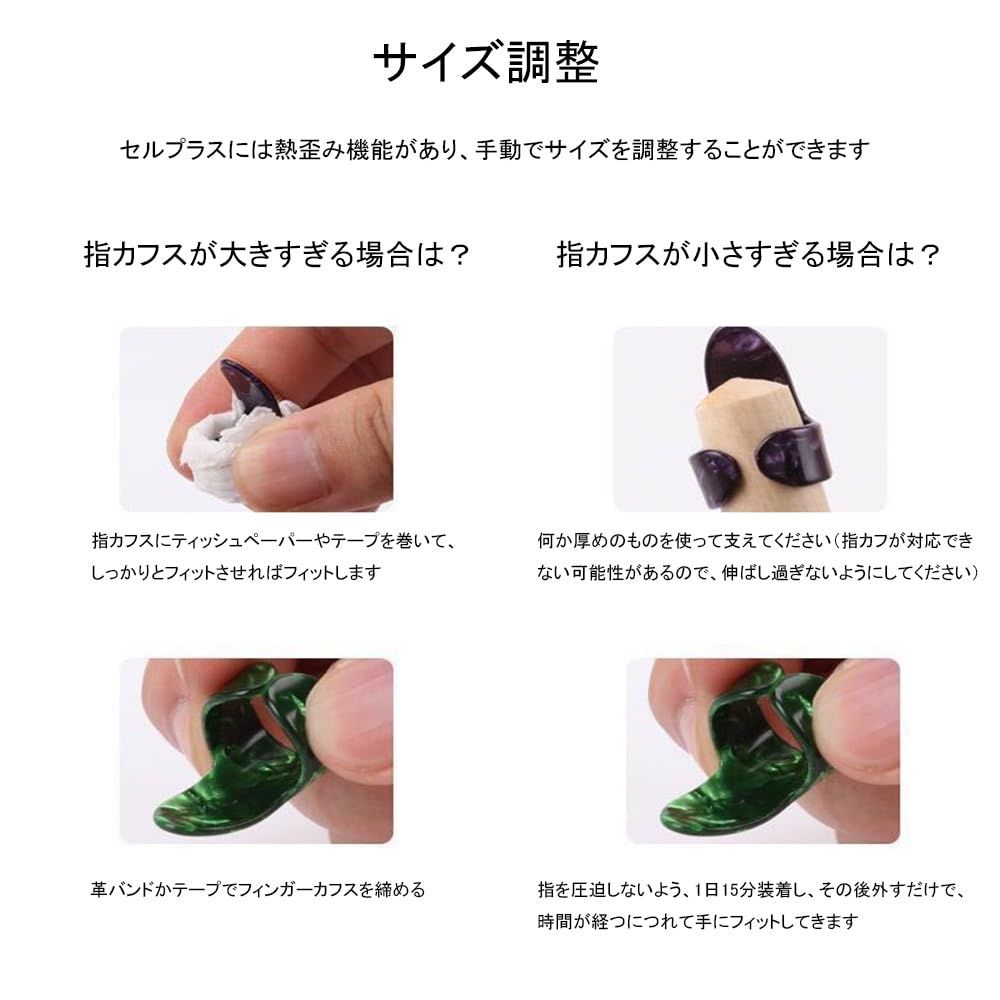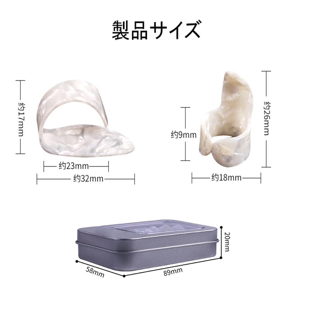 1.【製品の内容です】8個セット、親指ピック2個、人差し指ピック6個。親指ピック、約17×32mm(長さ×幅)。人差し指ピック、約18×26mm(長さ×幅)、2カラー。