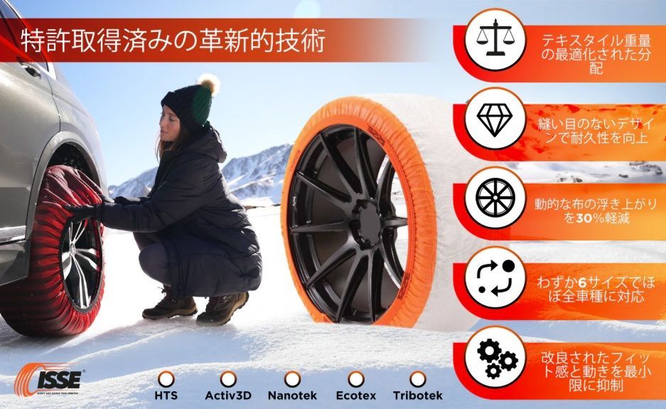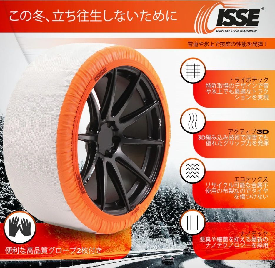 冬季ドライブ: イッセ・スノーソックスは冬のドライブを安全かつ快適にする強力なアイテムです。雪道や凍結路面でも優れたパフォーマンスで安定した運転をサポートします。