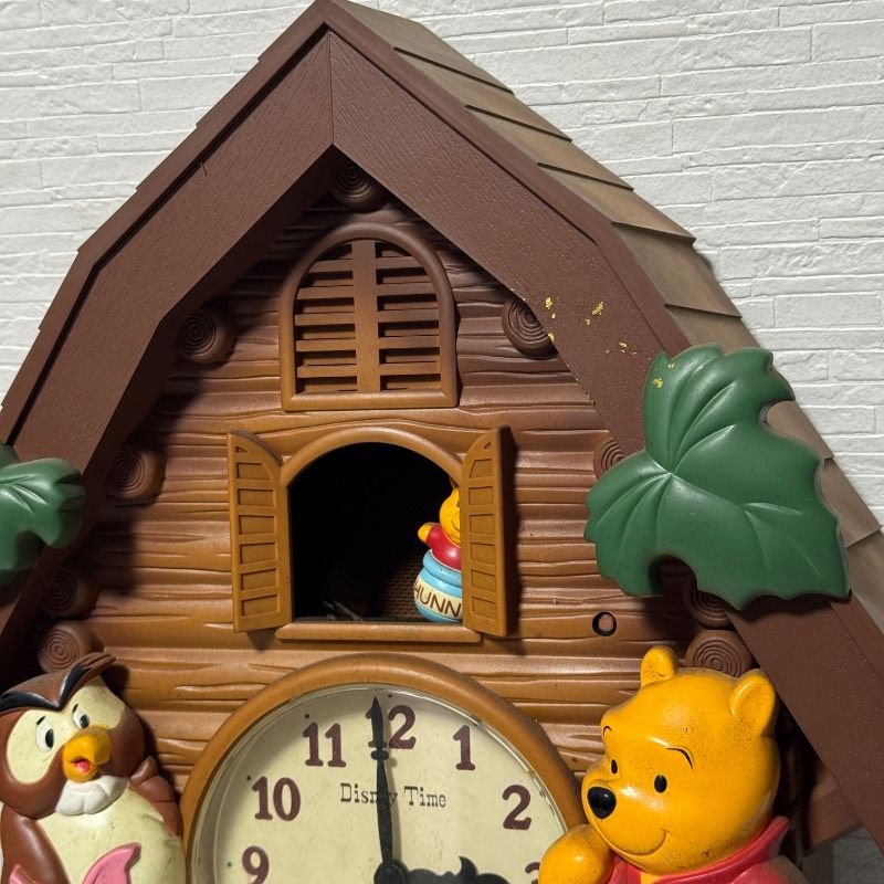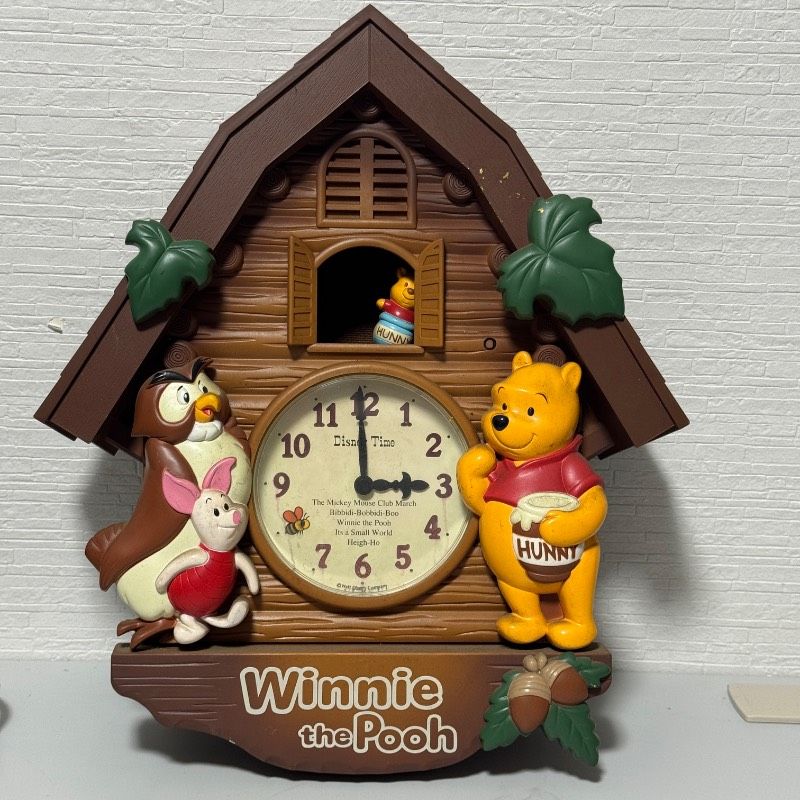 プーさん、ピグレット、オウルなどのキャラクターがデザインされた可愛らしい時計ですが、**【全体的に状態が悪いジャンク品】**としての出品です。