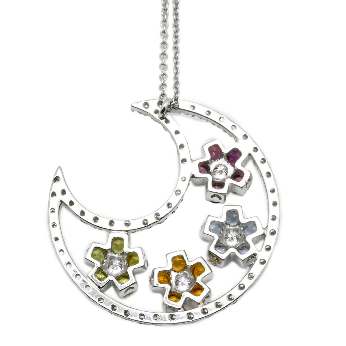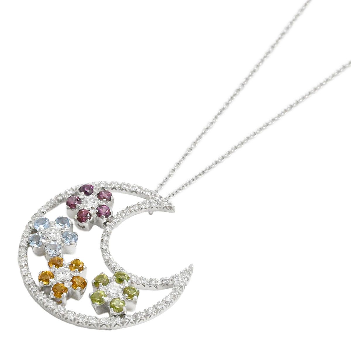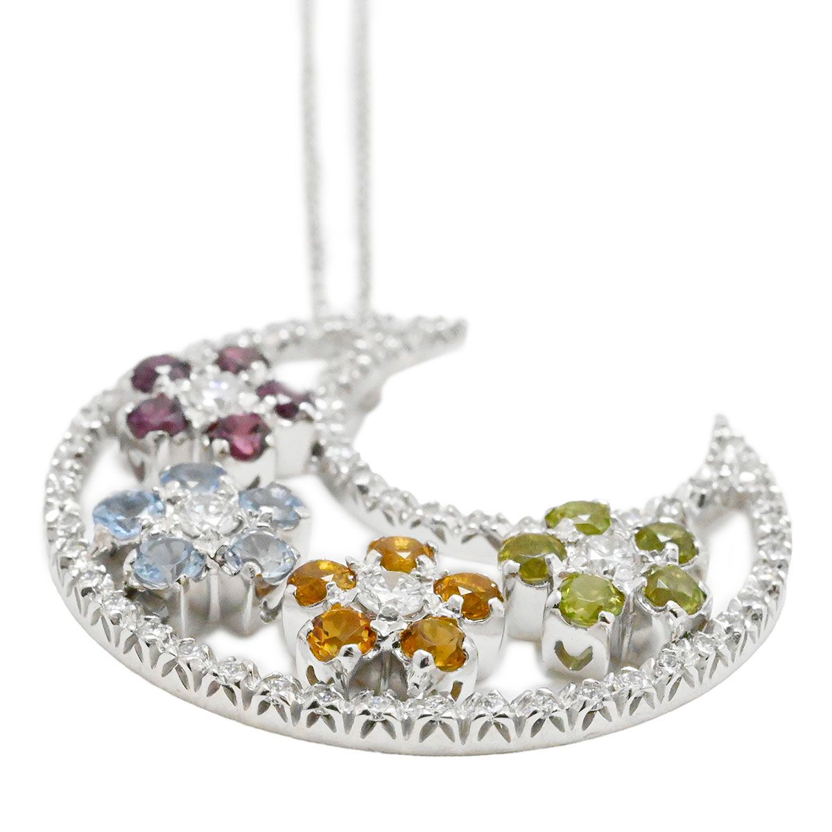 ムーンデザインにダイヤが施された枠に色とりどりのフラワーモチーフマルチカラーストーンが胸元を鮮やかに飾ってくれるゾッカイのエレガントなネックレスです。