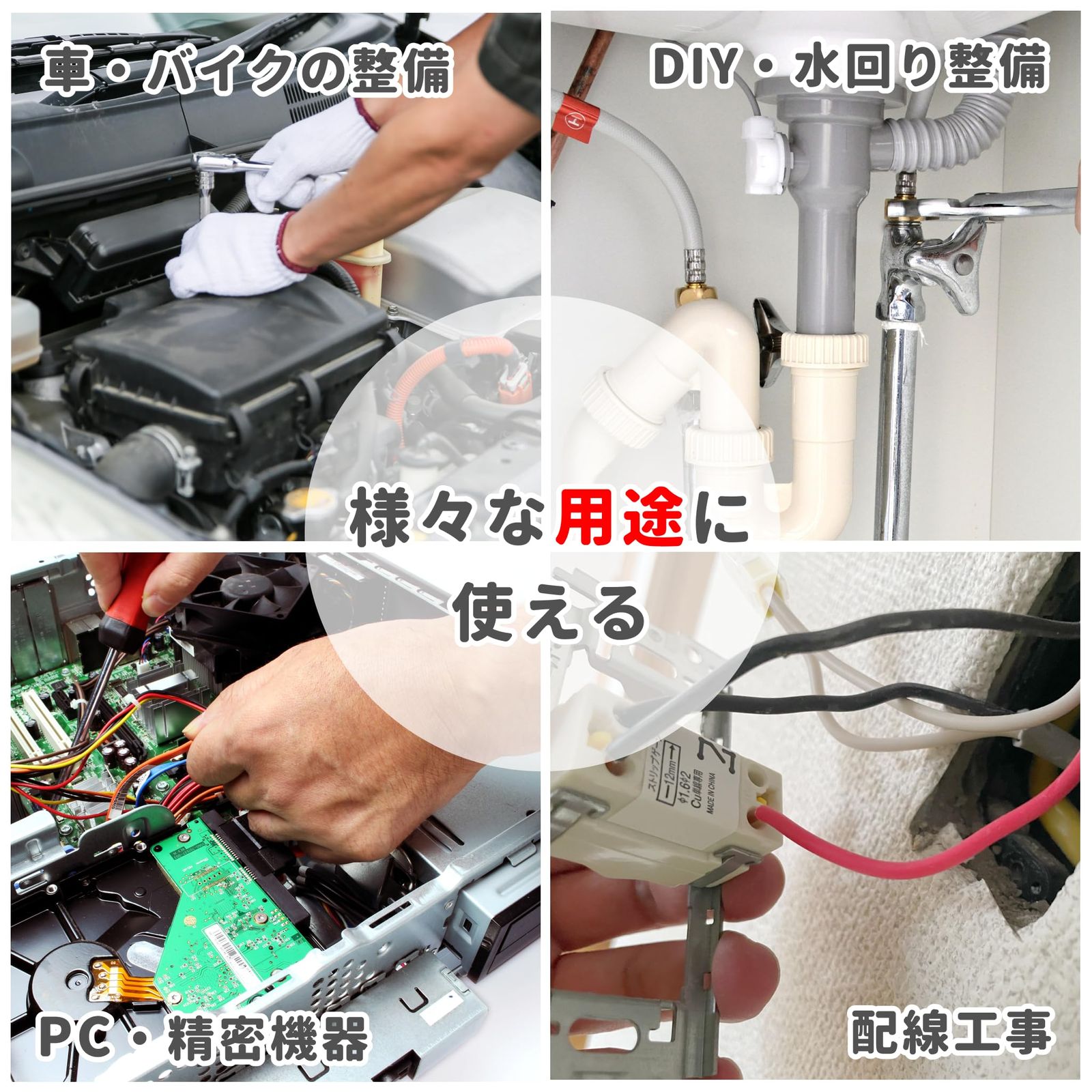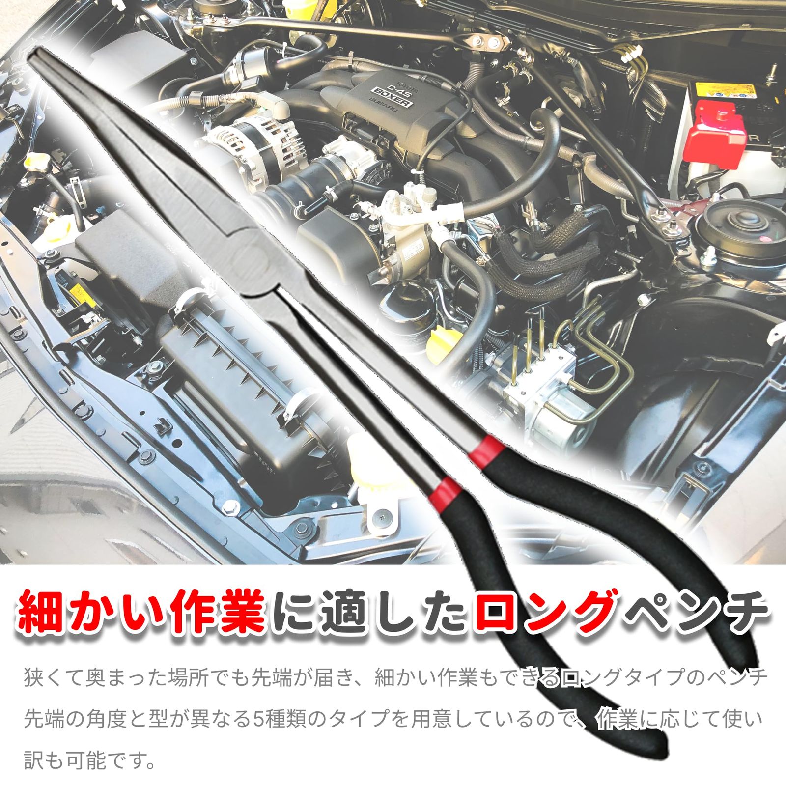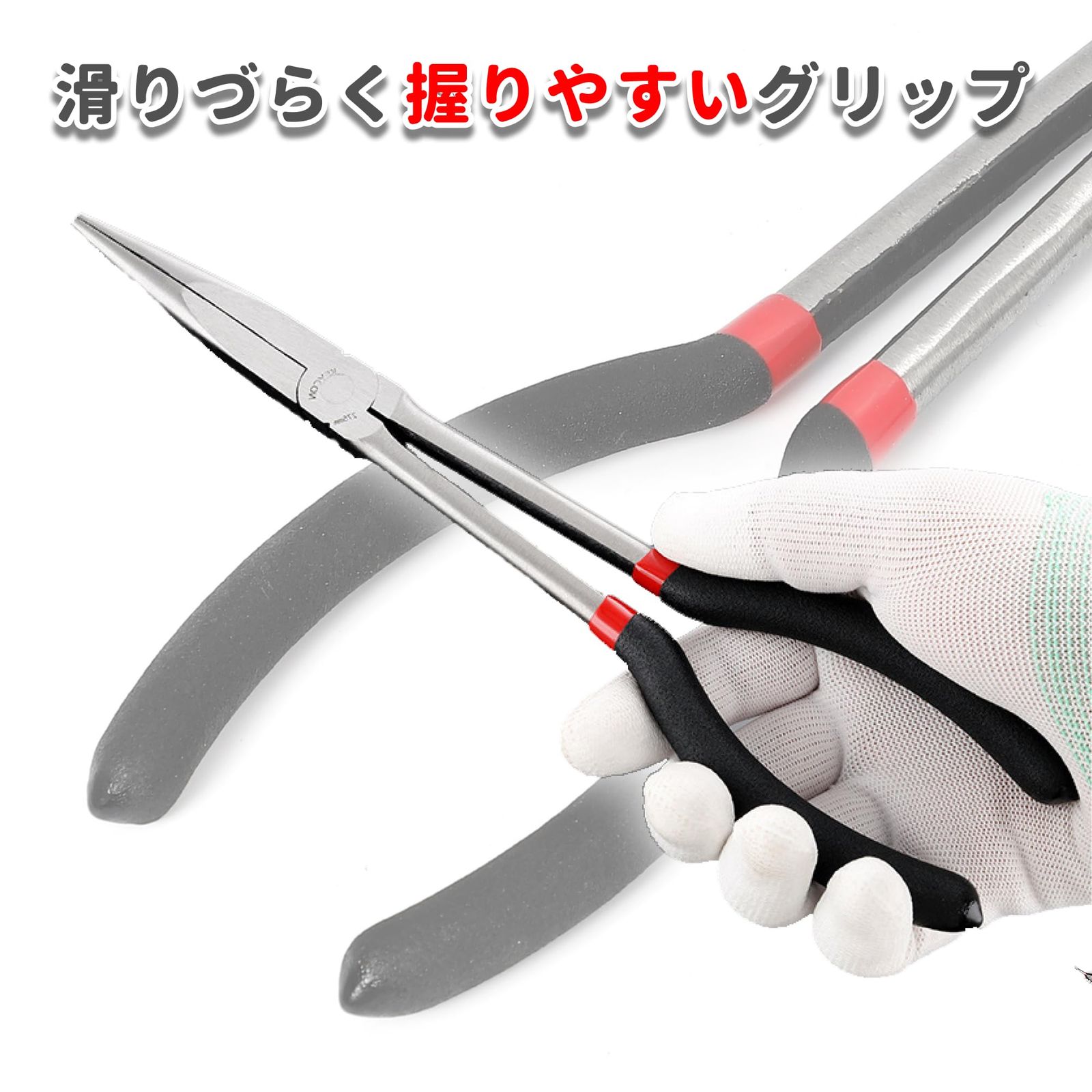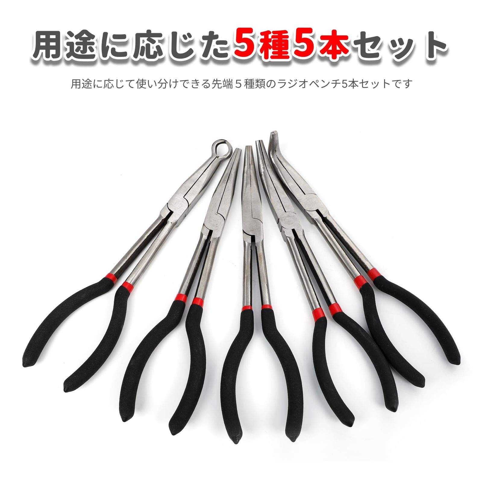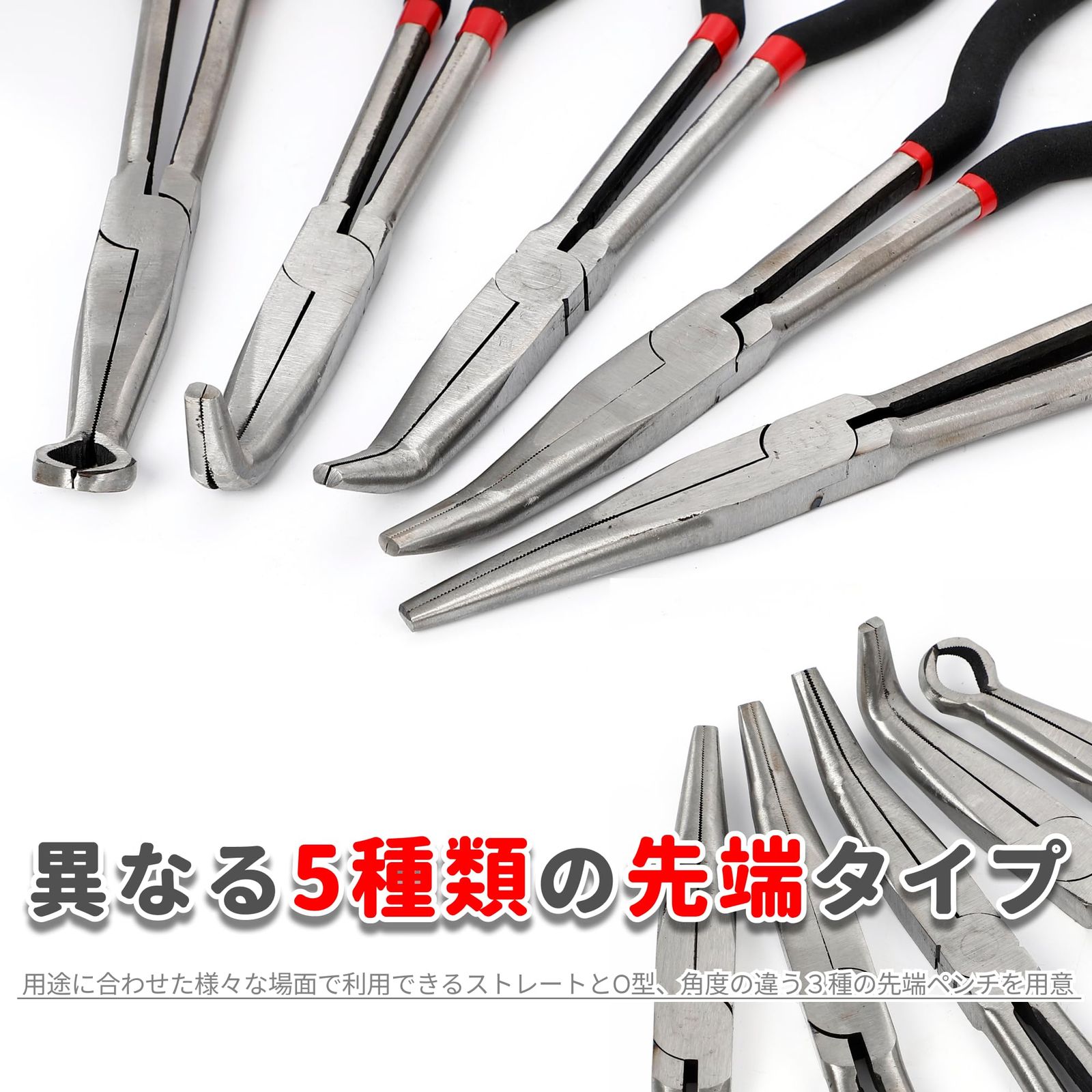 形状の違うプライヤーが5種類あるので、精密作業においても作業内容に応じて使い分けられ、作業効率は飛躍的に上がります。また、全長280mmの長いプライヤーですので、手の届かない狭く奥まった箇所でも、作業することができます。人間工学に基づいた設計がなされているので使いやすく、またグリップも滑り止めグリップ(ゴム・絶縁グリップ)を採用し、持ちやすいよう工夫されております。幅広い用途に利用できます。たとえば、自動車、オートバイ、自転車、機械などの修理・整備のとき、パソコンをカスタマイズするとき、アクセサリーやオブジェなどの小物をハンドメイドするときにもご利用いただけます。