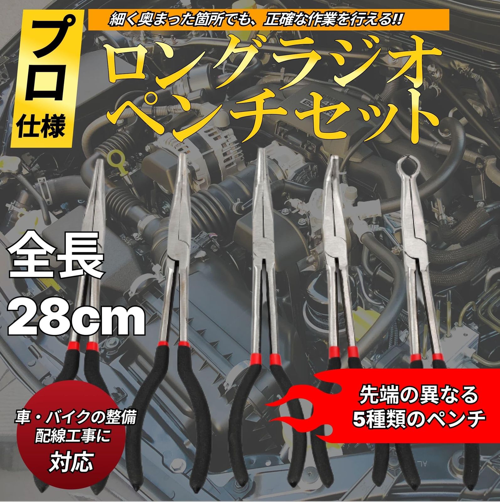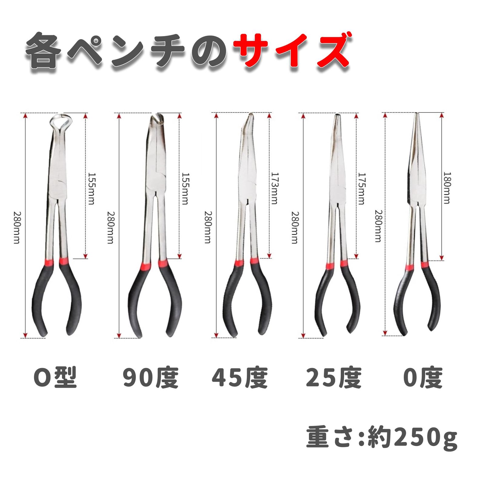 重さ:約250g【商品の特徴】形状の違うプライヤーが5種類あるので、精密作業においても作業内容に応じて使い分けられ、作業効率は飛躍的に上がります。また、全長280mmの長いプライヤーですので、手の届かない狭く奥まった箇所でも、作業することができます。人間工学に基づいた設計がなされているので使いやすく、またグリップも滑り止めグリップ(ゴム・絶縁グリップ)を採用し、持ちやすいよう工夫されております。幅広い用途に利用できます。たとえば、自動車、オートバイ、自転車、機械などの修理・整備のとき、パソコンをカスタマイズするとき、アクセサリーやオブジェなどの小物をハンドメイドするときにもご利用いただけます。【注意事項】