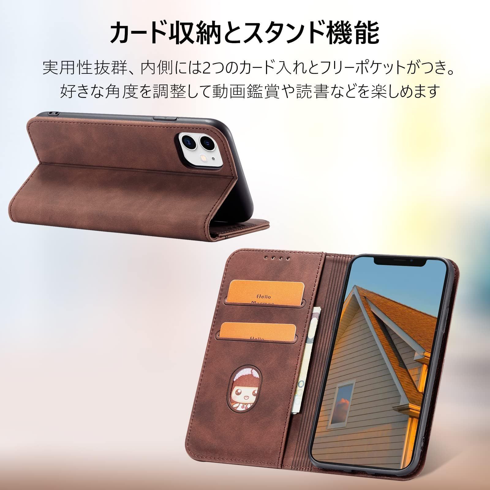 ★【カード収納とスタンド機能】iPhone 12プロ 手帳ケース動画視聴に便利なスタンド機能が付き、横向いて斜めに立てて、お好きな角度を調整でき、両手が解放され、お気軽に読書やビデオの観賞を楽しむことができます。内側には2つのカード入れとフリーポケットがつき、名刺や定期券の収納に優れているアイフォン12 プロケースです。