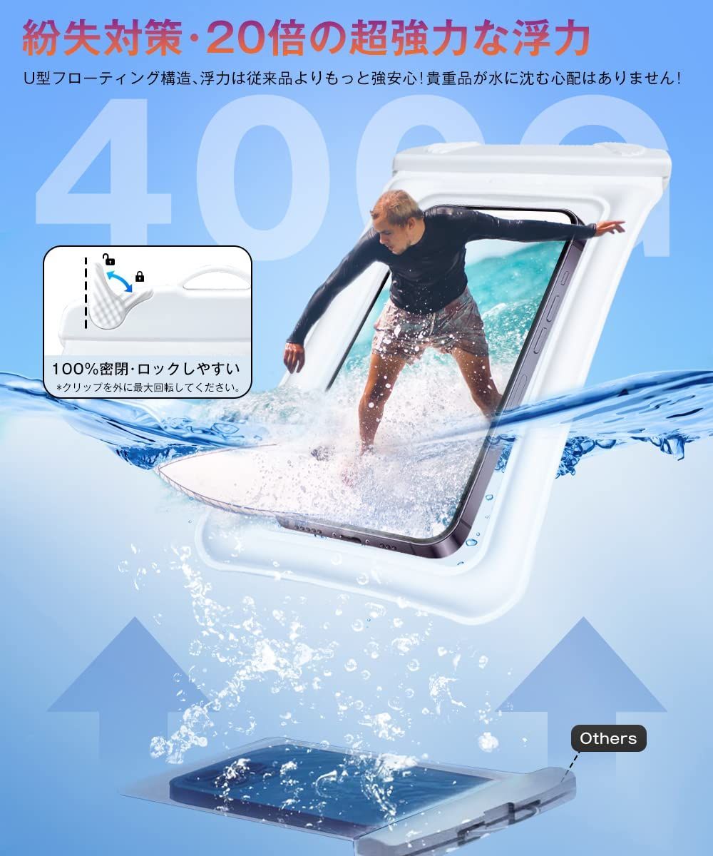 【紛失・衝撃に安全対策!20倍の超強力な浮力】スマホ防水ケースは、背面に水に浮くふわふわの「エアクッション構造」を搭載して、または柔軟で高密度のスポンジを内蔵して20倍の超強力な浮力を提供し、400グラムの浮力に耐えられます!万が一海などで落としてしまっても、スマホの重みで沈む心配がありません。さらに、通常の防水カバーよりも耐衝撃性に優れています。フローティング構造が落下などの衝撃を分散・吸収して本体に伝えなくなり、砂やホコリなどが直接触れることがありません。高い耐衝撃性を誇り、スマホを全方位からしっかりと守ります。PS:浮力受容範囲400以下グラムくらい、受容範囲を超えて浮かべない場合がございます。