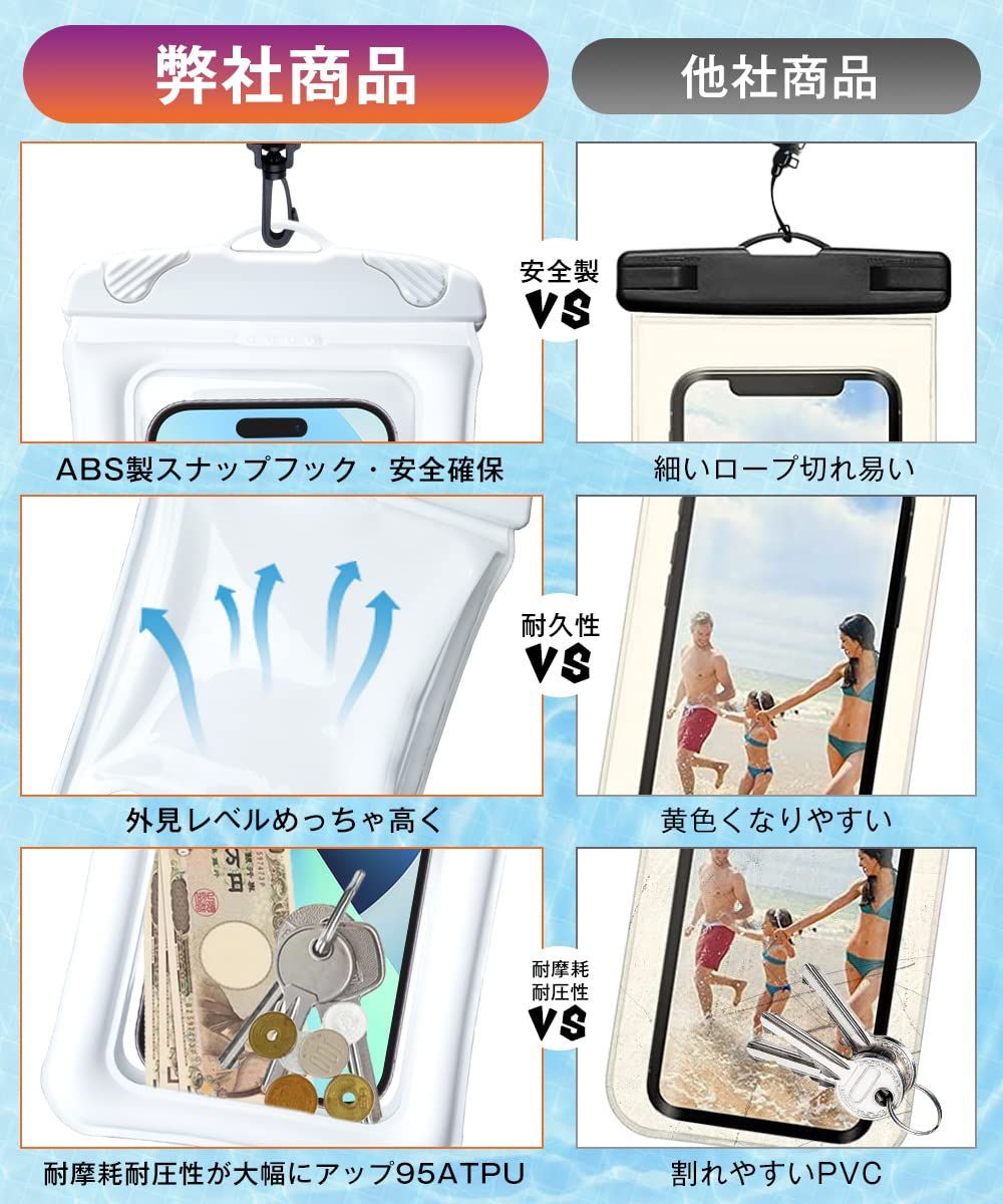 【出し入れ簡単&ネックストラップ付き】頑丈さをアップして、いつでもちょうどいい柔らかさと高感度で、濡れたとしても液晶面がしっかりタッチできます。破れ易いPVC製品よりペラペラ感から解放され、滲みを有率的に抑えて、出し入れにもより楽にできます。首からかけられる専用ストラップを付属し、海水浴やプールなどでも両手が自由になりスマホの持ち運びも楽々♪スマホ 防水ケースは一年中使えて、夏以外でも大活躍するんです。