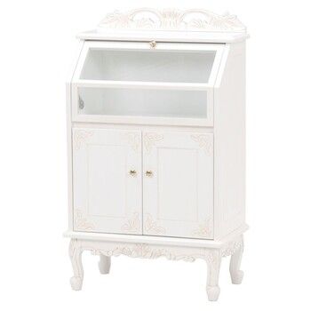 引き出しの上はガラス張りで見せる収納ができるアンティーク風ガラスキャビネット。