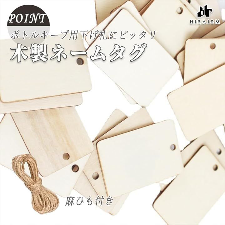 麻ひも付きでシンプルでナチュラルなデザインが特徴で、木製の素材感が温かみのある雰囲気を演出し、さまざまな用途に使いやすいです。