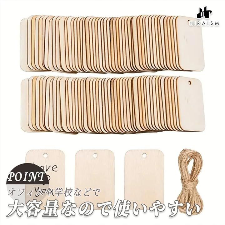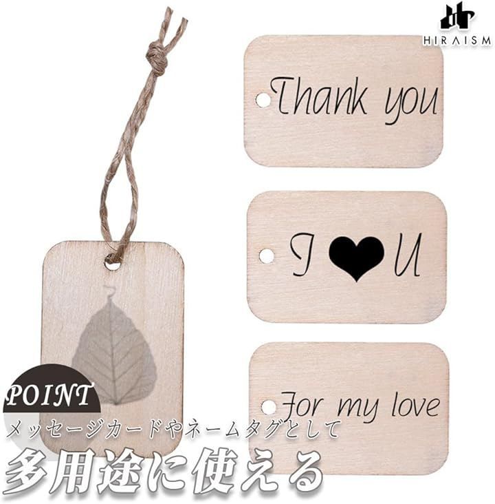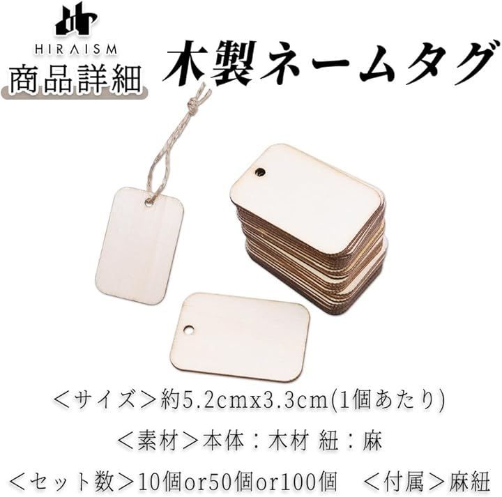 「商品内容」木製ネームタグ <サイズ>約5.2cmx3.3cm(1個あたり) <素材>本体:木材 紐:麻 <セット数>10個or50個or100個 <付属>麻紐
