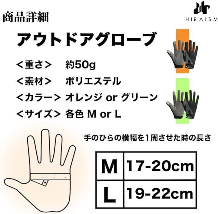 「商品内容」アウトドアグローブ <サイズ>M:約17-20cm L:約19-22cm <重さ> 約50g <素材>ポリエステル <カラー>オレンジ or グリーン *製造時期により多少デザインが異なる場合があります。