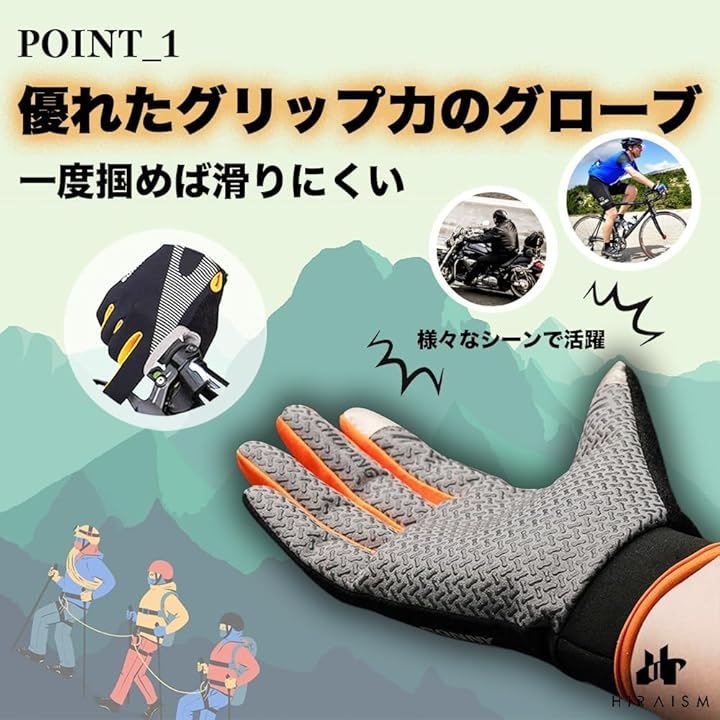 「一度掴めば滑りにくい、優れたグリップ力のグローブ」手のひら部分から指先まで満遍なく滑り止め加工が施されており、トレッキングポールや岩場でもしっかり握れる設計で安全性をサポートします。