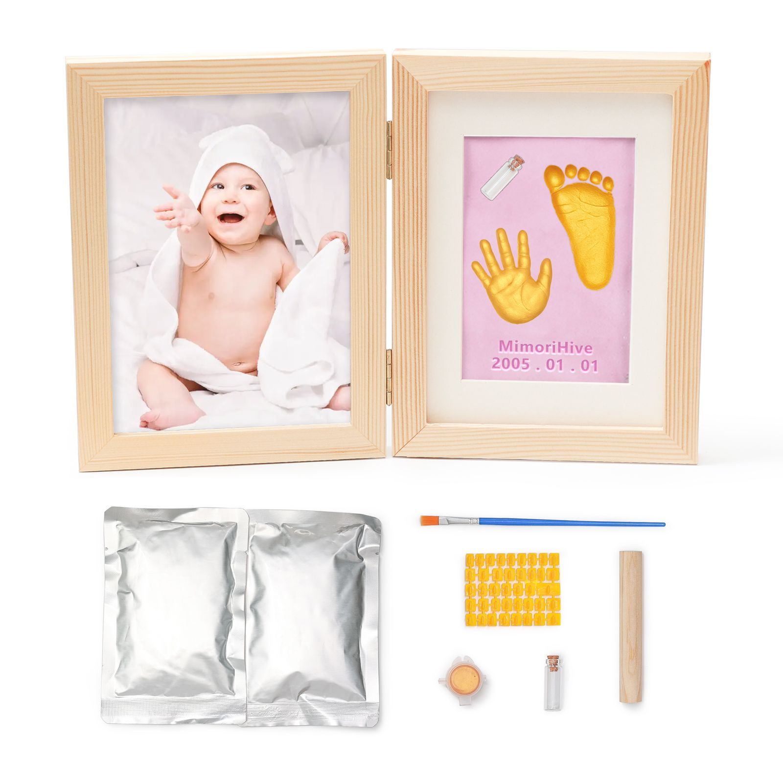 金色のパウダーも付属しており、手形や足形をゴールドに装飾することも可能。シンプルにも華やかにも仕上げられる楽しさがあります。