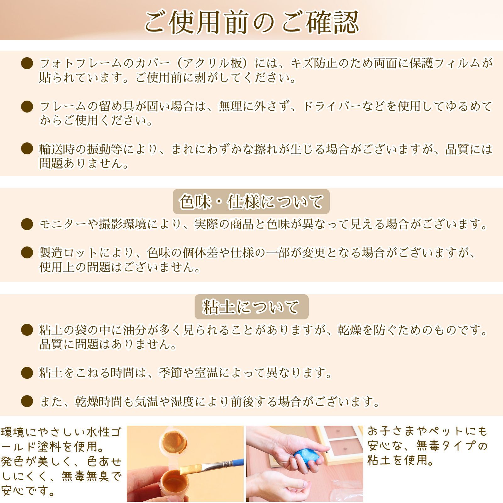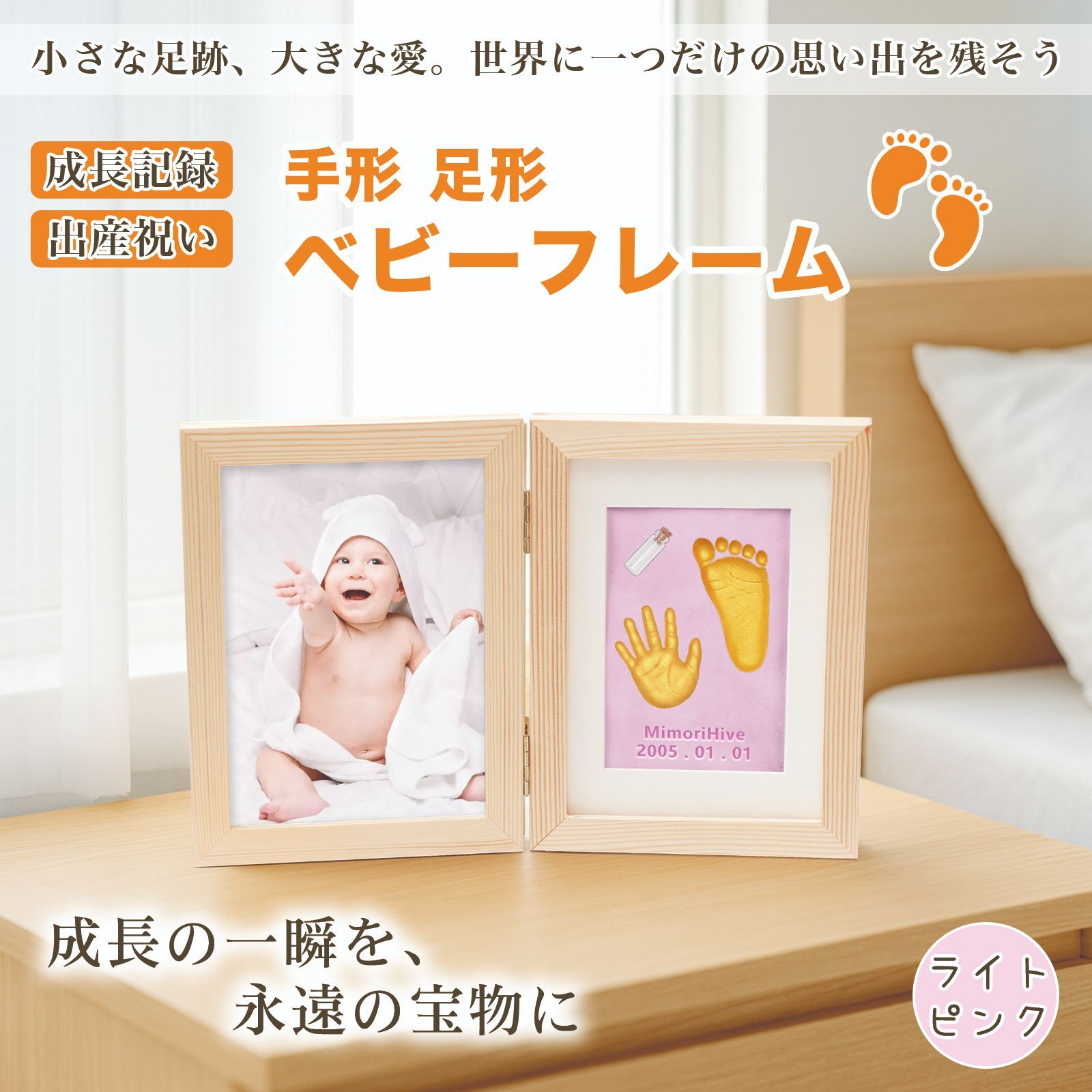 お気に入りの写真と、粘土で作った手形・足形の両方を飾ることができ、成長の記録や大切な瞬間を永遠に残せます。
