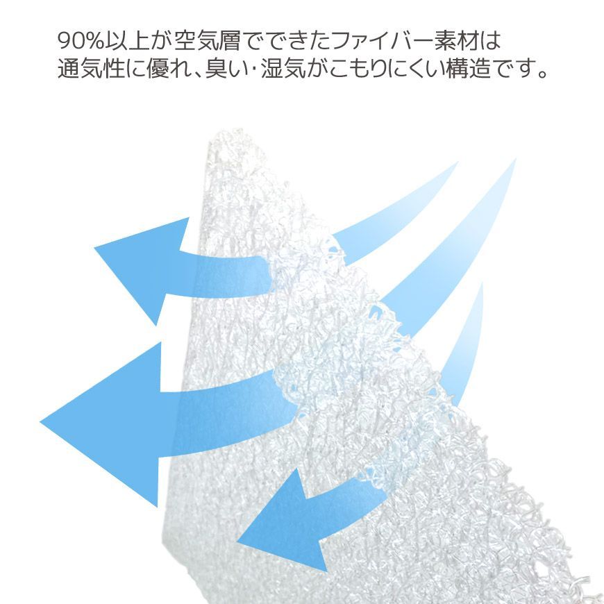 90%以上が空気層でできているファイバー素材は通気性に優れ、使用時のムレを軽減。