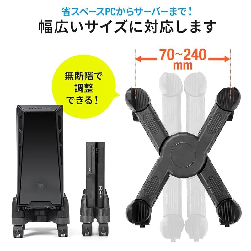 横幅70~240mmのパソコン本体の設置に対応したPCスタンドです。幅70~240mm間で無断階で横幅を調整できるので、スリムタワーからワイドタワーまで設置可能です。