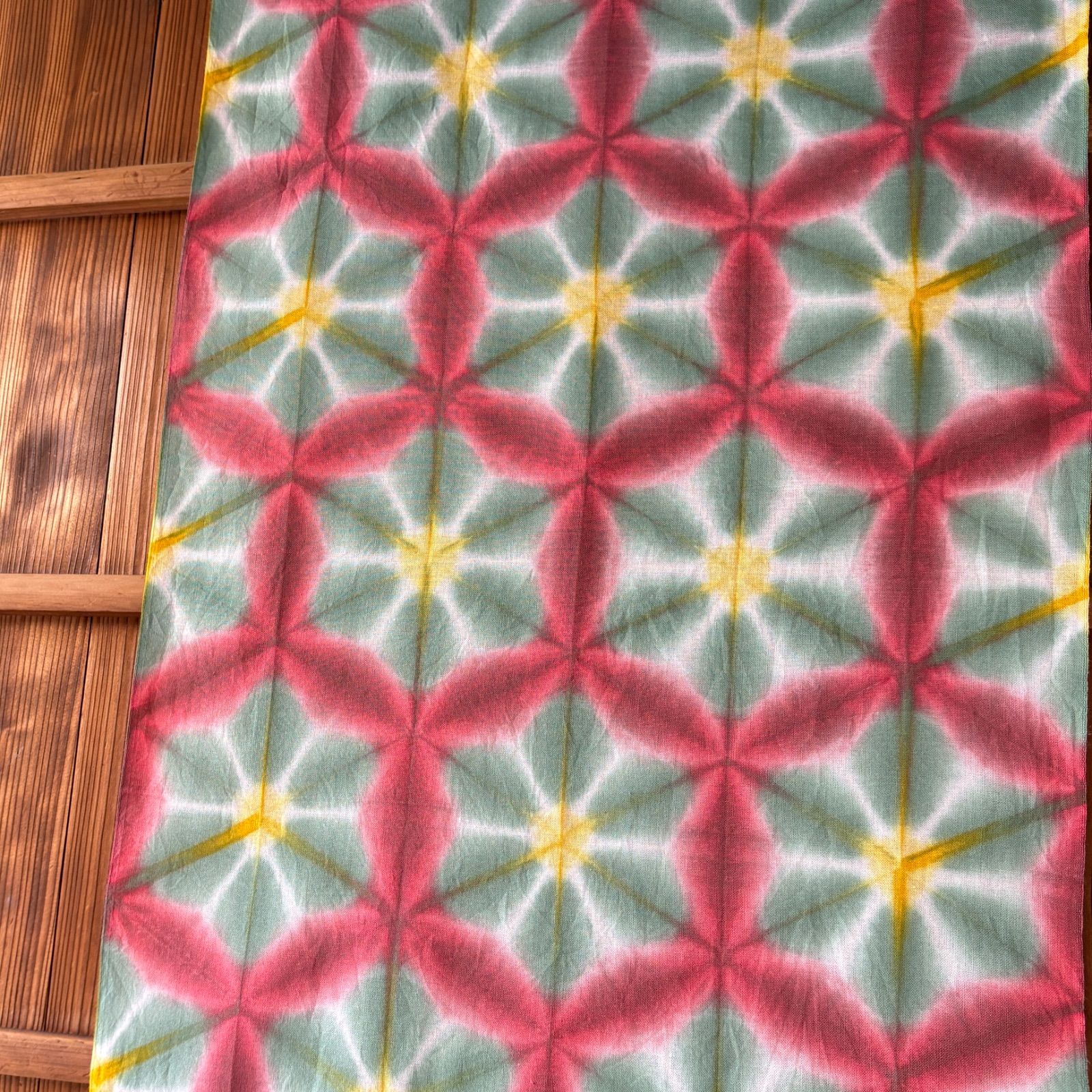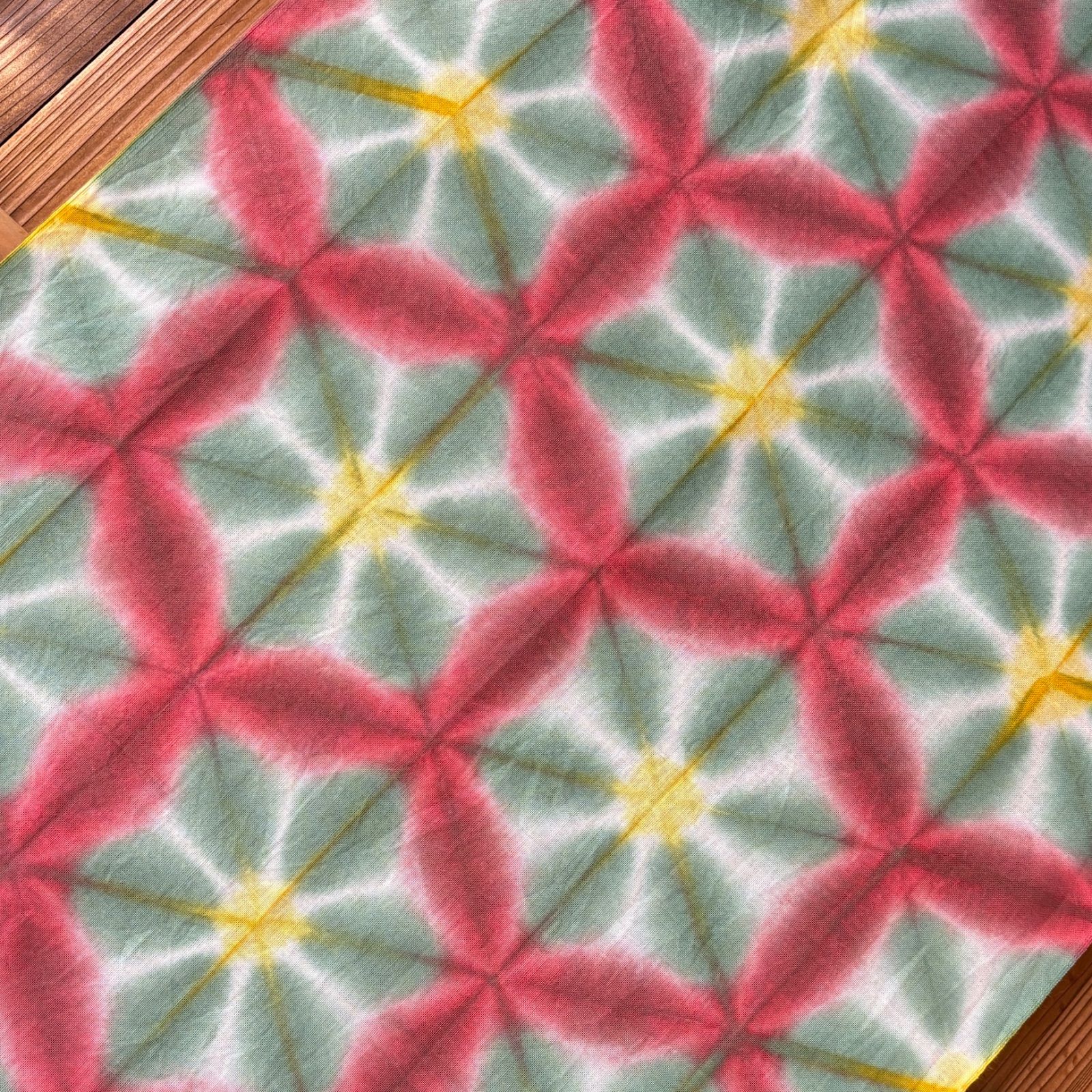 赤、緑と黄色での雪花絞り。