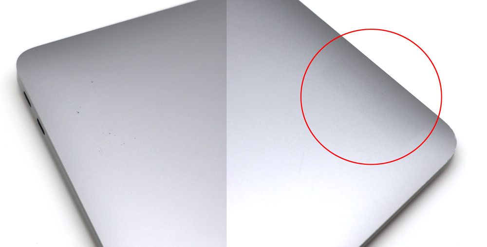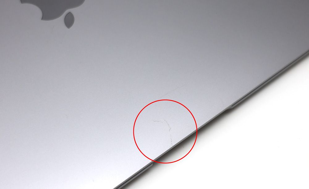 天板部分に2cm程度の目立つ引っかきキズと、一部にシール跡のような変色が見られます。