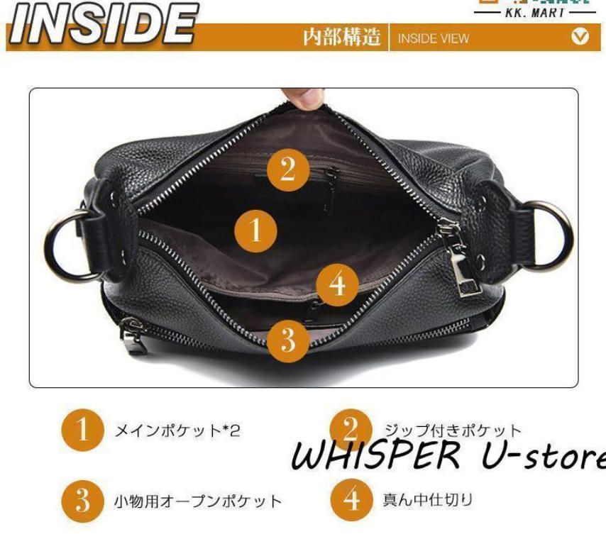 ■ポケット 内側:メインポケット*1、小物用オープンポケット*1、ジップ付きポケット*1、真ん中仕切り*1